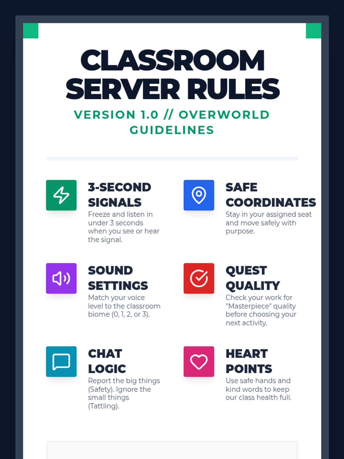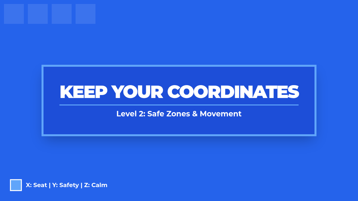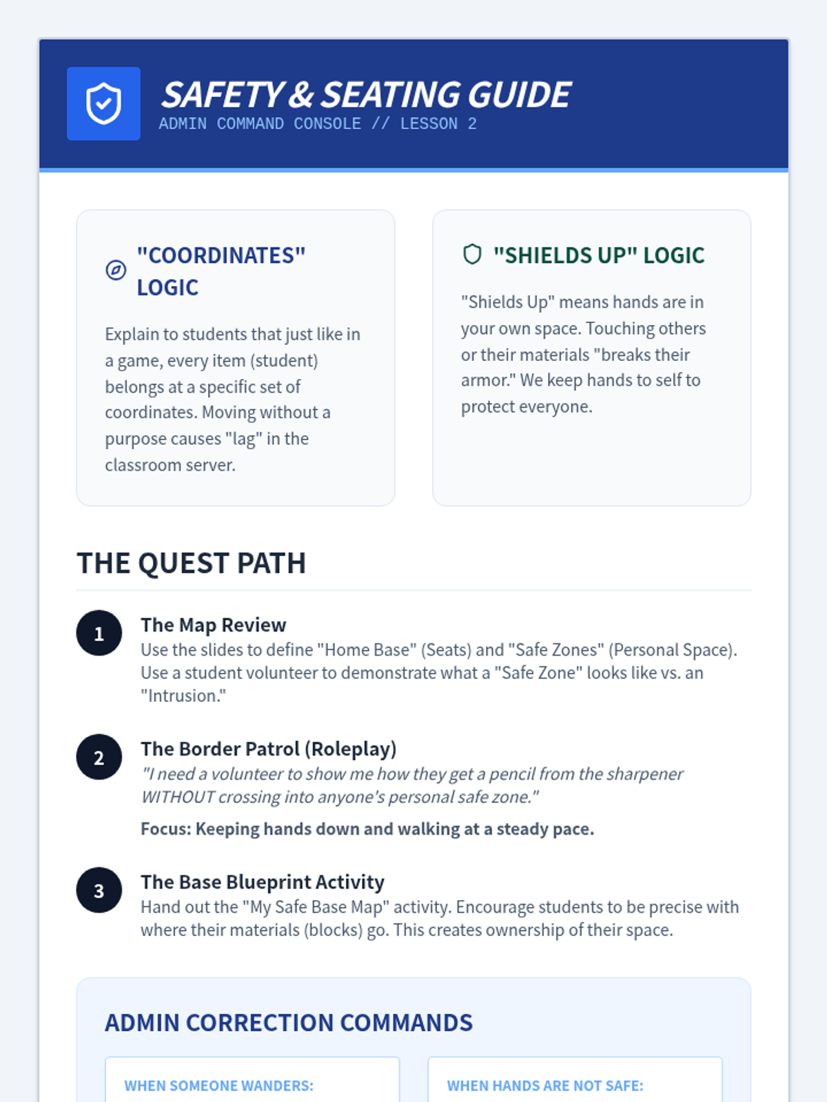 Focuses on classroom movement, staying in assigned 'coordinates' (seats), and maintaining 'safe zones' by keeping hands to oneself. Students learn that safe movement keeps the 'server' from crashing.