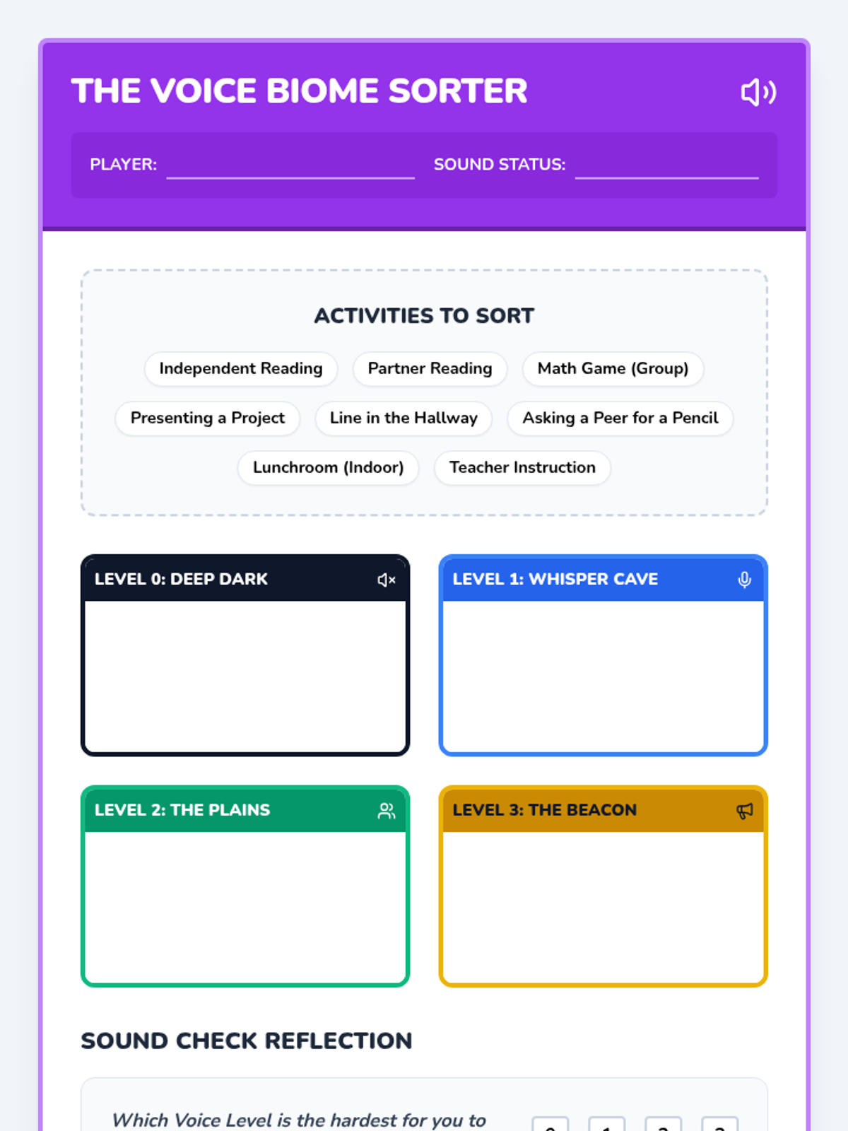 Teaches students to adjust their voice volume based on the classroom 'biome' (activity). Covers Level 0 (Silent), Level 1 (Whisper), Level 2 (Partner), and Level 3 (Presentation).