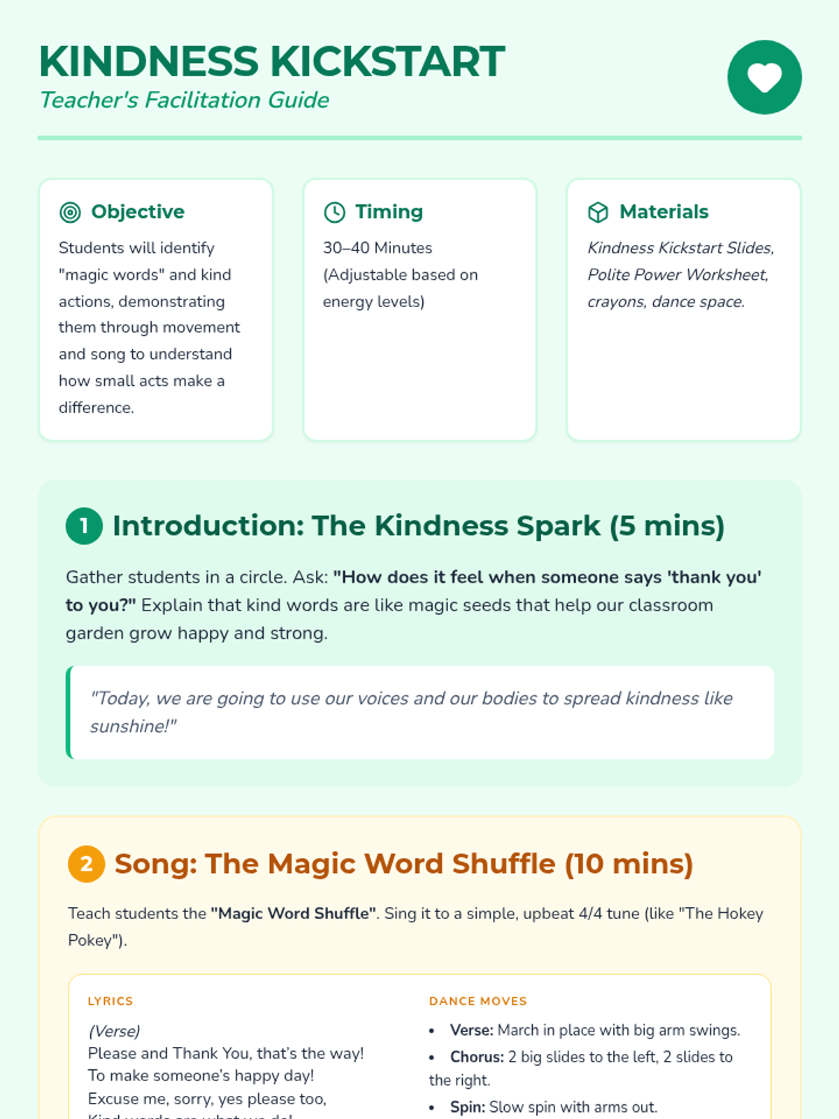 An active, song-filled lesson for kindergarteners focused on using polite words and kind actions to make a difference in their classroom and community.