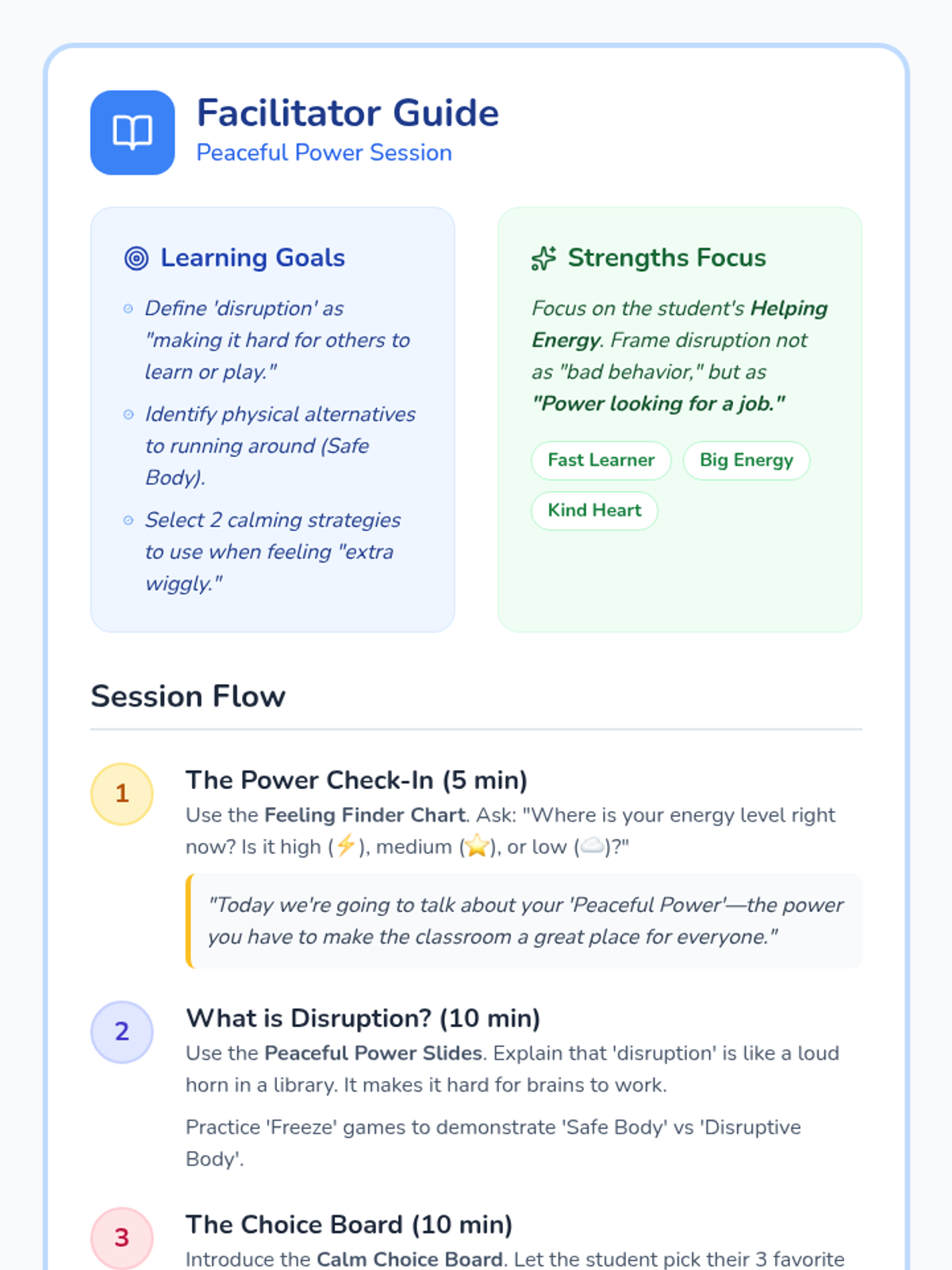 A social work session designed for kindergarteners to understand 'disruption' and learn self-regulation strategies through a positive, strengths-based approach. Students explore calming techniques and alternatives to disruptive behavior while tracking their progress.