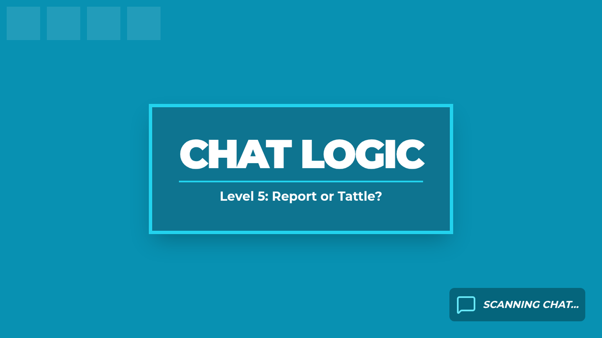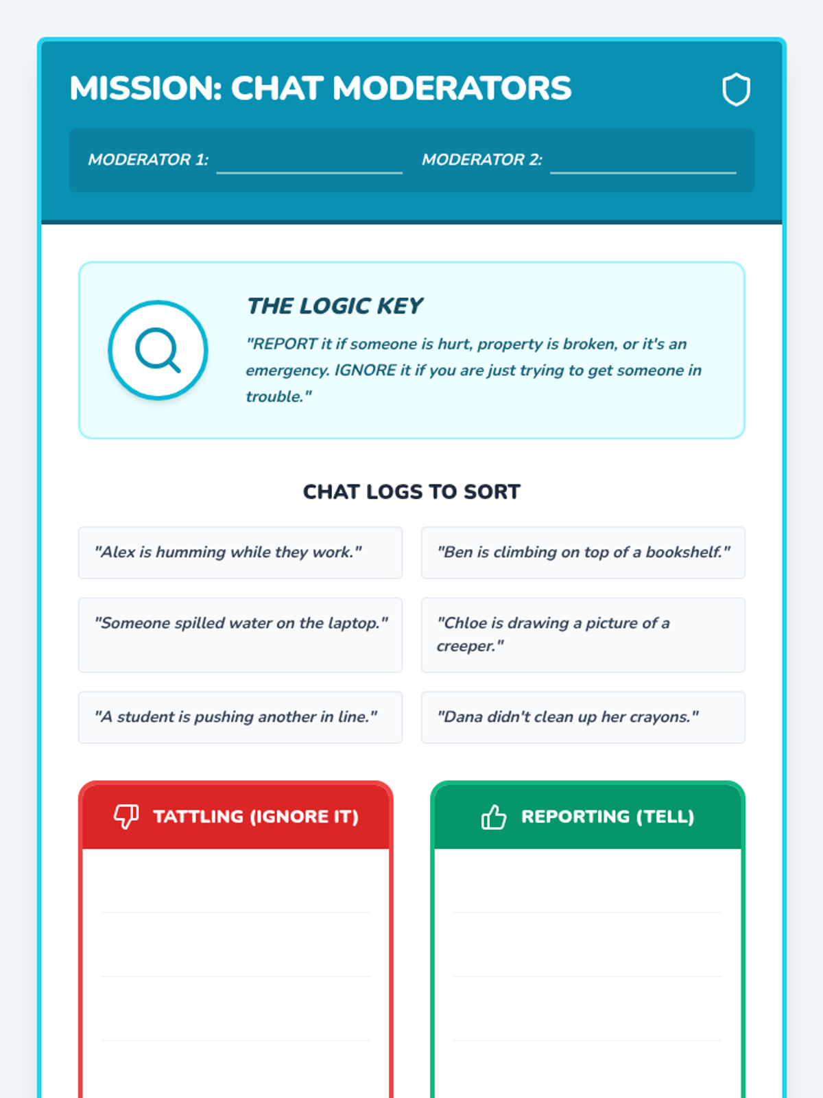 Teaches students the difference between tattling (trying to get someone in trouble) and telling (trying to keep someone safe). Uses 'Chat Logic' to help students decide when to report an issue.