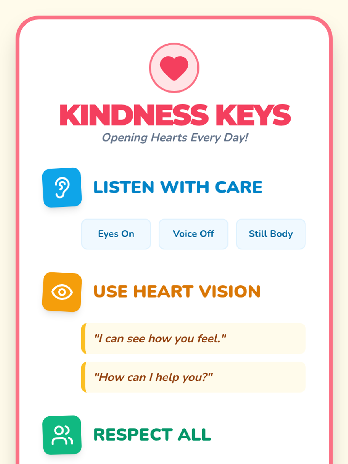 Teaches students that kindness and 'safe hands' are the 'Heart Points' of the classroom. Focuses on kind words, sharing resources, and helping others to build a strong community.