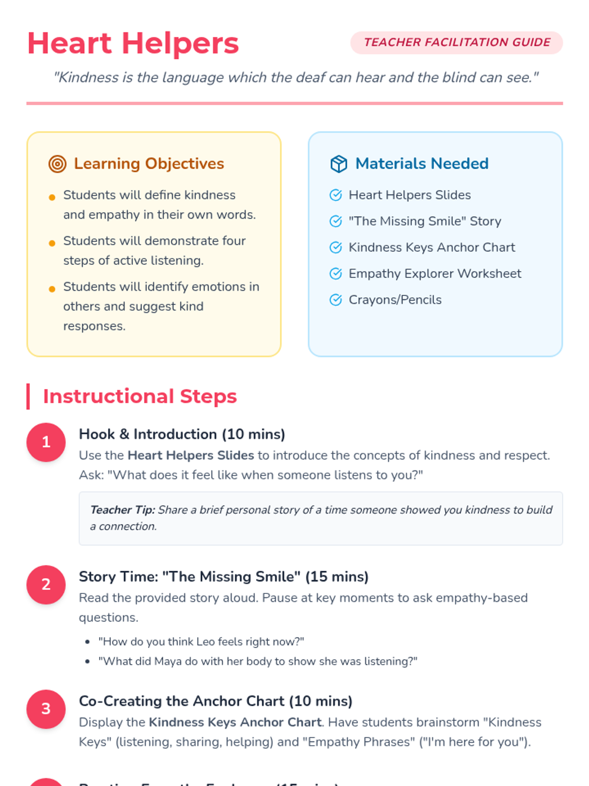 A social-emotional learning lesson for second graders focusing on kindness, active listening, and empathy towards teachers and peers. Students will explore these concepts through a short story, interactive slides, and a visual anchor chart.