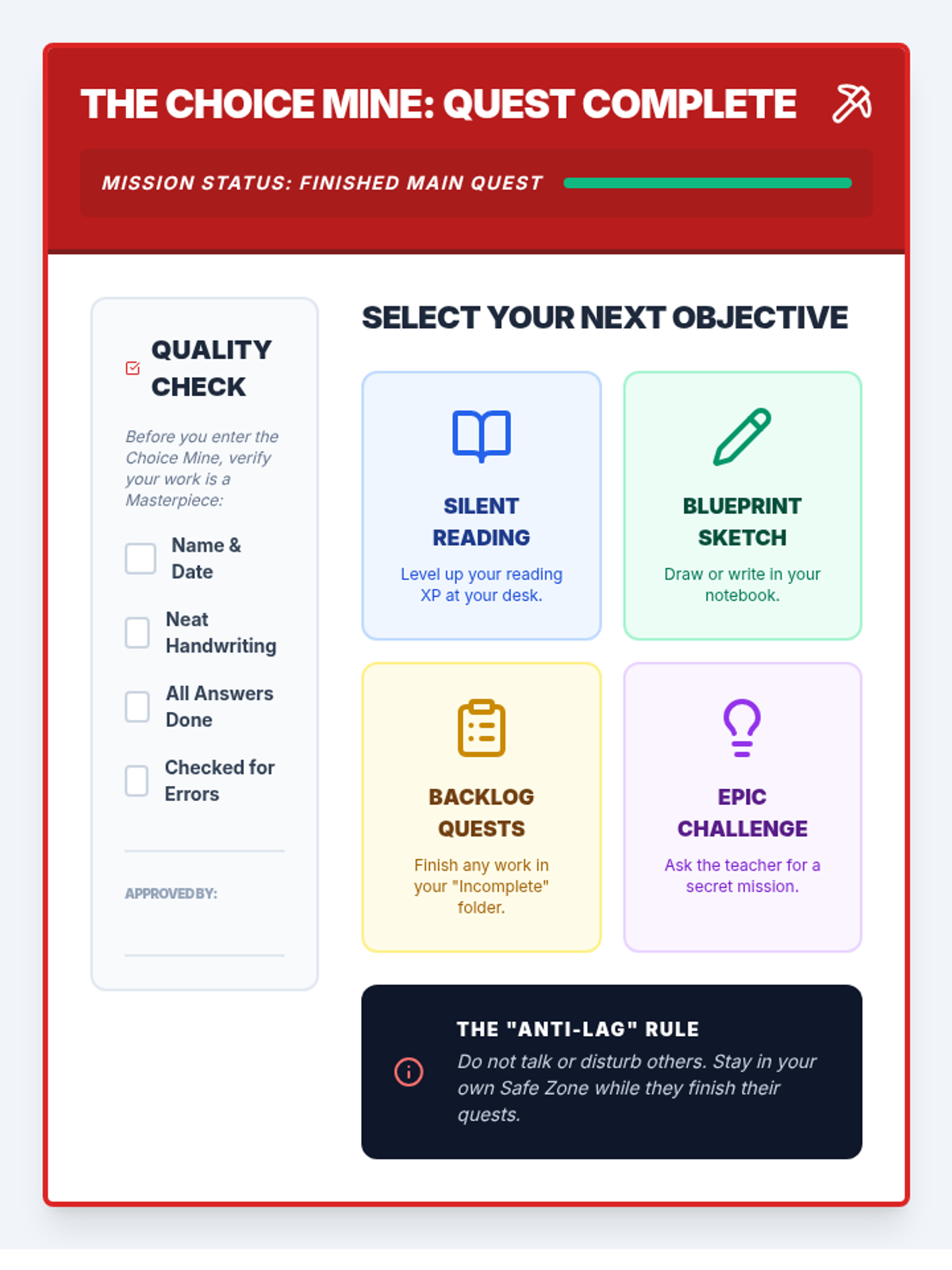 Teaches students the importance of finishing work with quality ('Masterpiece' level) and provides a clear menu of choices for what to do once work is complete.