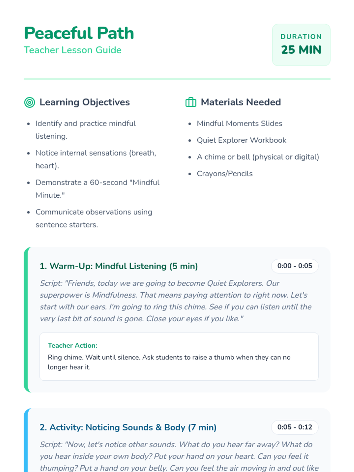 An introductory mindfulness lesson for 1st grade students focused on sensory and emotional regulation through listening, breathing, and noticing techniques.