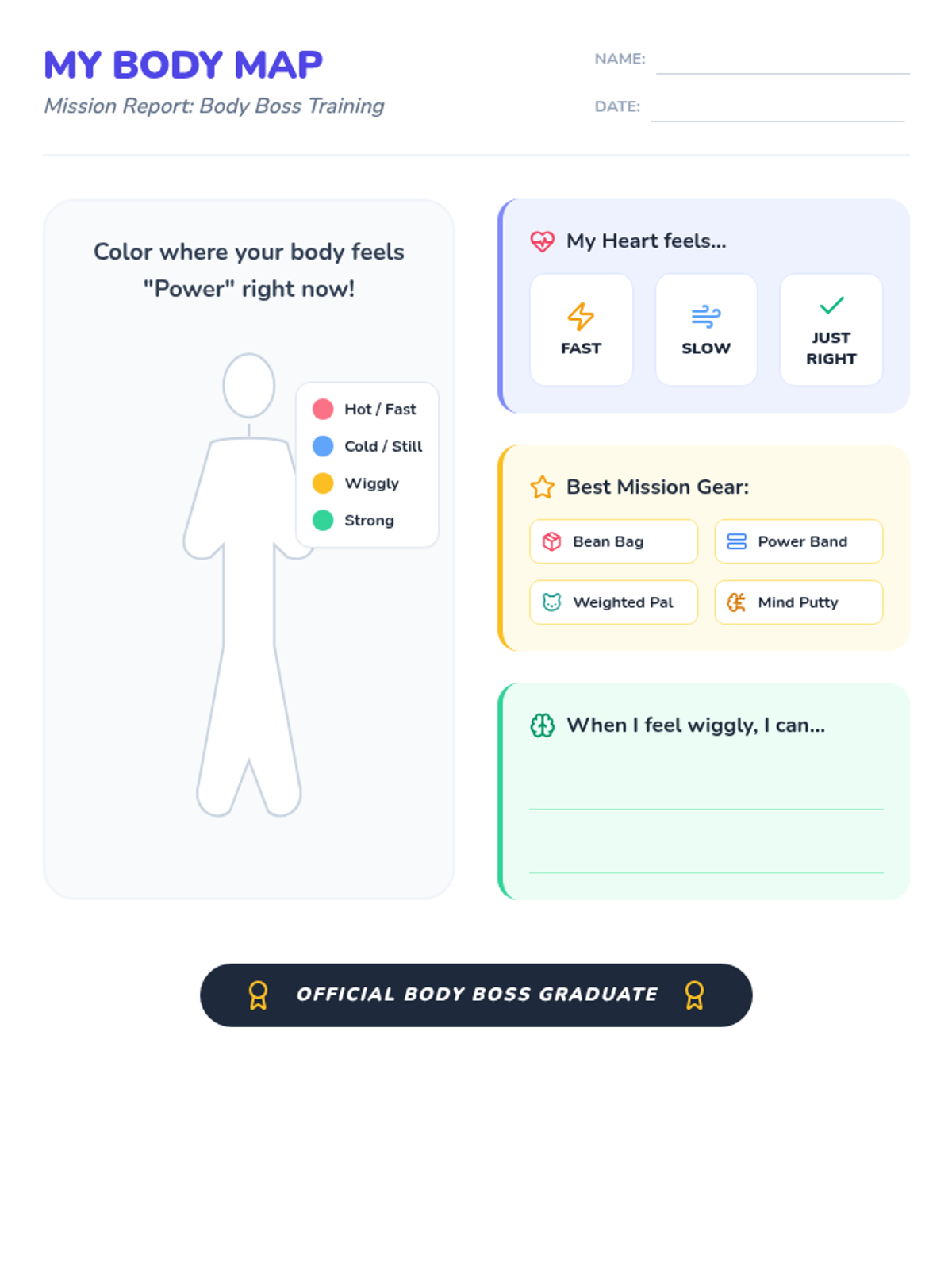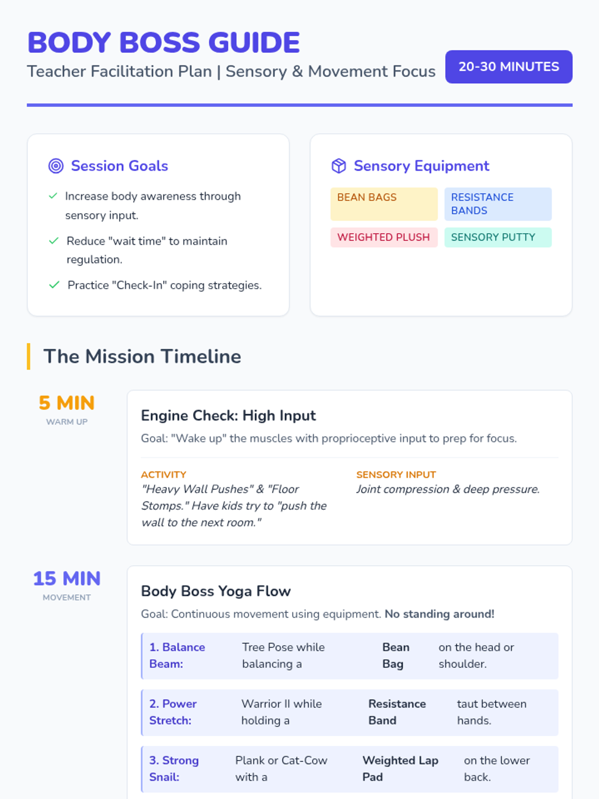 A high-energy, sensory-integrated group session for students in grades K-3. This lesson combines yoga-inspired movement with sensory tools to help students recognize their body signals and practice self-regulation coping strategies.