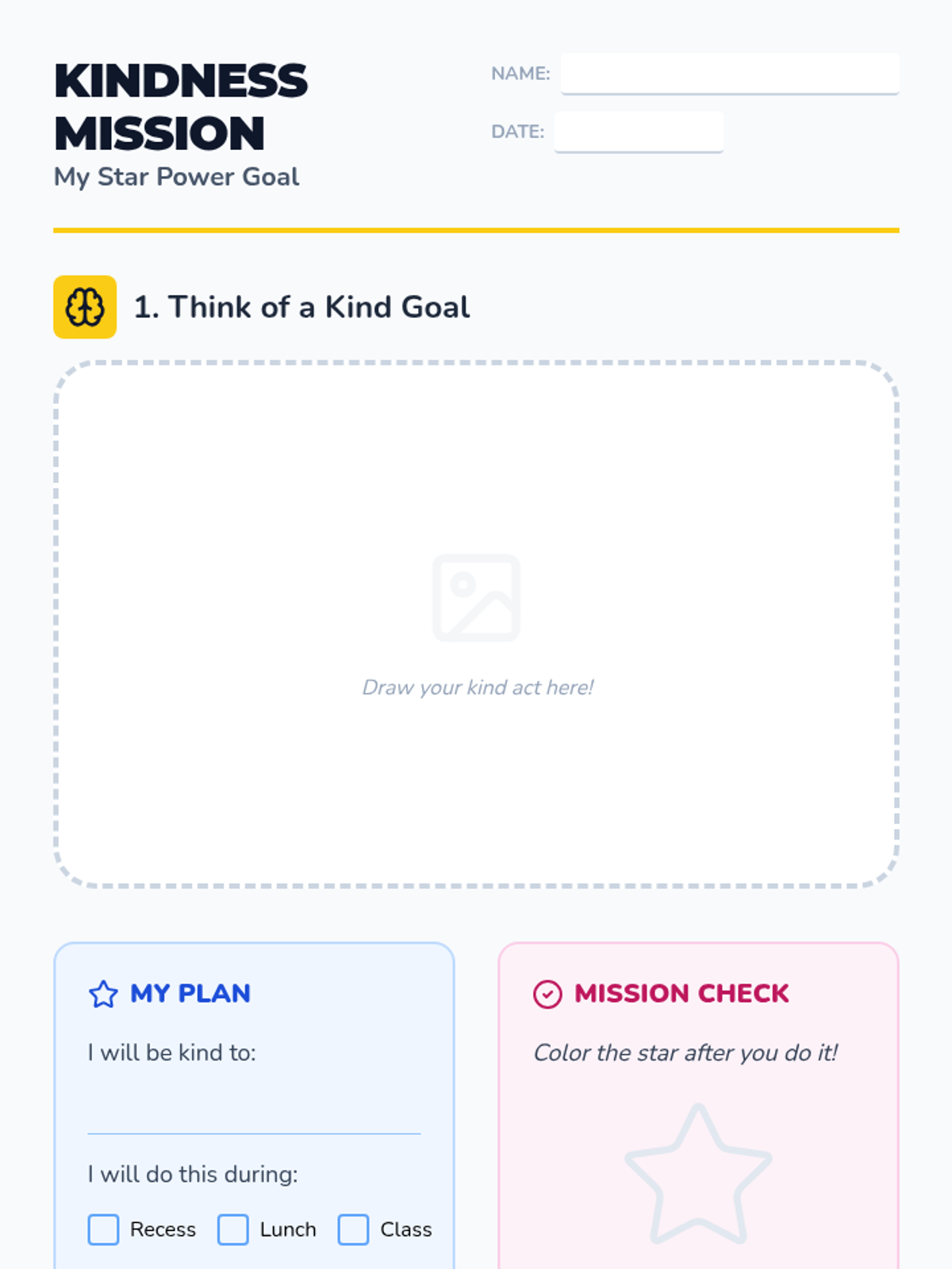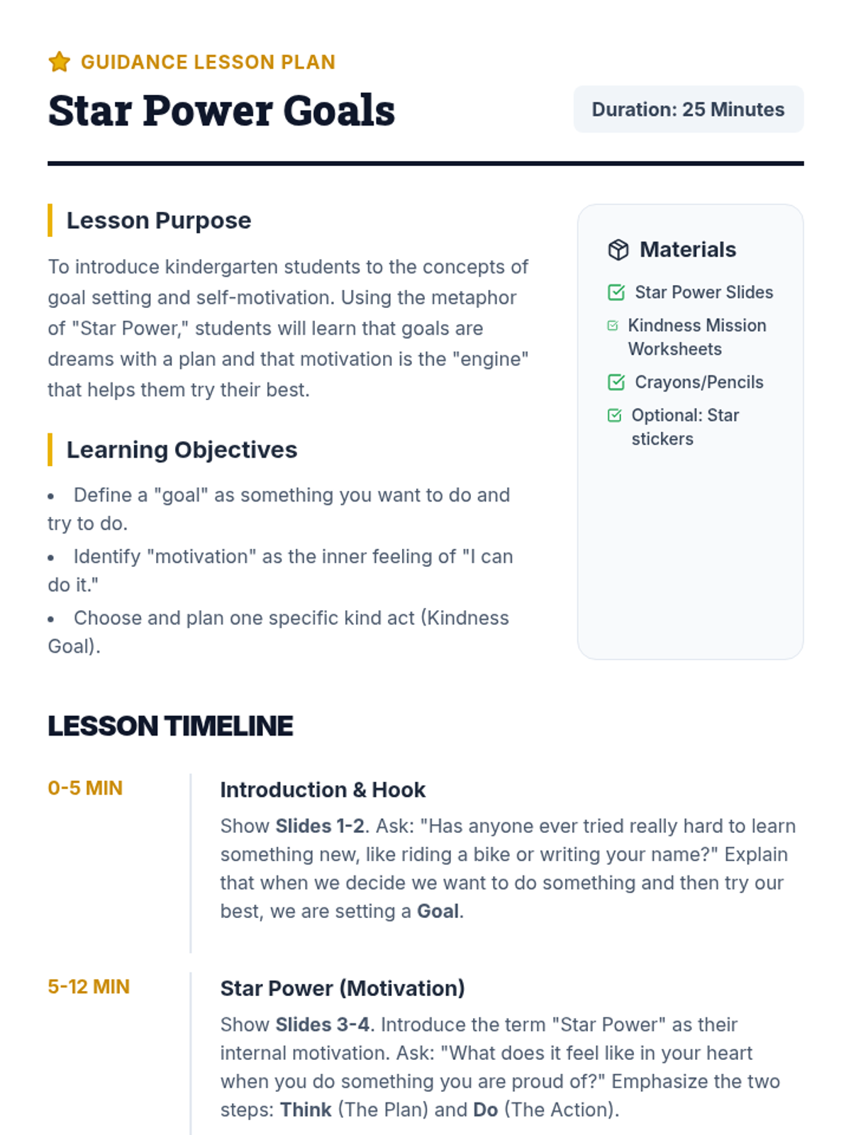 A 25-minute kindergarten guidance lesson that introduces the concepts of self-motivation and goal setting through the lens of a 'Kindness Mission'. Students learn to set simple goals and find their inner 'Star Power' to achieve them.
