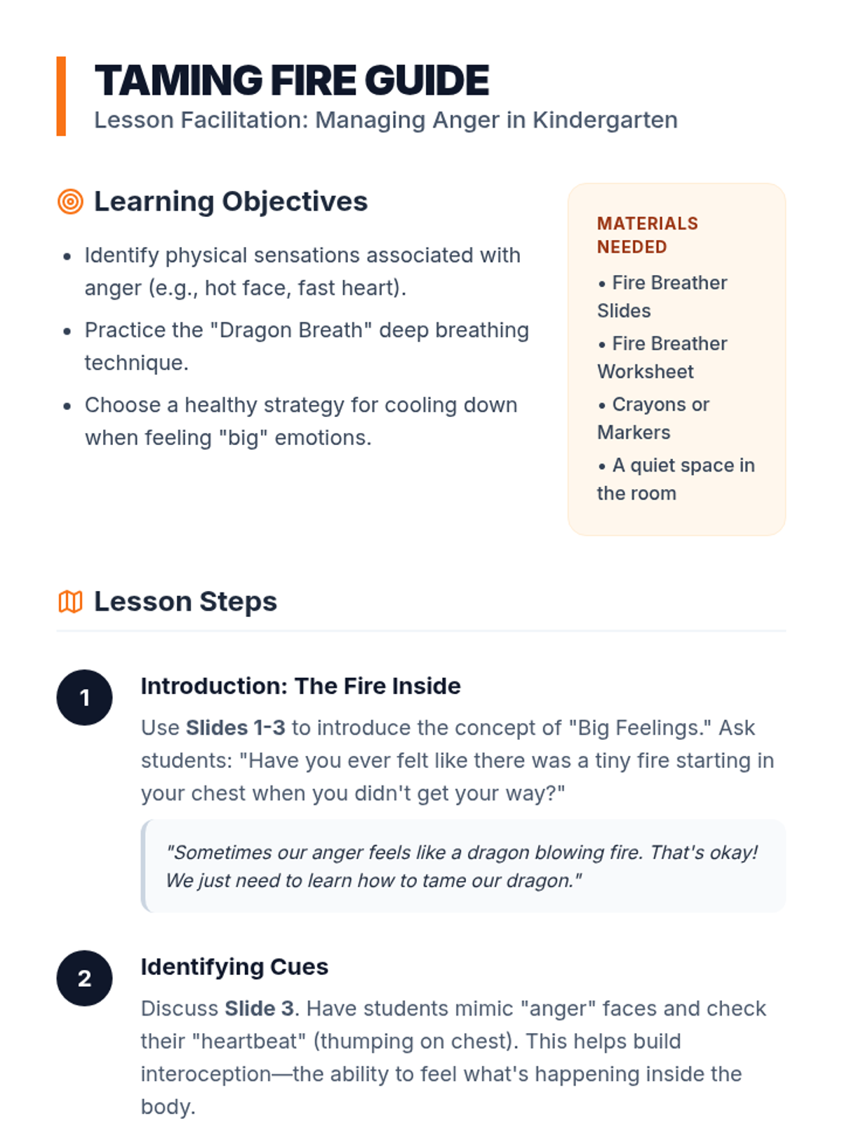 A social-emotional learning lesson for kindergarteners focused on identifying anger and practicing 'cooling' strategies like deep breathing and quiet time.