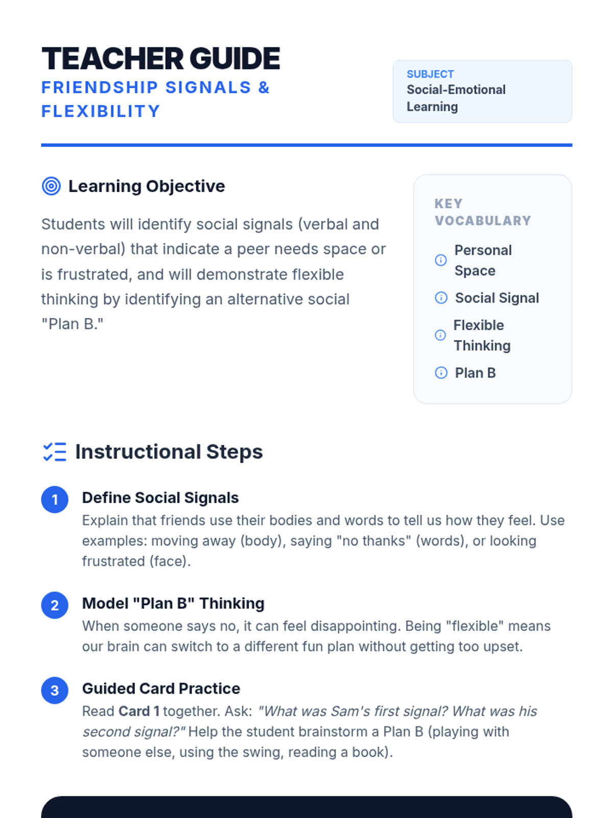 This lesson focuses on helping students recognize social cues related to personal space and behavior, and practicing flexibility when peers decline to play.