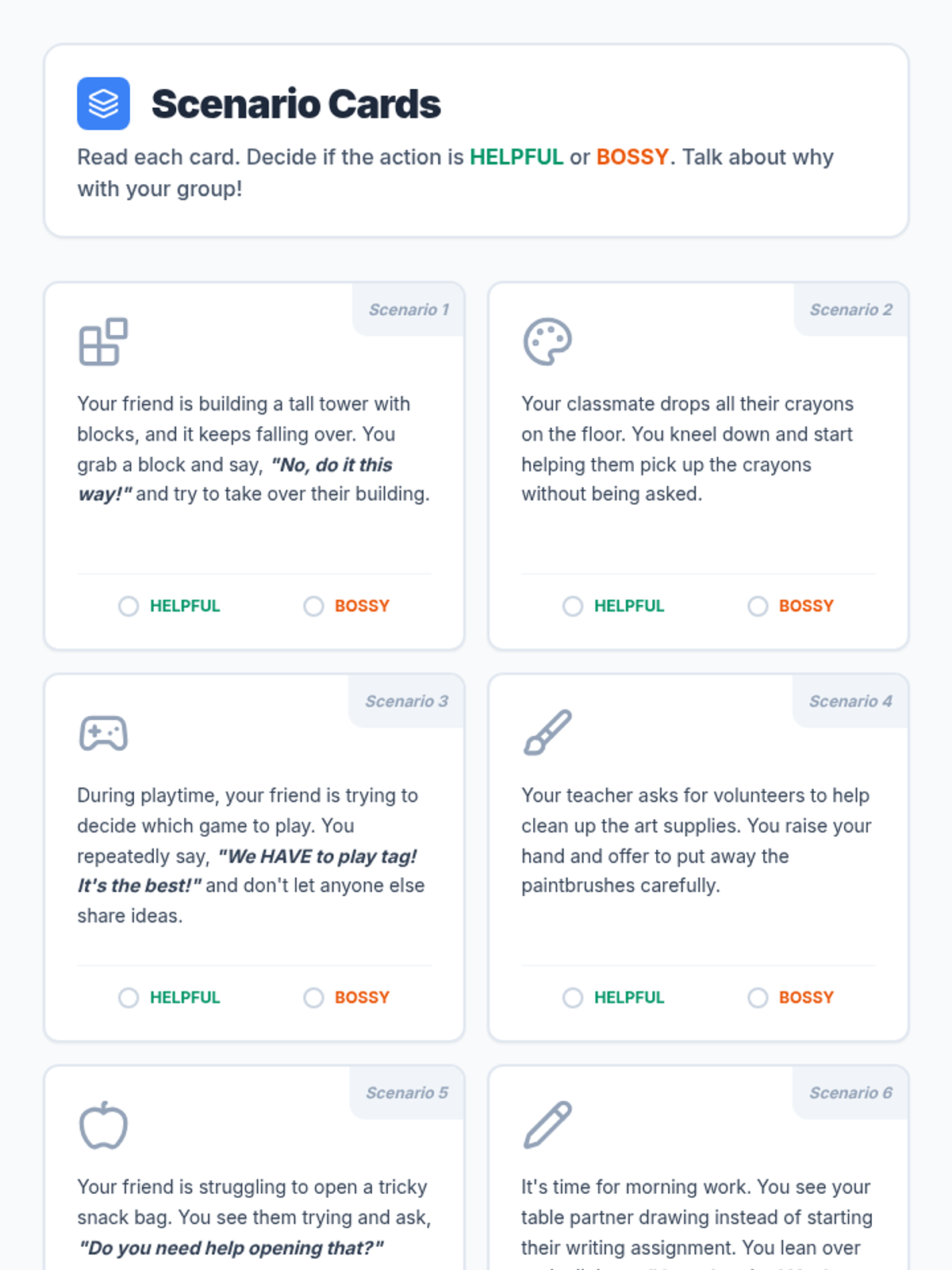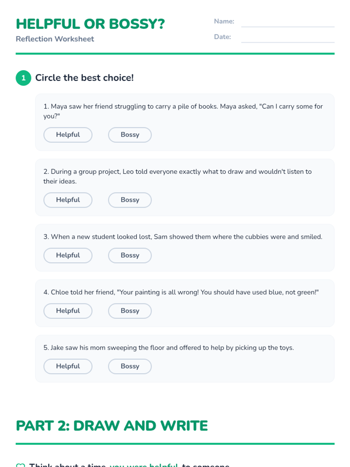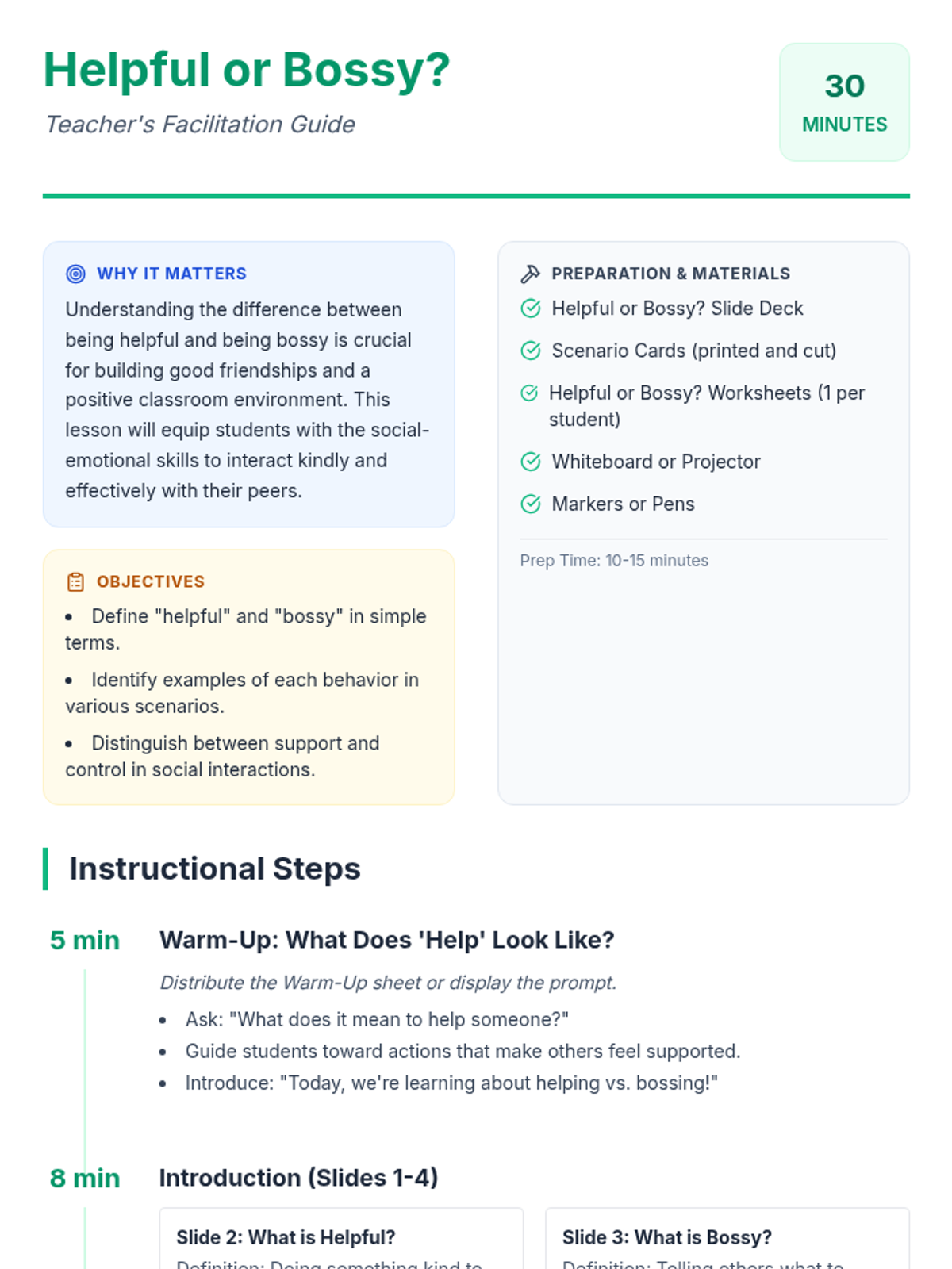 A 30-minute social-emotional learning lesson for 1st graders to distinguish between being helpful and being bossy, featuring discussion, scenario sorting, and creative reflection.