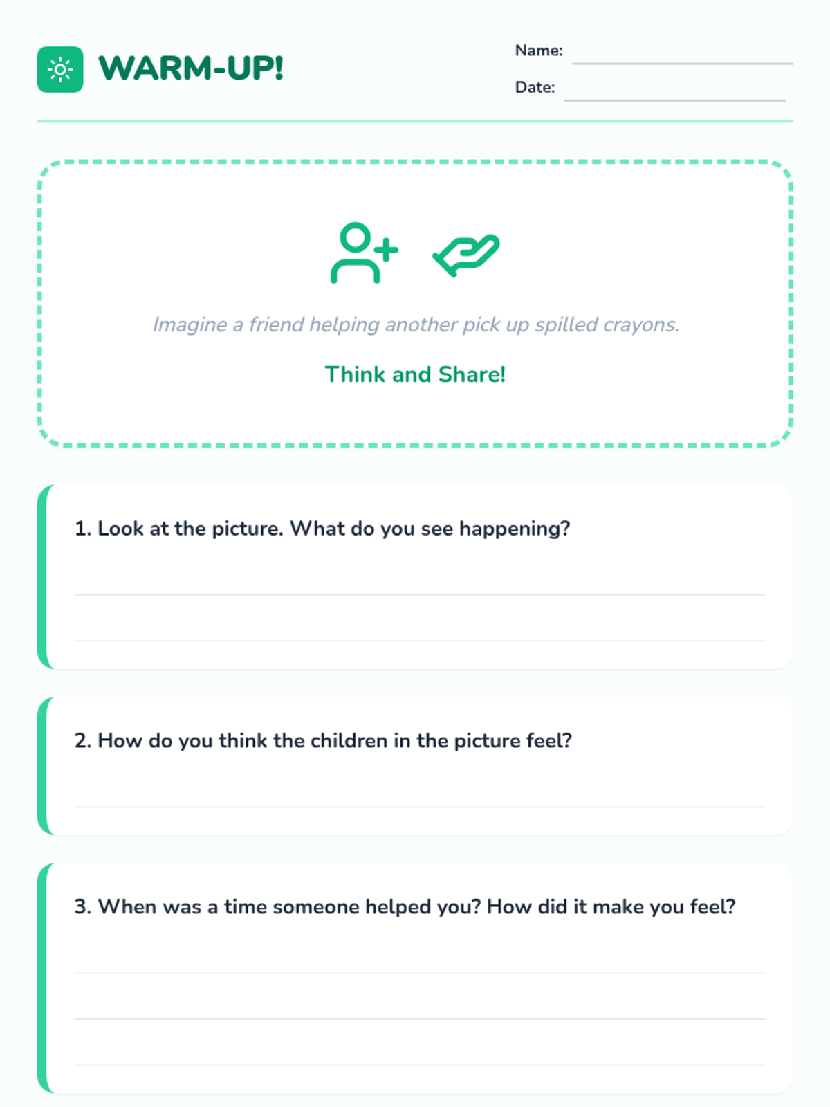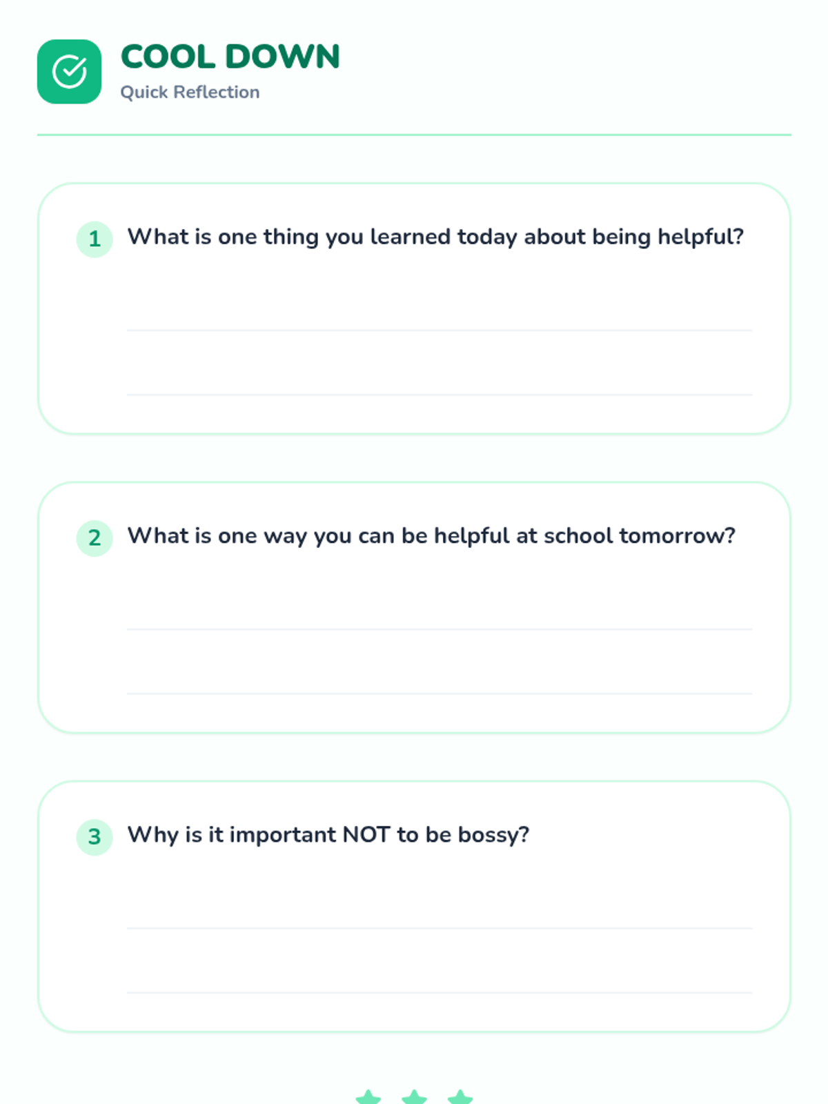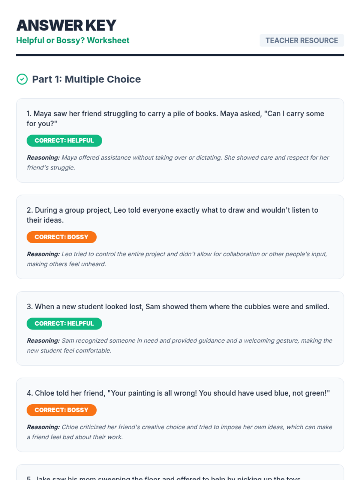 A 30-minute social-emotional learning lesson for 1st graders to distinguish between being helpful and being bossy, featuring discussion, scenario sorting, and creative reflection.