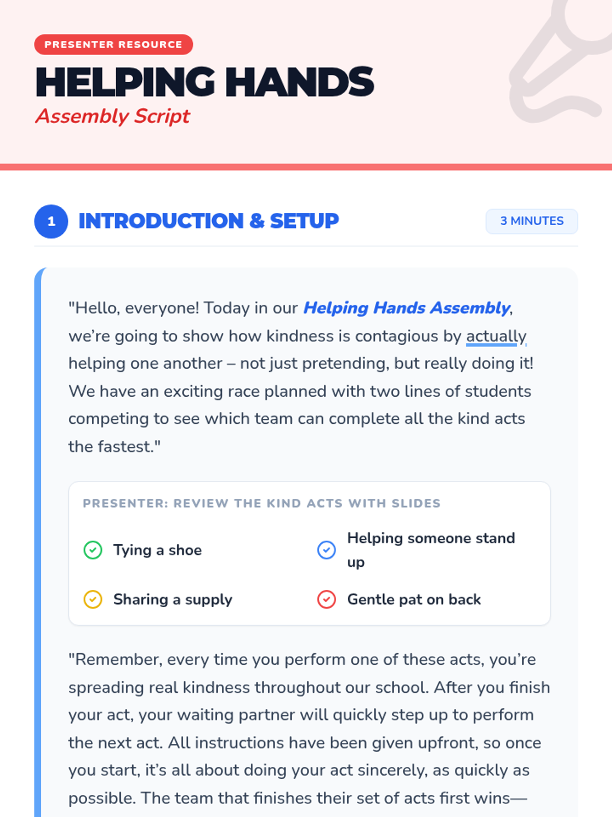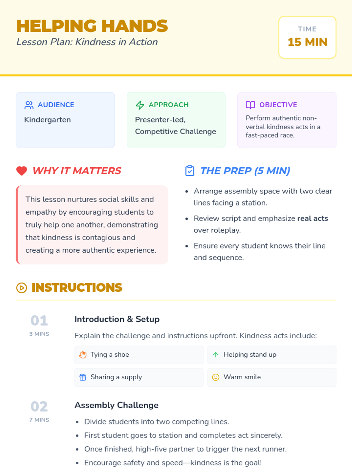 A Kindergarten assembly-style lesson where students perform authentic, non-verbal acts of kindness in a fast-paced 'Helping Hands' challenge to demonstrate that kindness is contagious.