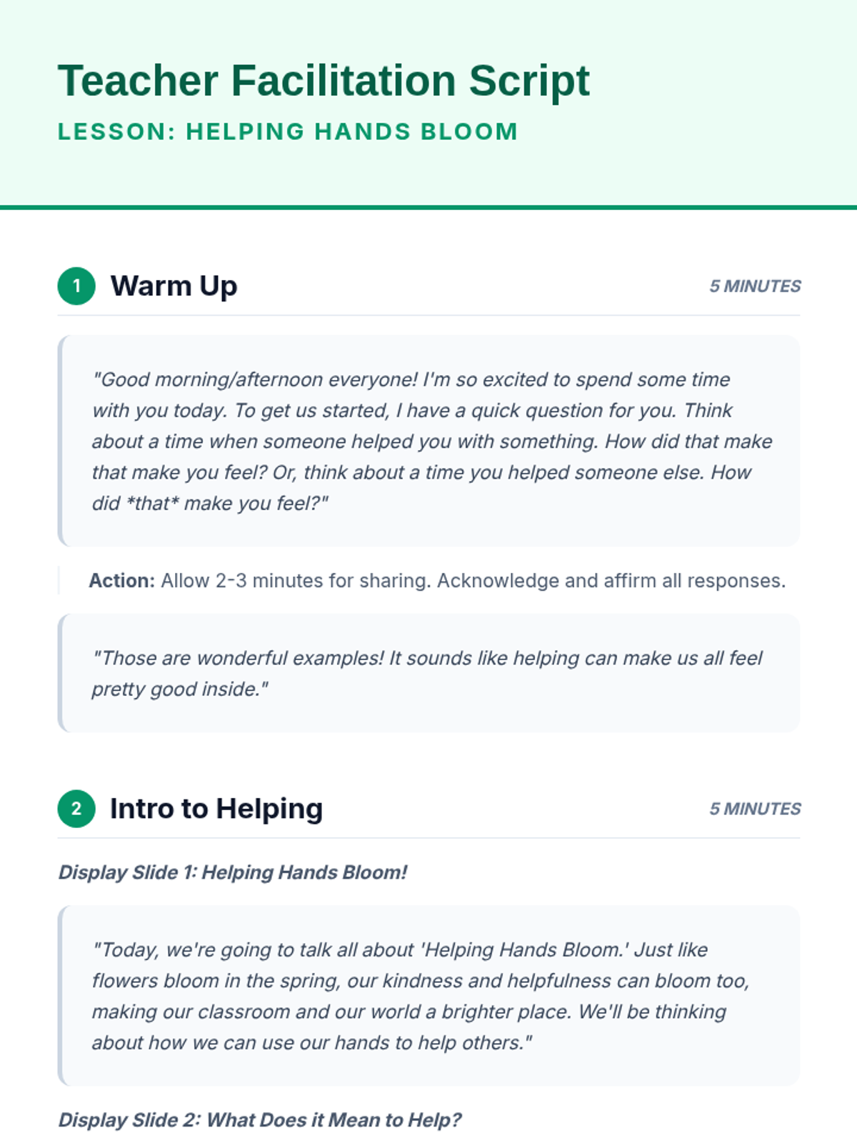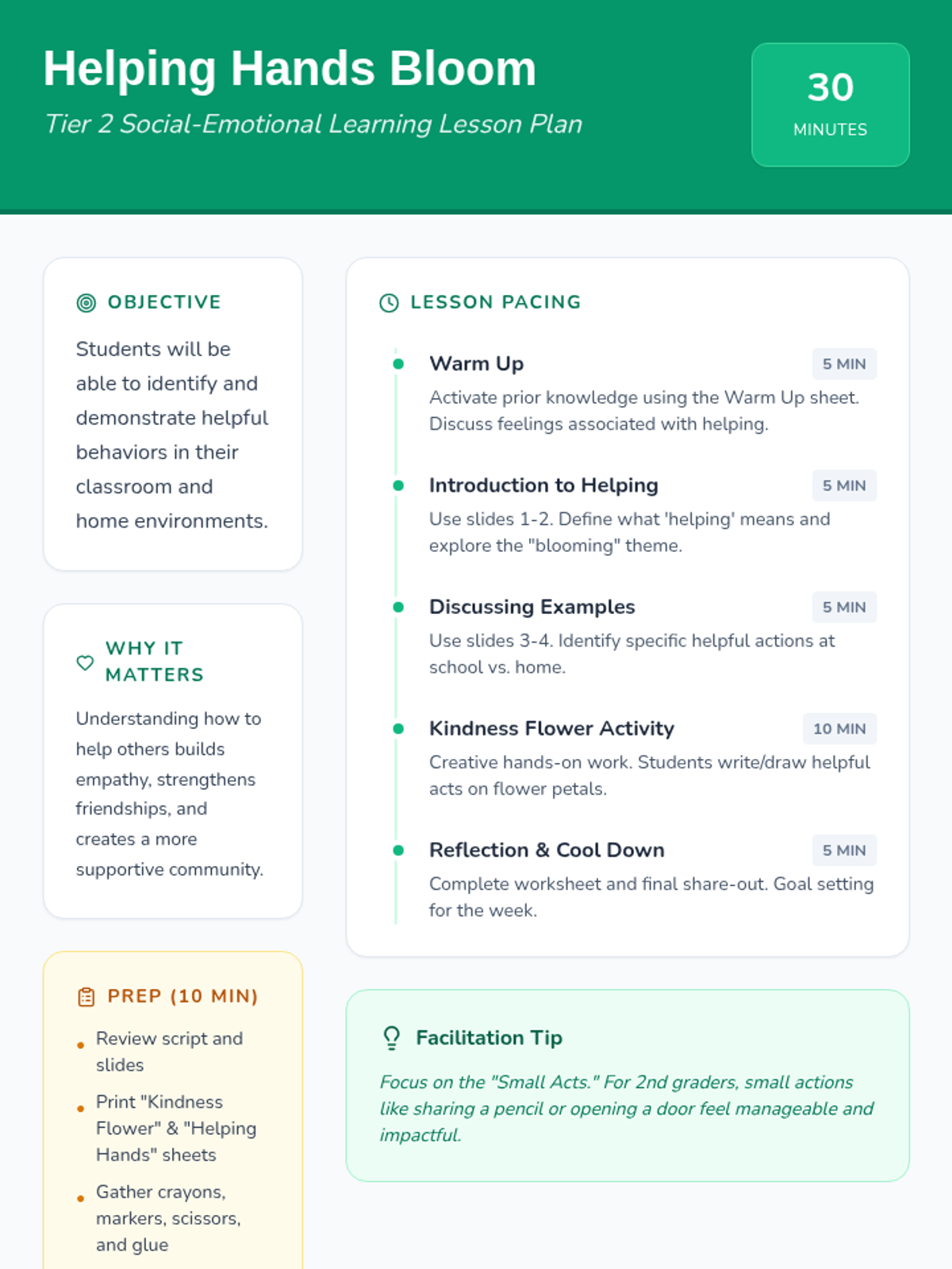 A 30-minute Tier 2 small group lesson for 2nd graders focused on identifying and practicing acts of kindness and helpfulness to foster a positive community.