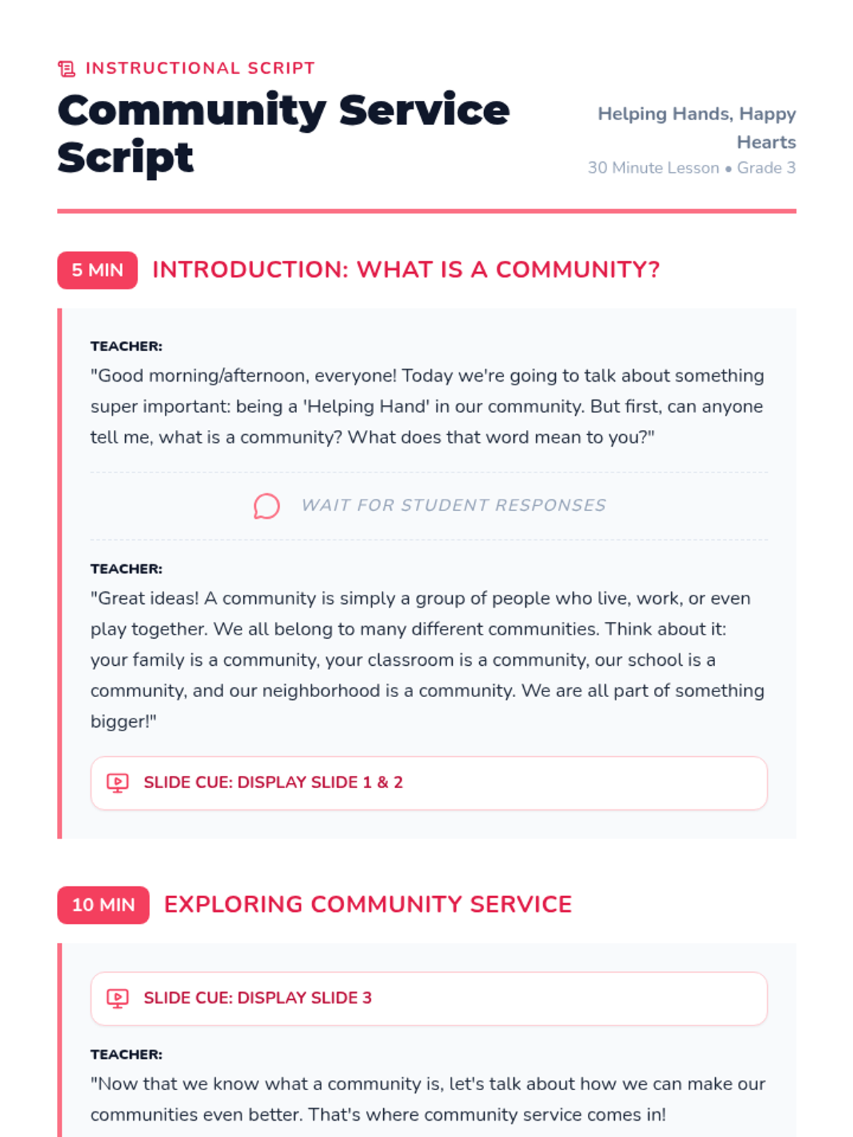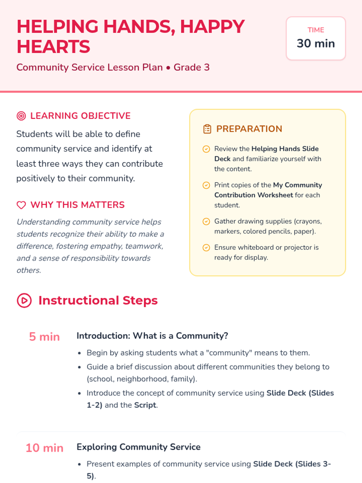 A 30-minute lesson for 3rd graders introducing community service, its importance, and practical ways students can make a positive impact.