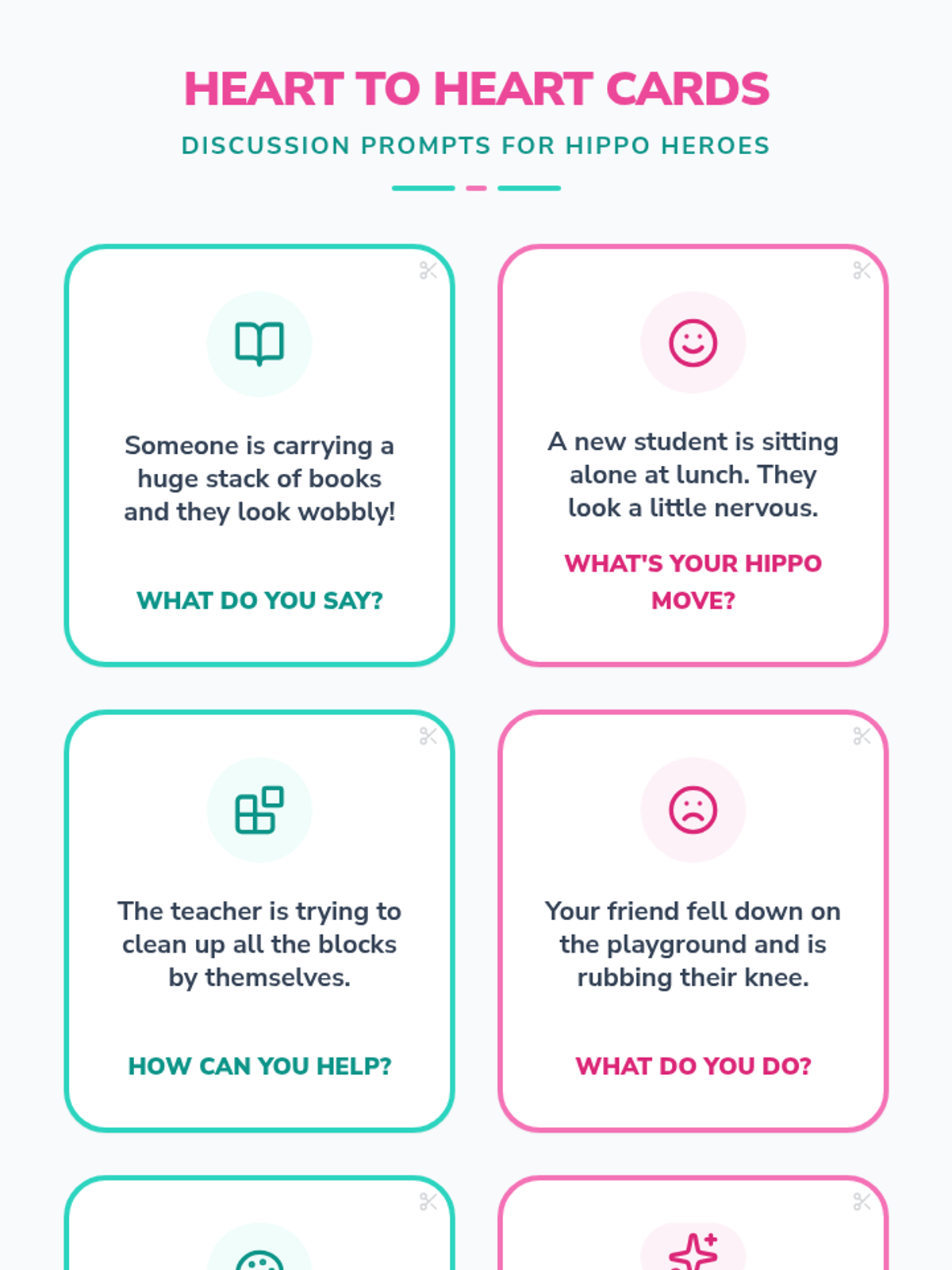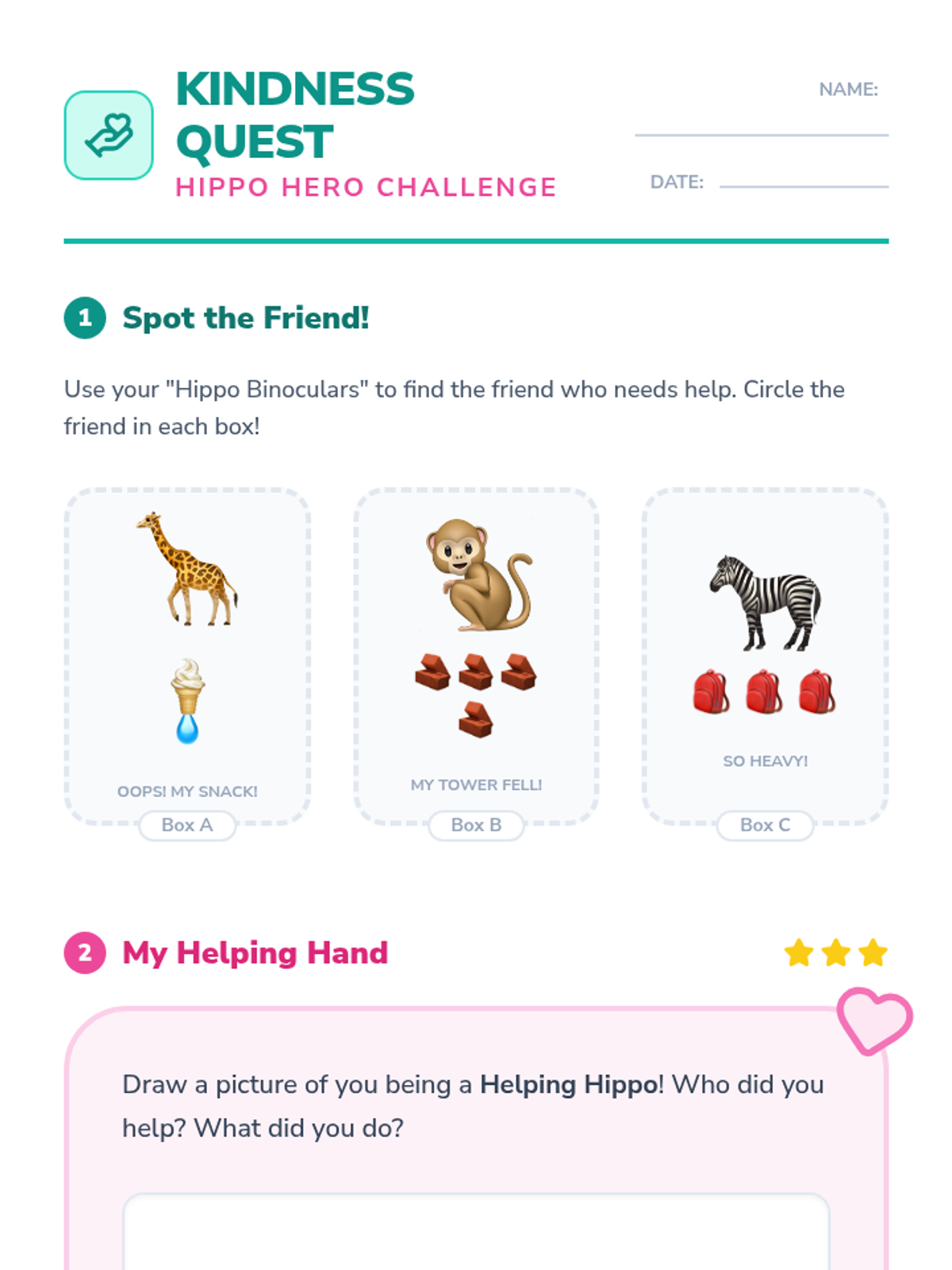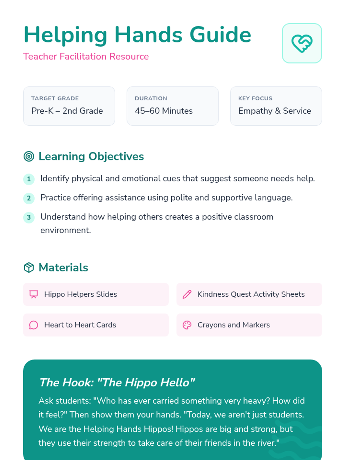 A heartwarming lesson for Pre-K to 2nd grade that uses the 'Helping Hands Hippos' to teach students how to notice when others need help and how to offer a kind hand in their community.