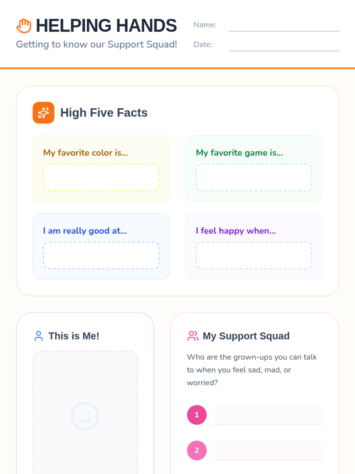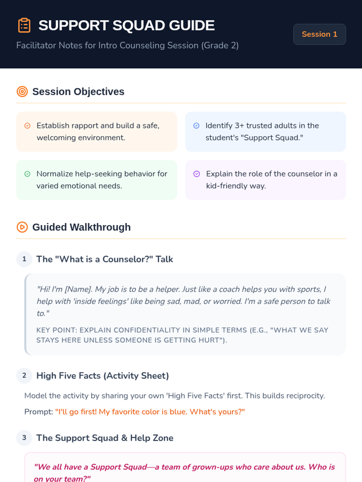 An introductory counseling session for second graders focused on building rapport and introducing the concept of asking for help through a 'Support Squad' theme.