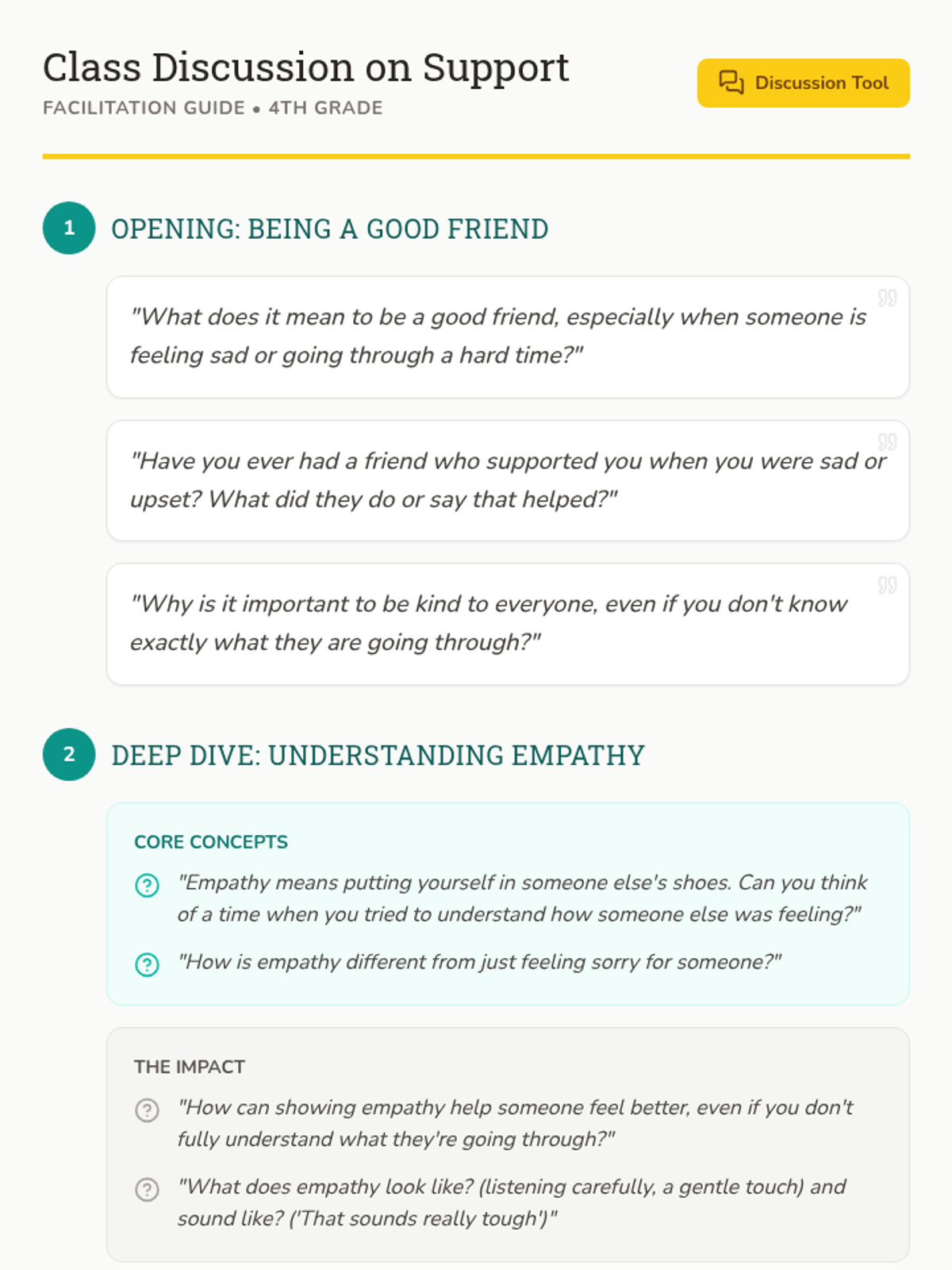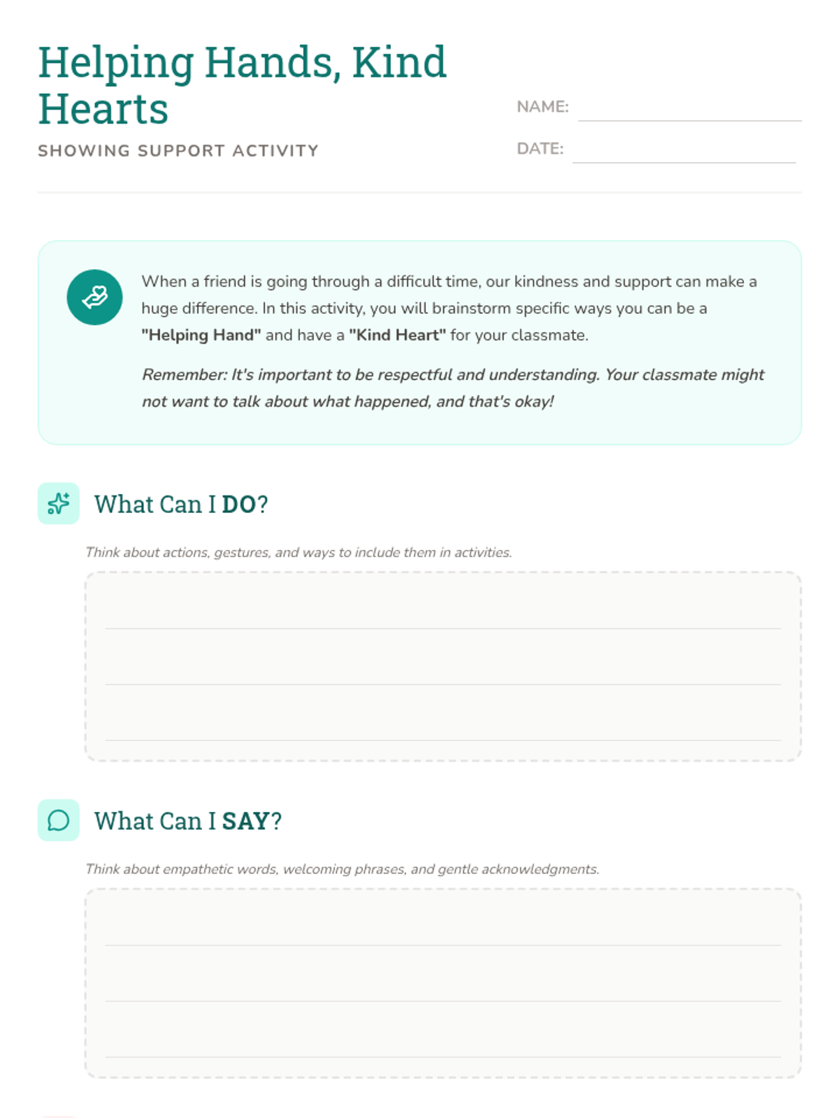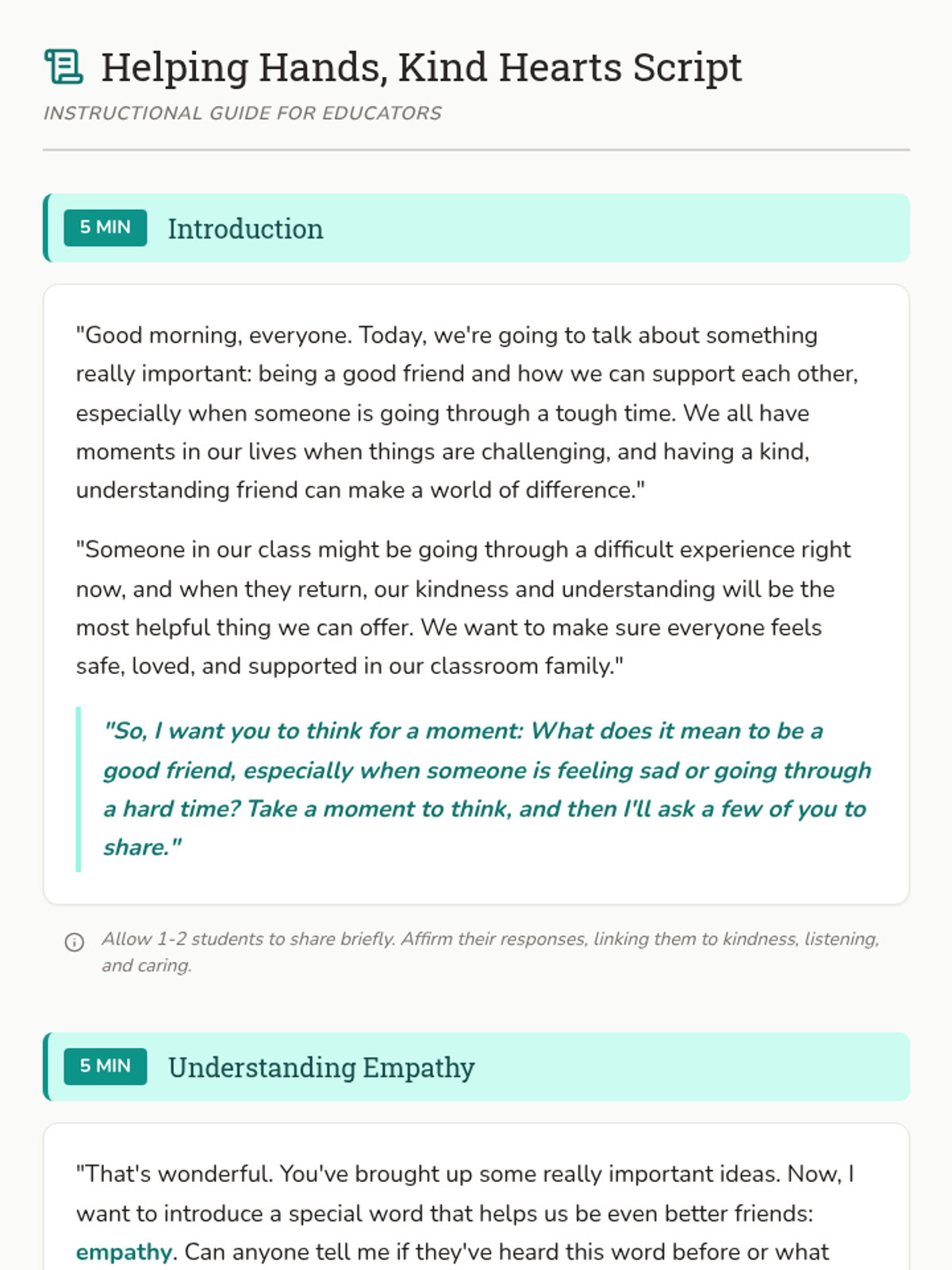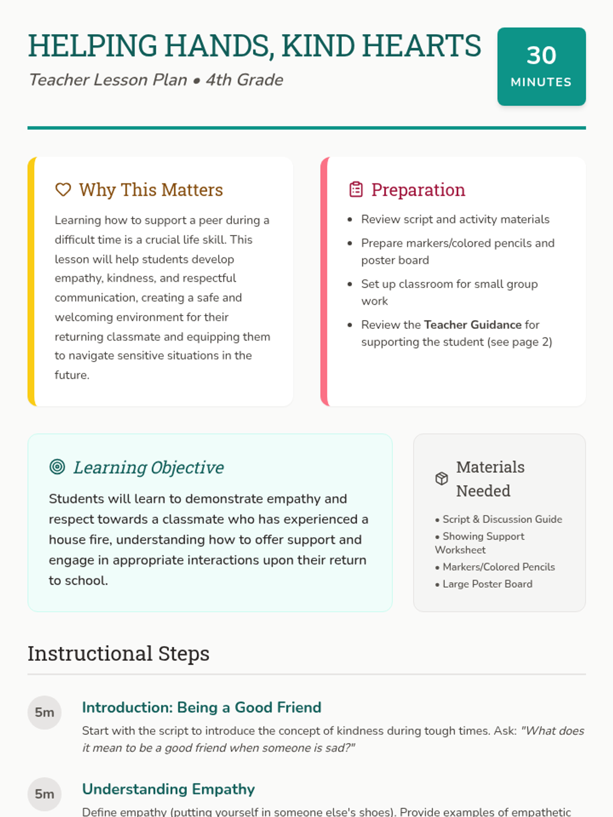 A 30-minute lesson designed to help 4th-grade students develop empathy and practical ways to support a classmate returning from a house fire. Students will learn the concept of empathy, brainstorm supportive actions and words, and commit to creating a welcoming environment.