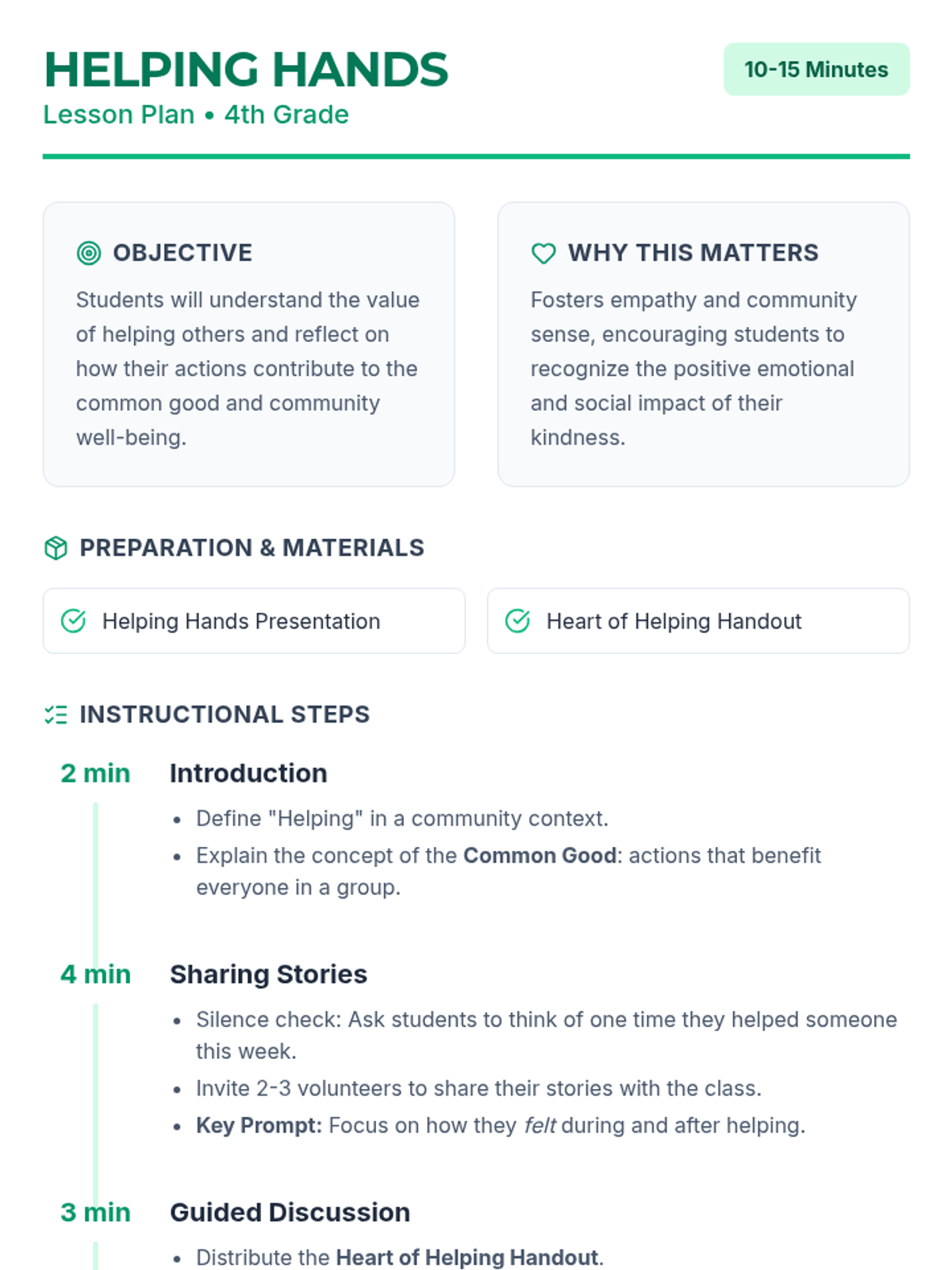 A 4th-grade lesson focusing on the importance of helping others, fostering empathy, and understanding the common good through personal stories and guided reflection.
