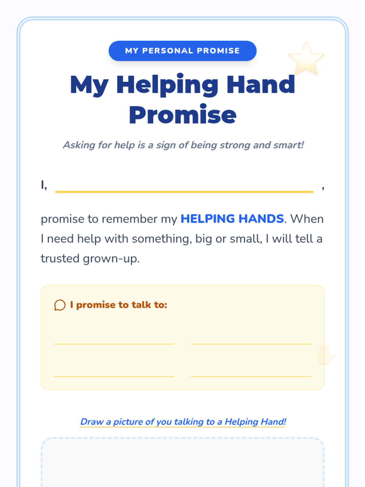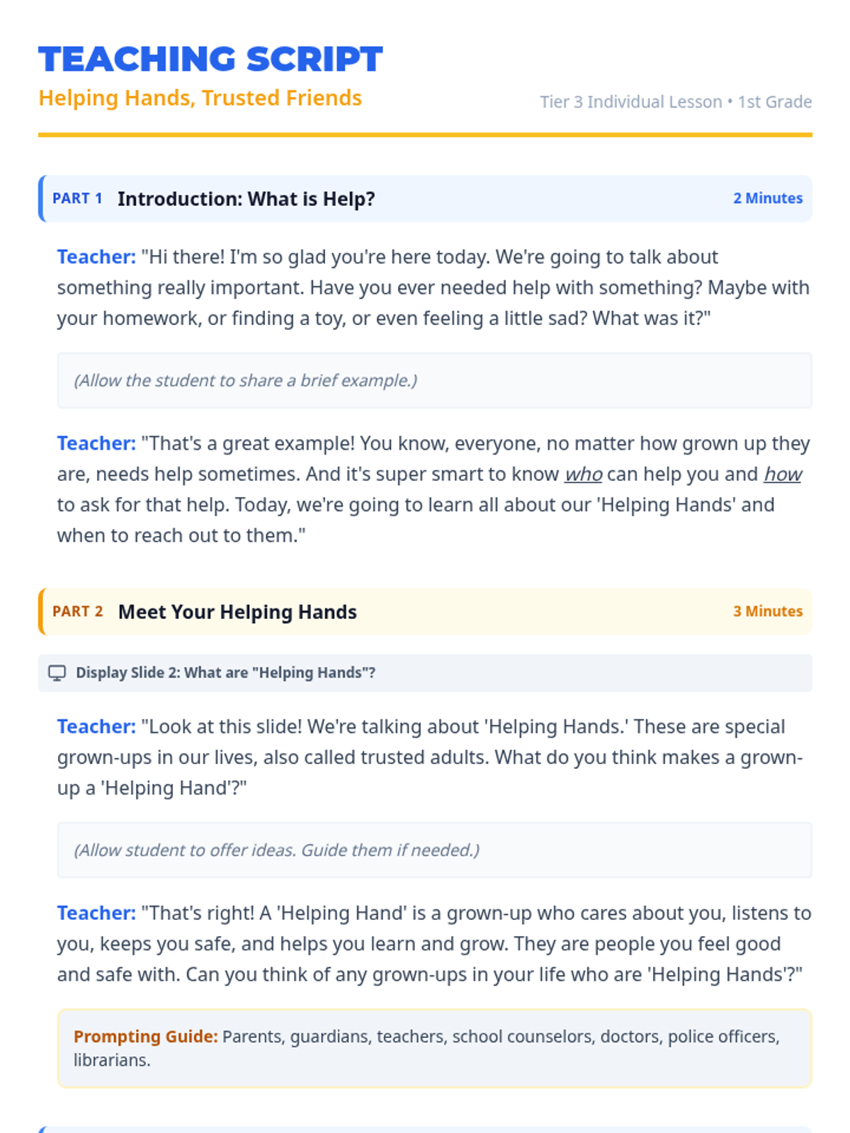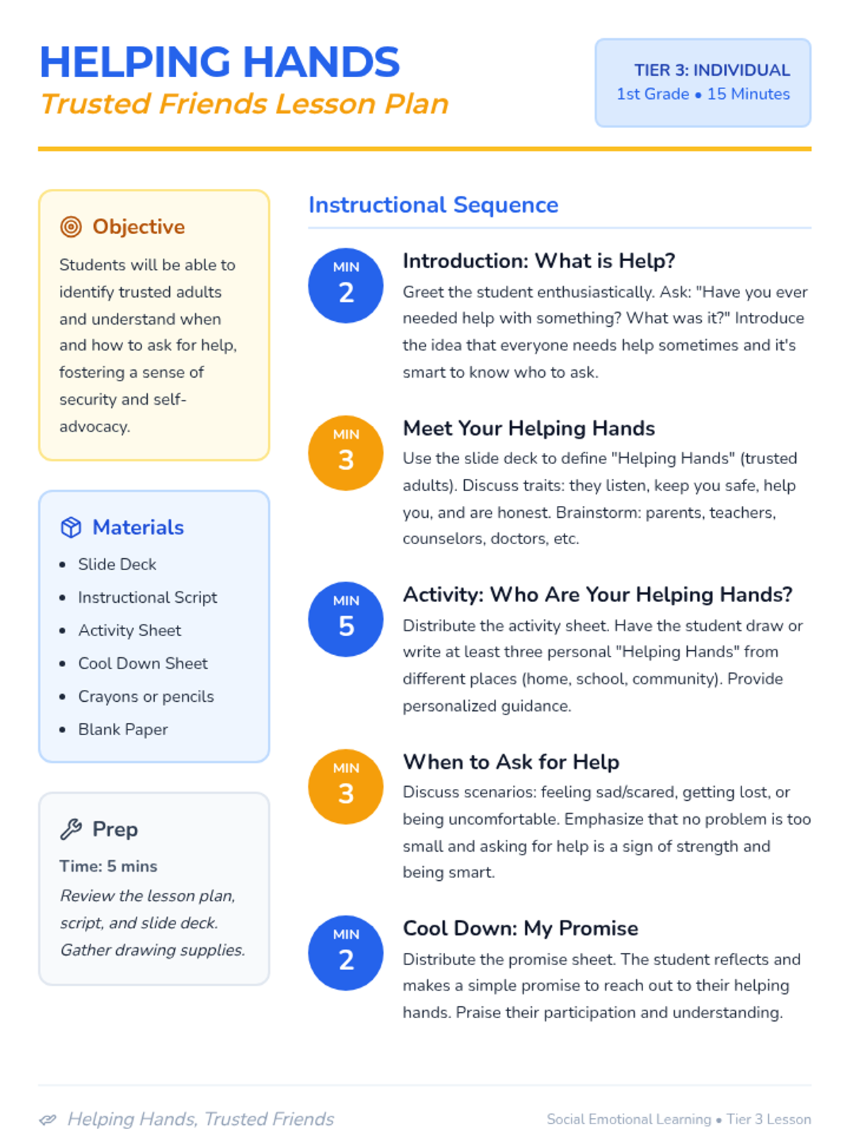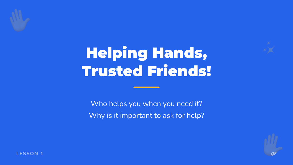 A 15-minute individual lesson for 1st graders to identify trusted adults and learn how to ask for help, fostering safety and self-advocacy.