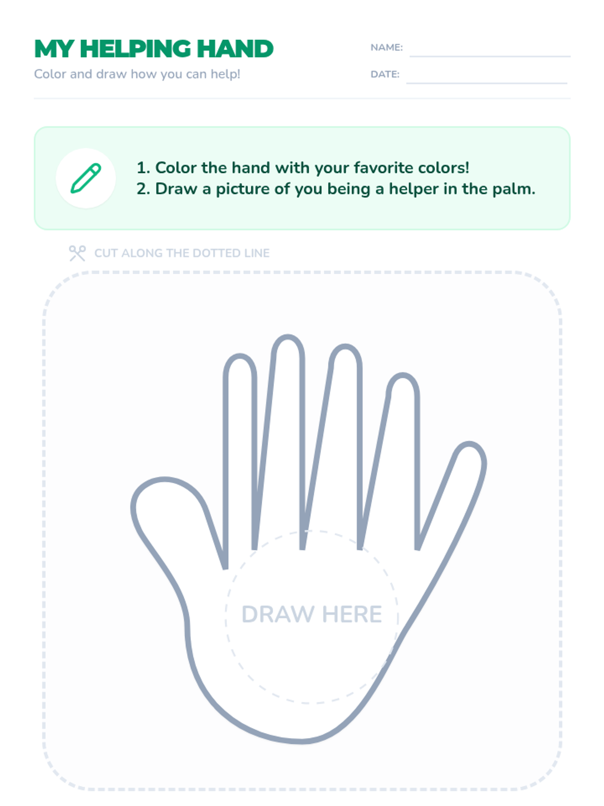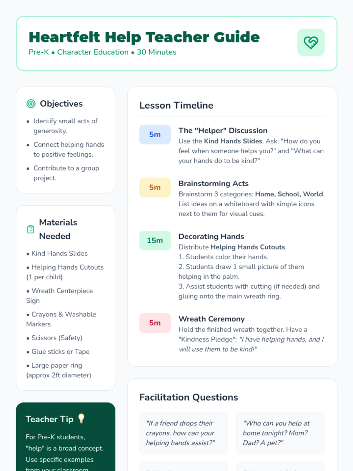 A heartwarming Pre-K lesson where students explore ways to be helpful and generous by creating a collaborative 'Helping Hands' wreath.
