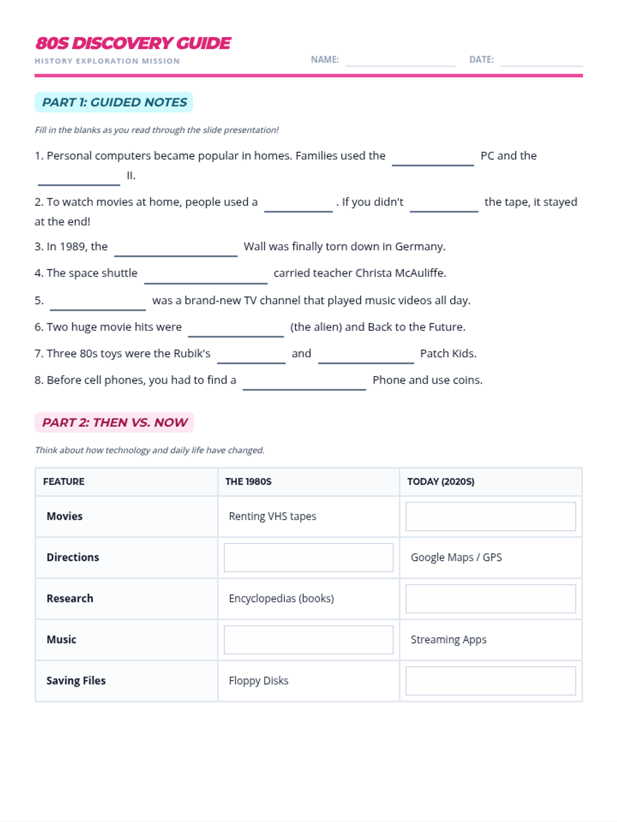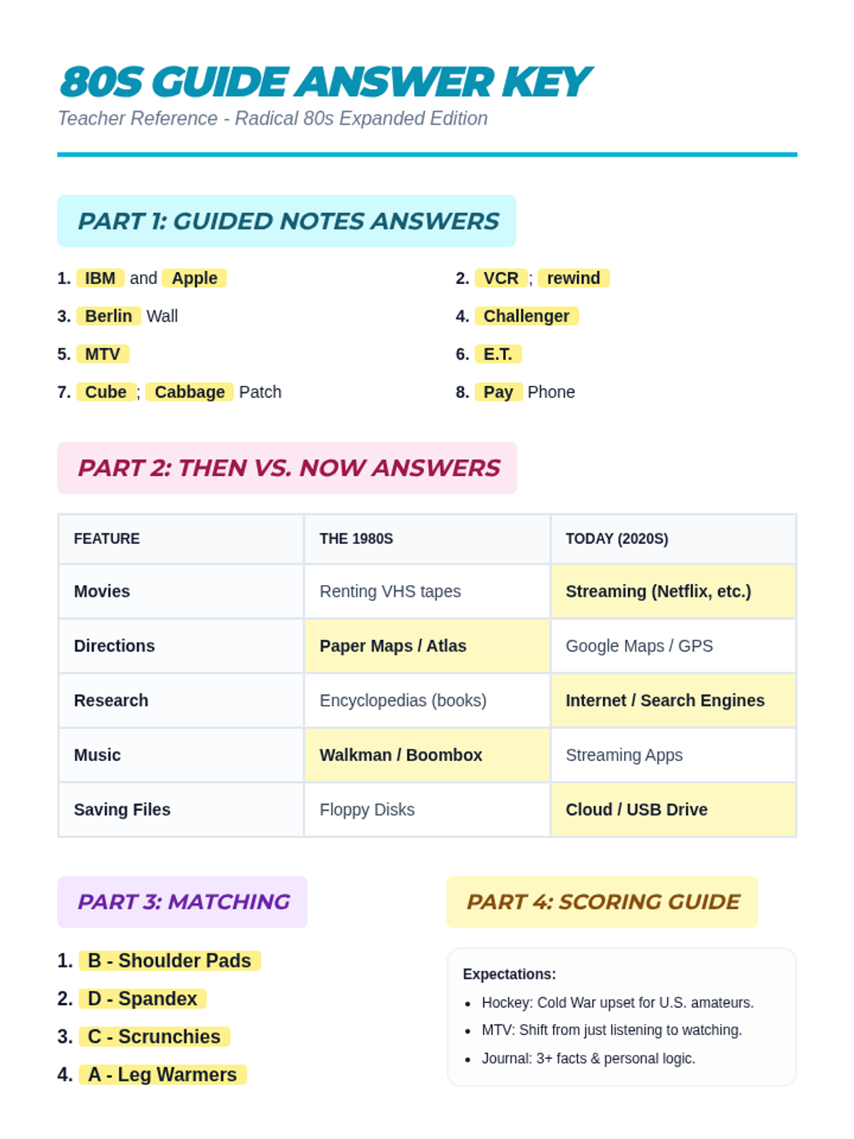 A vibrant, interactive dive into the 1980s for 4th graders, covering technology, culture, fashion, and history through a virtual asynchronous lens.
