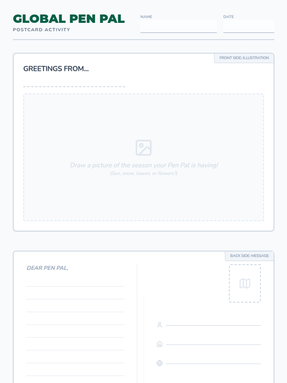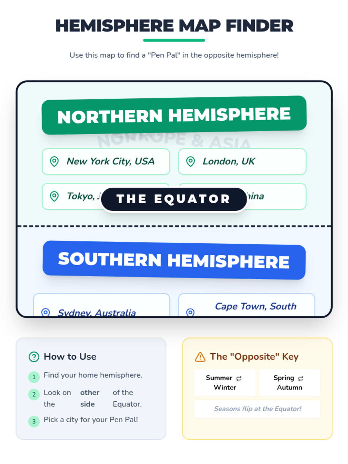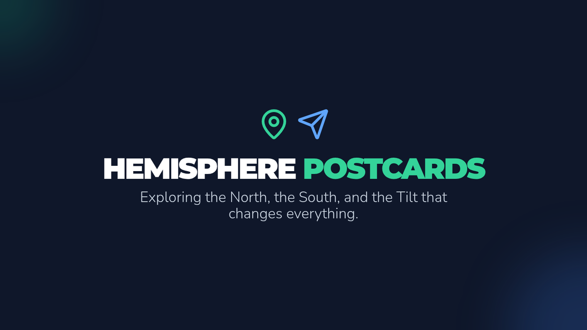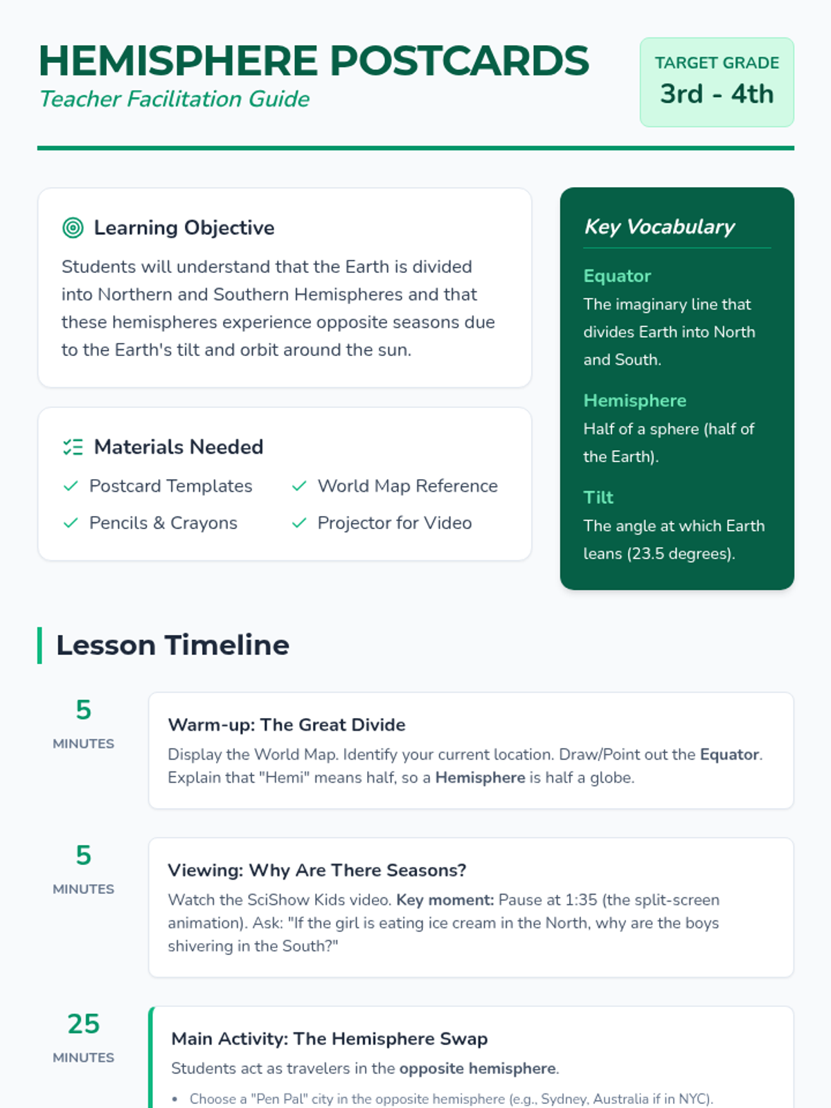 A geography and science lesson where students explore the concept of hemispheres and learn why seasons are opposite in different parts of the world through a creative postcard activity.