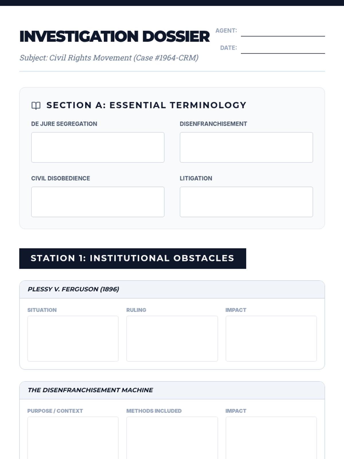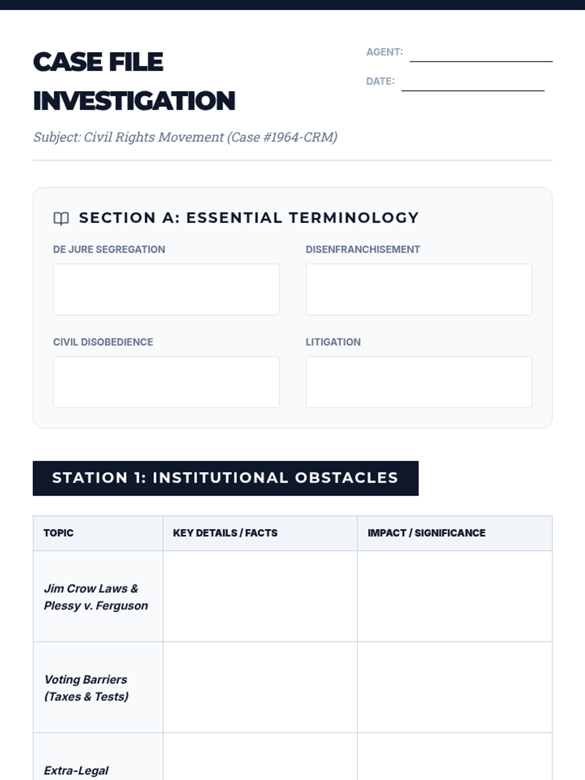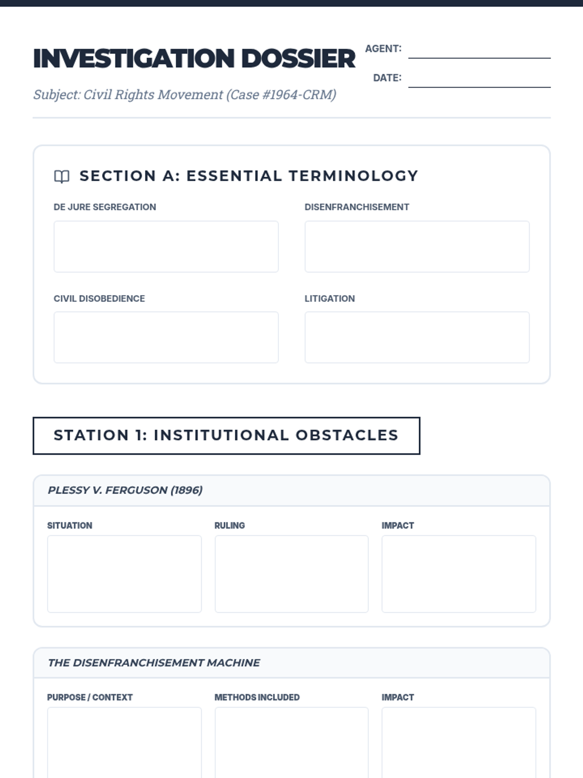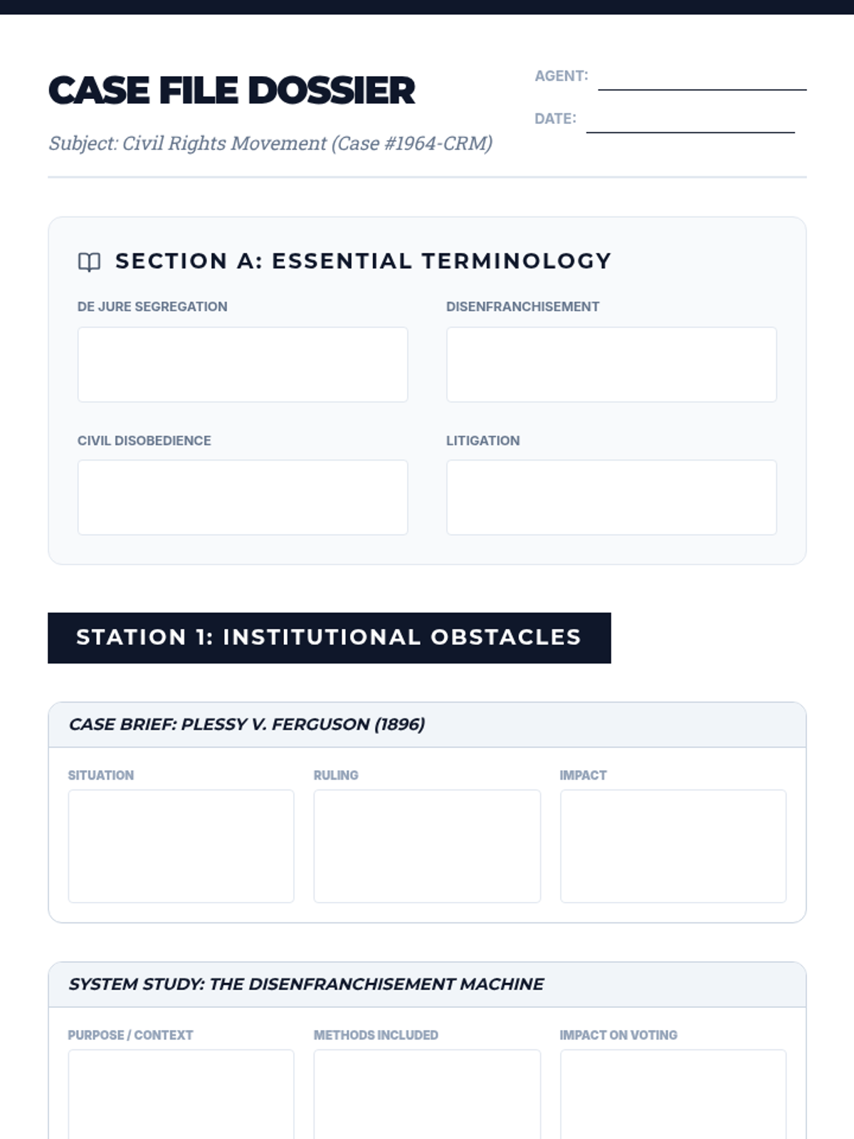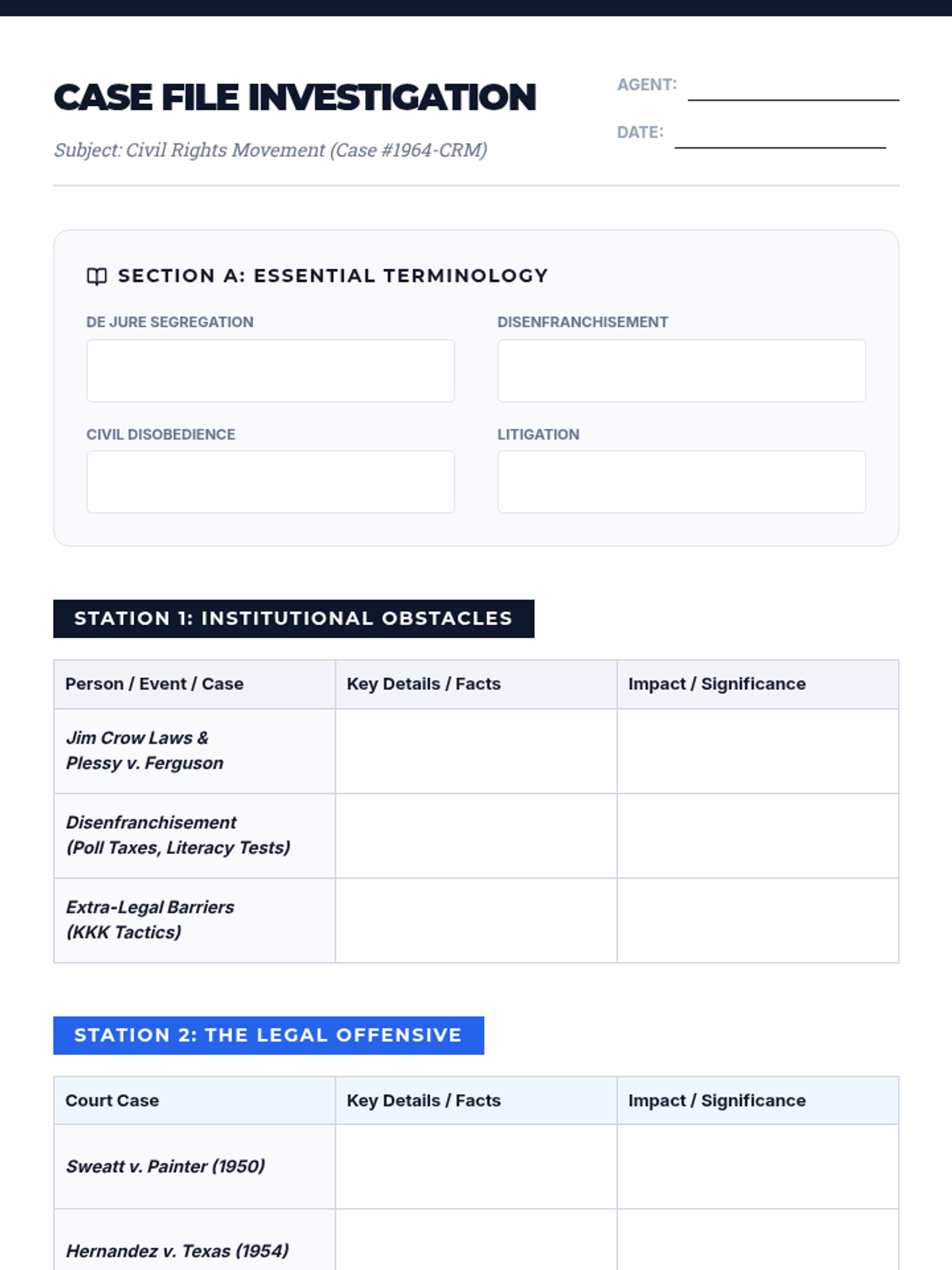 A comprehensive lesson on the Civil Rights Movement featuring gallery stations and a guided investigation worksheet. Students analyze institutional obstacles, legal strategies, non-violent and militant tactics, and the expansion of the movement to other marginalized groups.