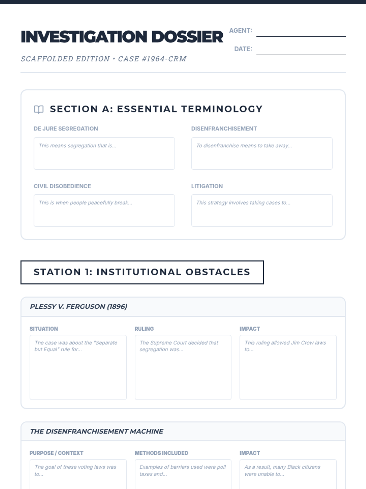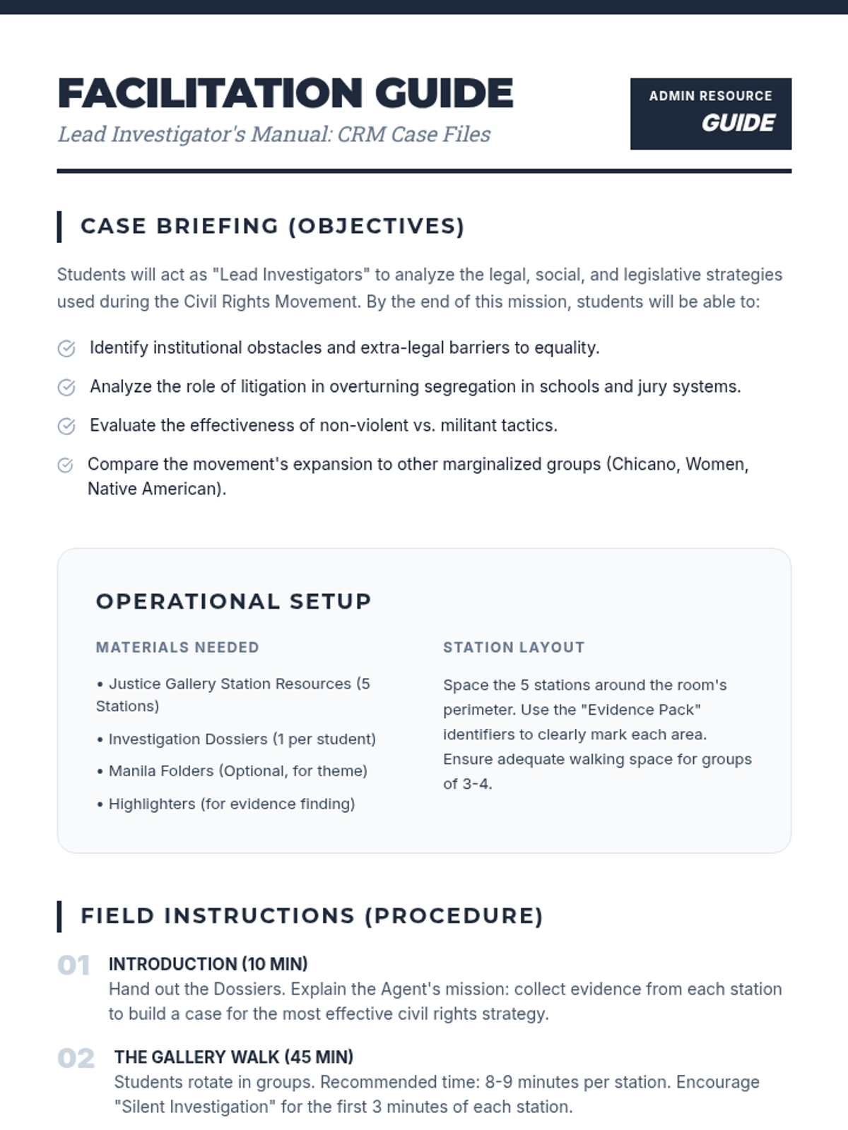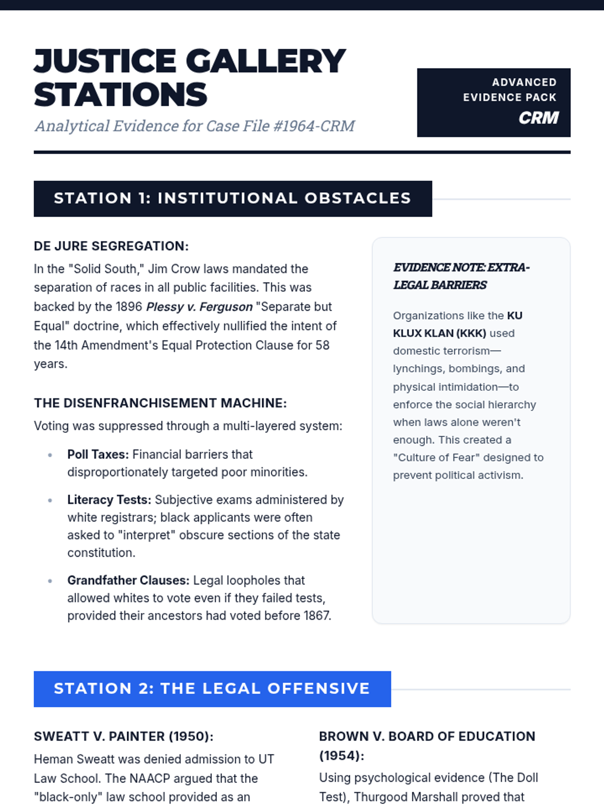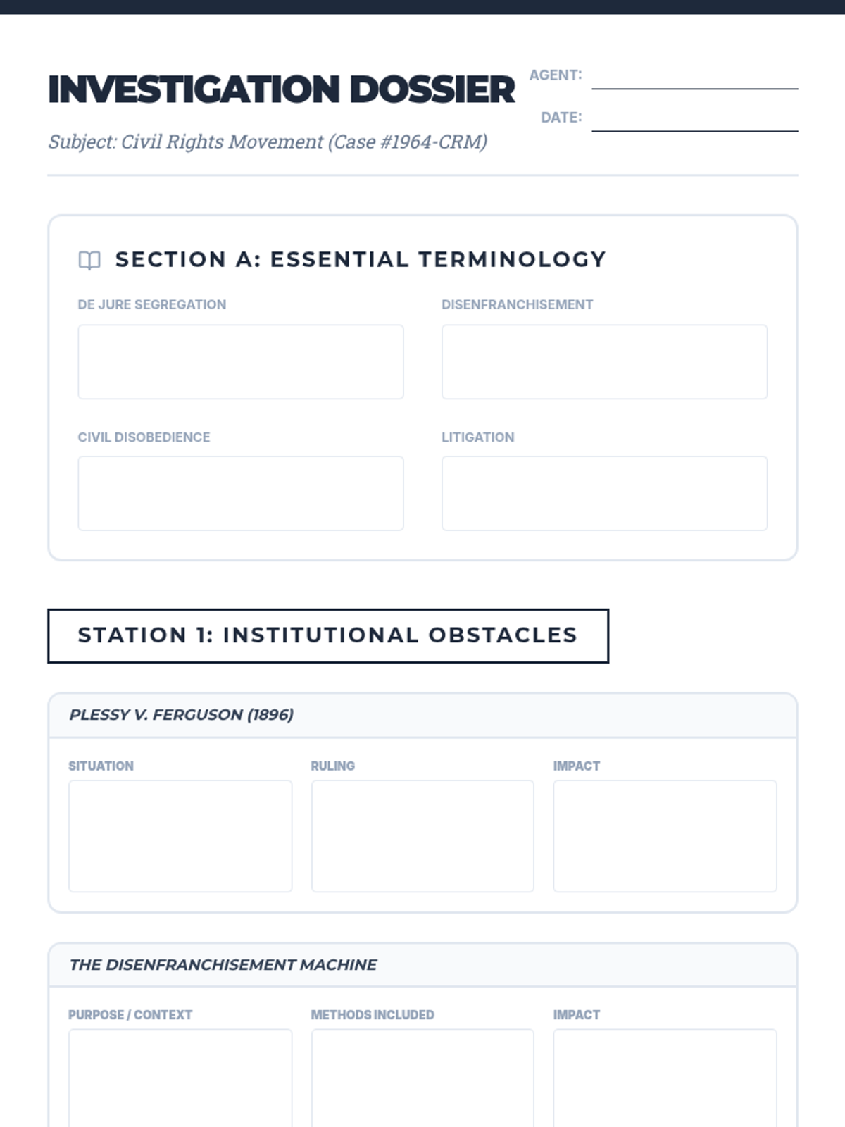 A comprehensive lesson on the Civil Rights Movement featuring gallery stations and a guided investigation worksheet. Students analyze institutional obstacles, legal strategies, non-violent and militant tactics, and the expansion of the movement to other marginalized groups.