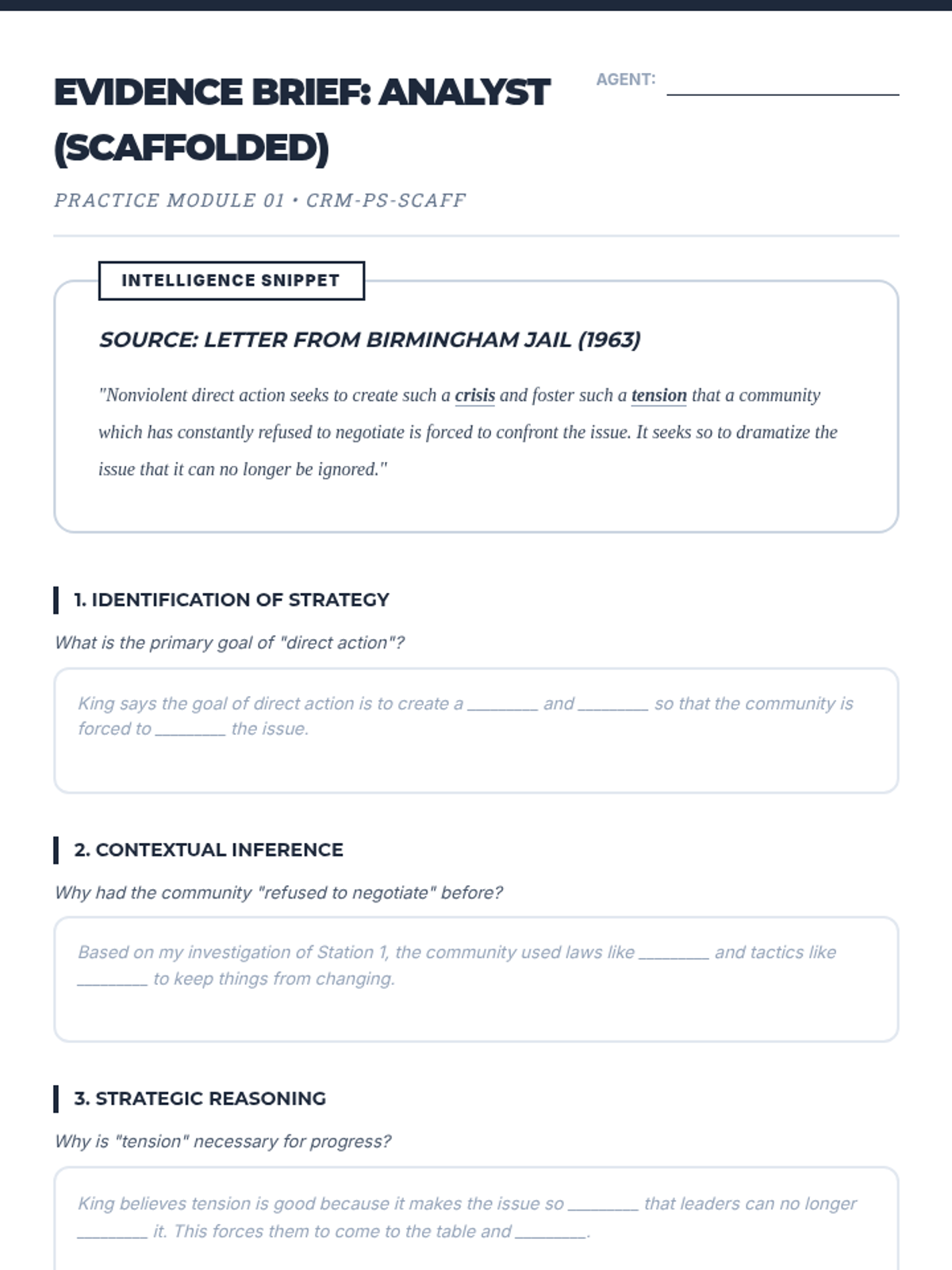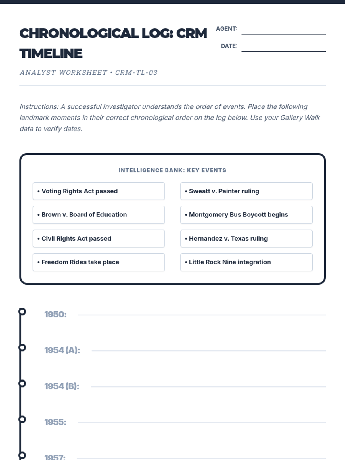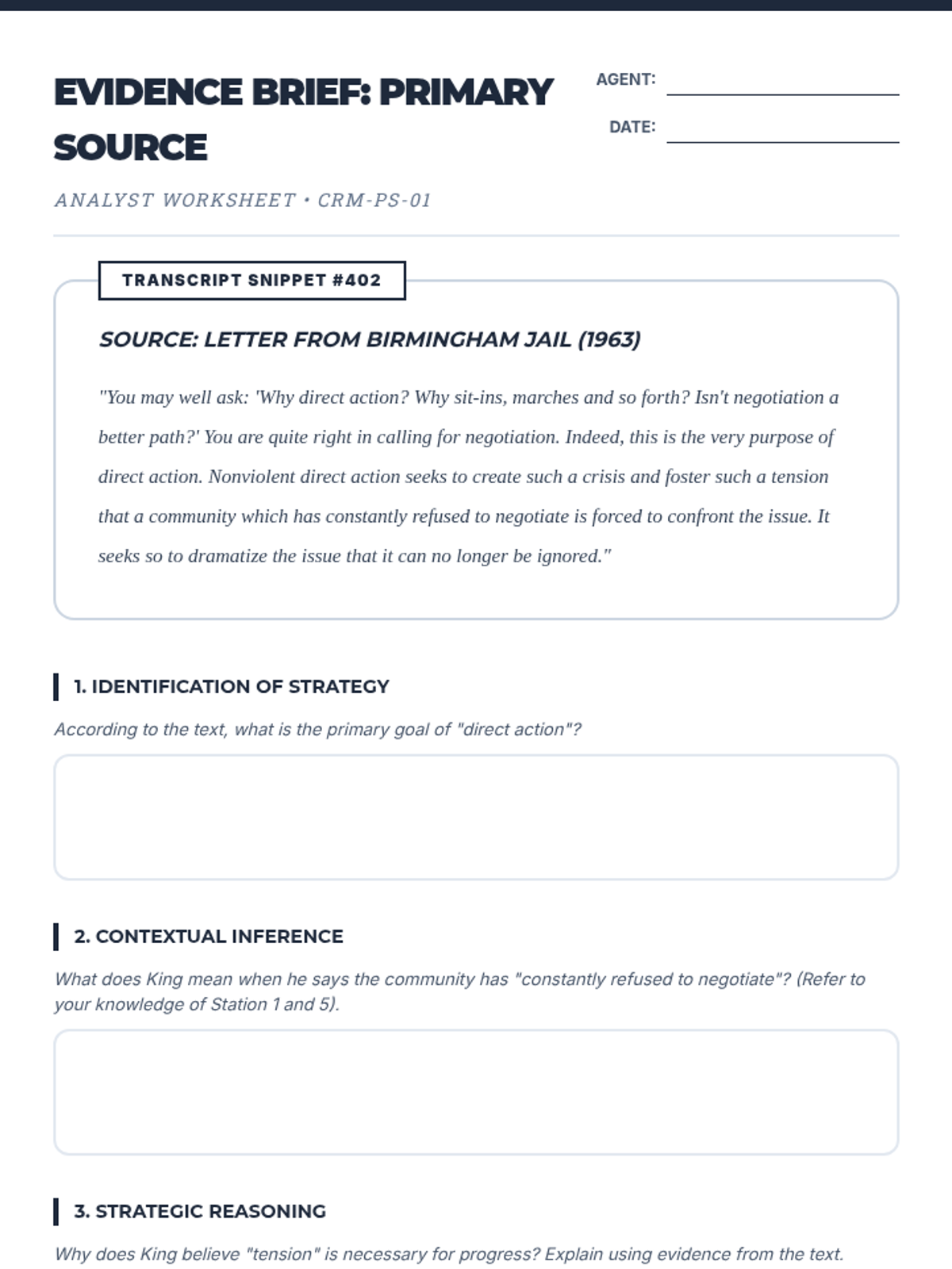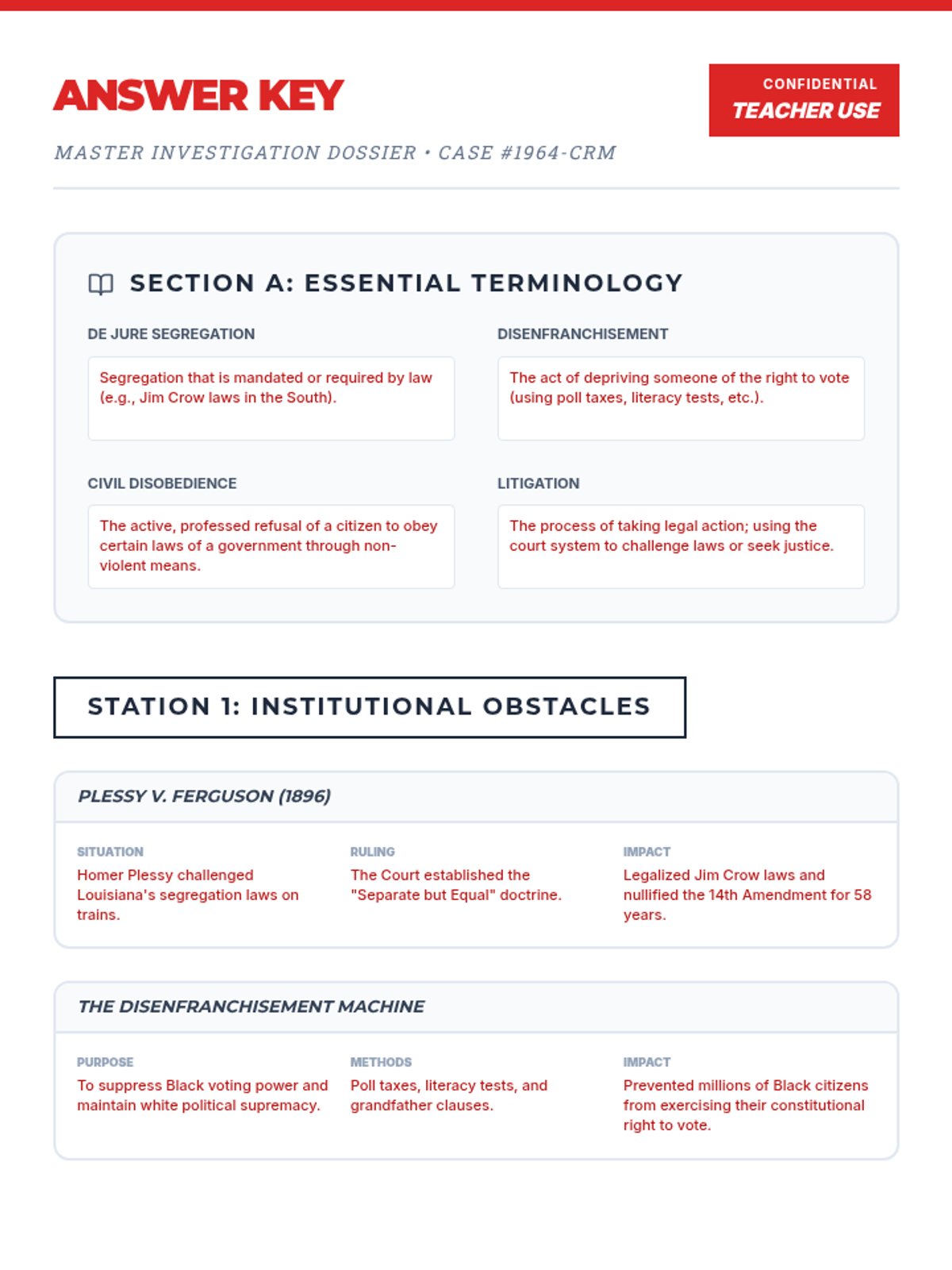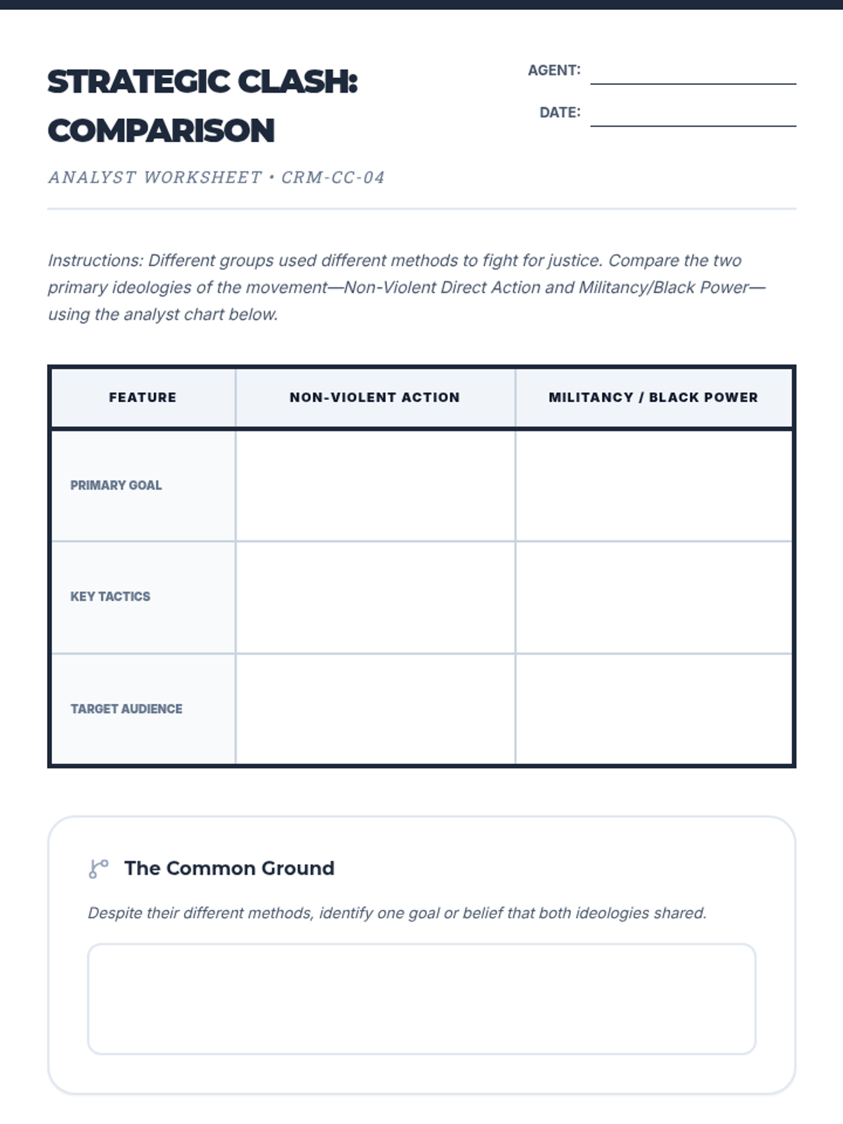 A comprehensive lesson on the Civil Rights Movement featuring gallery stations and a guided investigation worksheet. Students analyze institutional obstacles, legal strategies, non-violent and militant tactics, and the expansion of the movement to other marginalized groups.