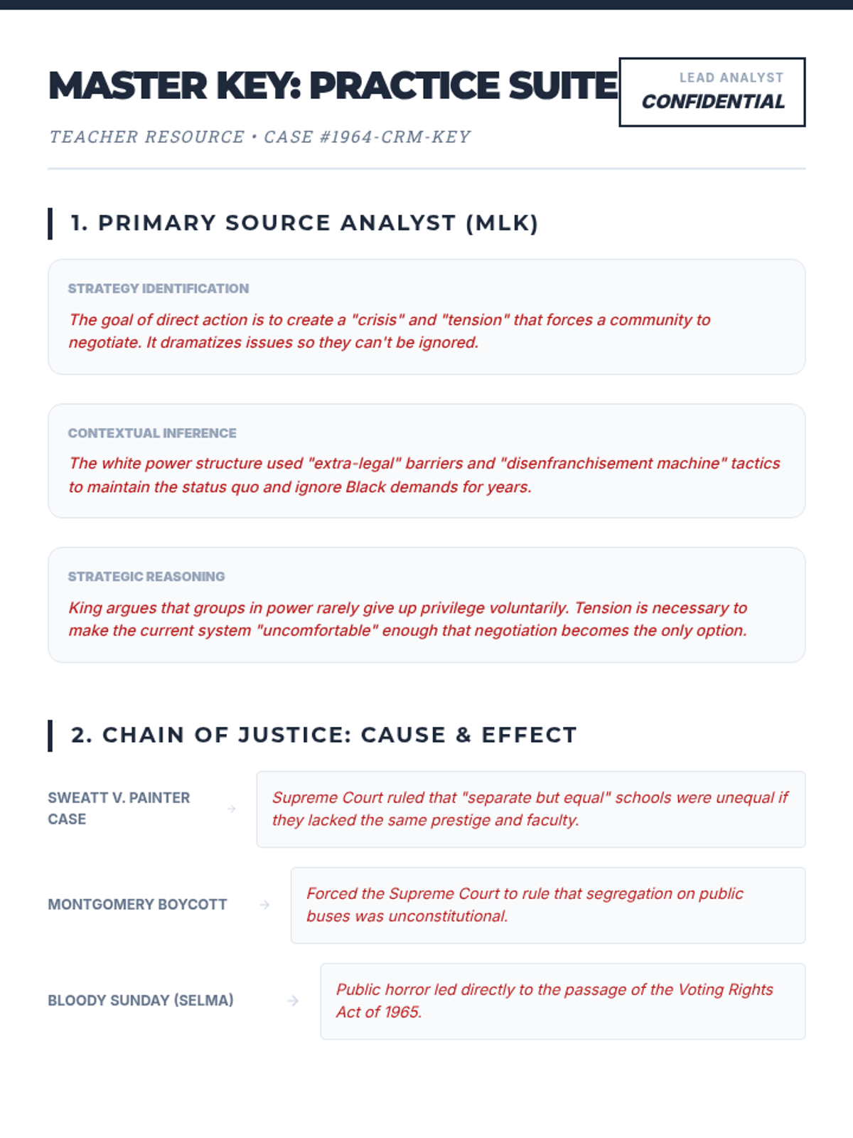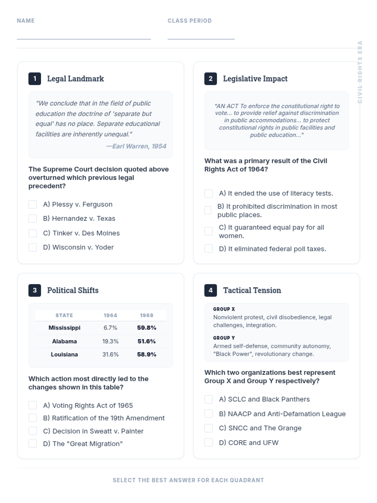 A high-intensity warm-up session focusing on the landmarks of the Civil Rights Movement, from legal victories to grassroots activism.
