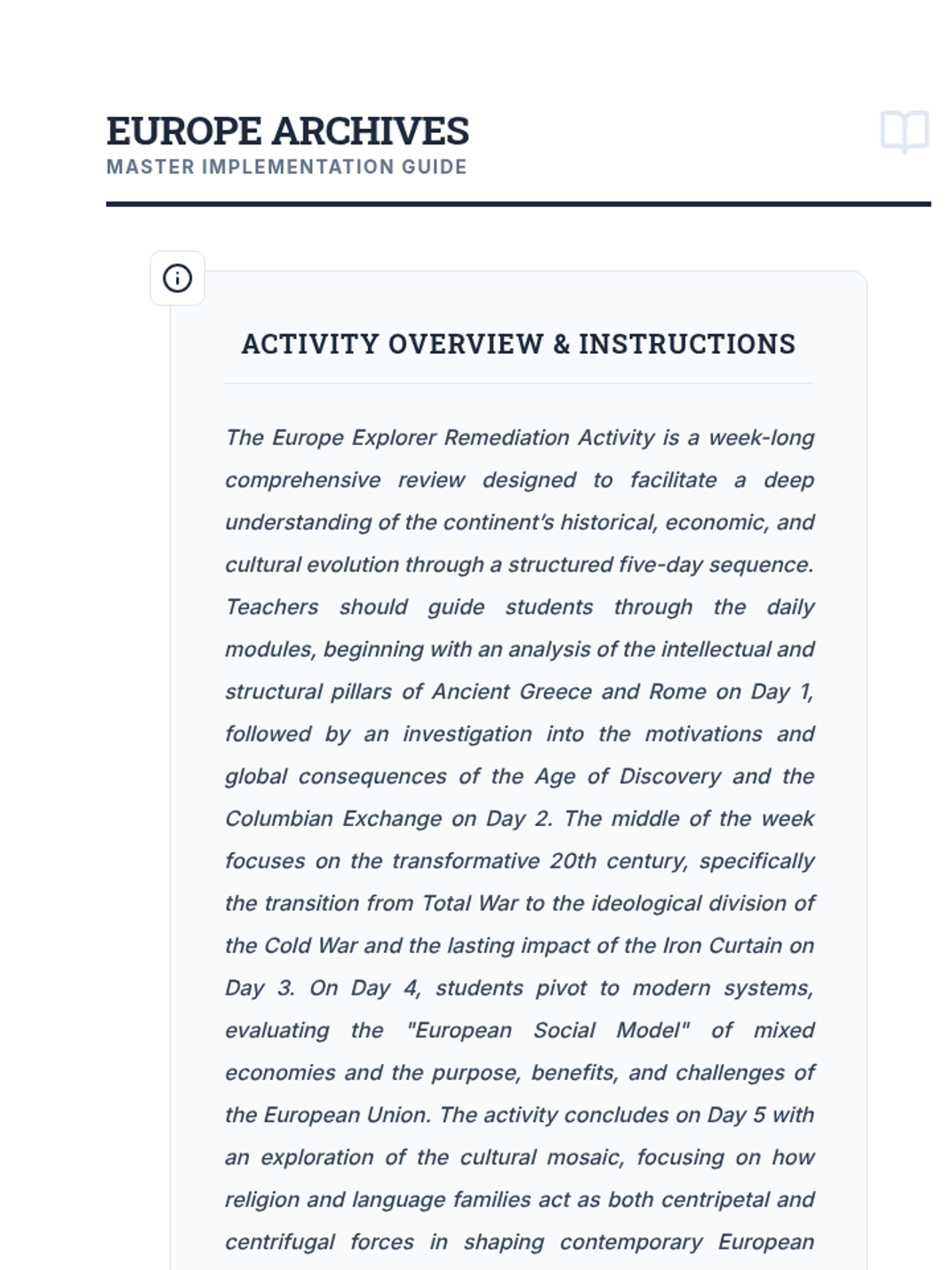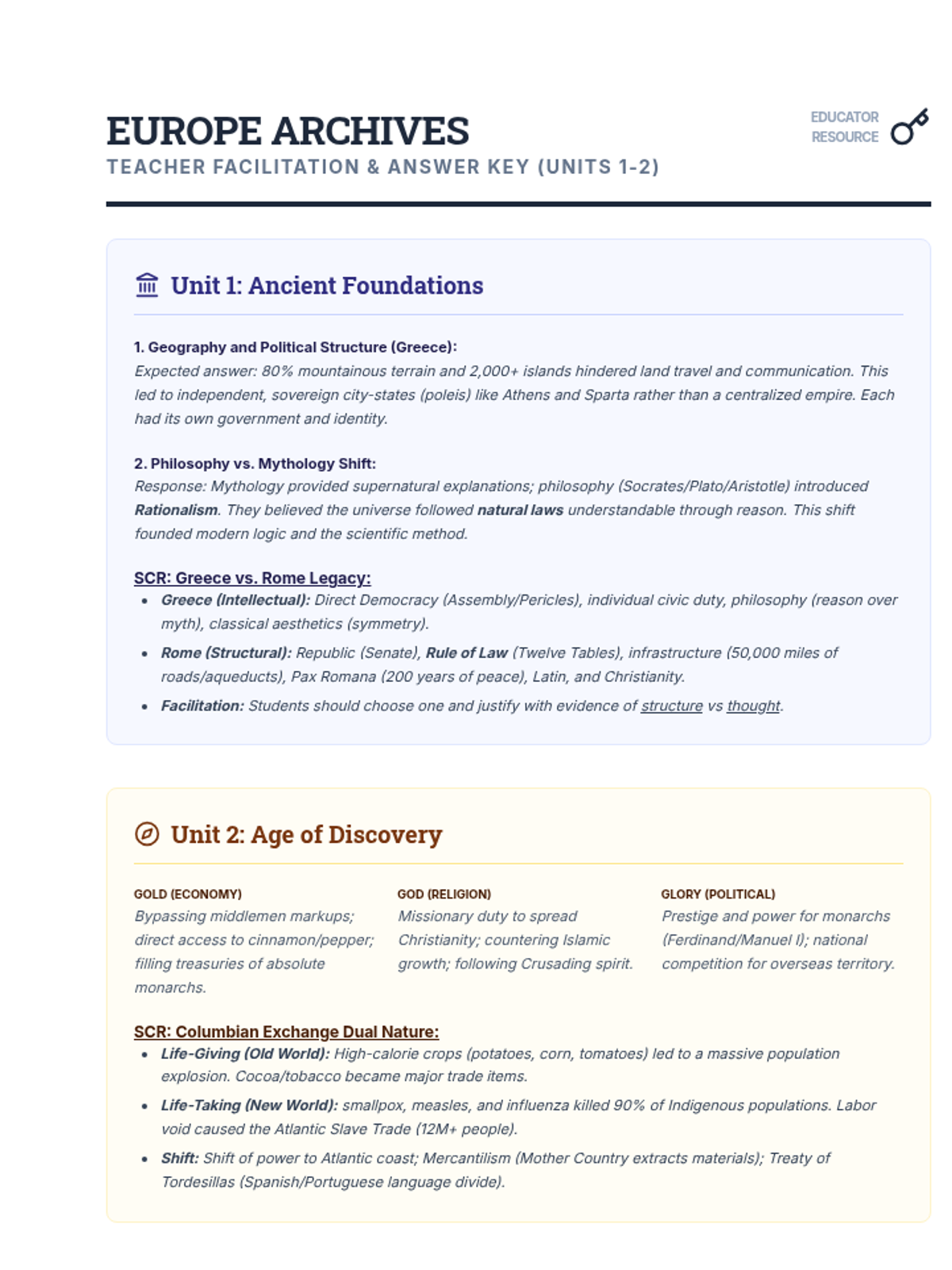 Comprehensive answer keys and teacher facilitation guides for the Europe remediation packet.