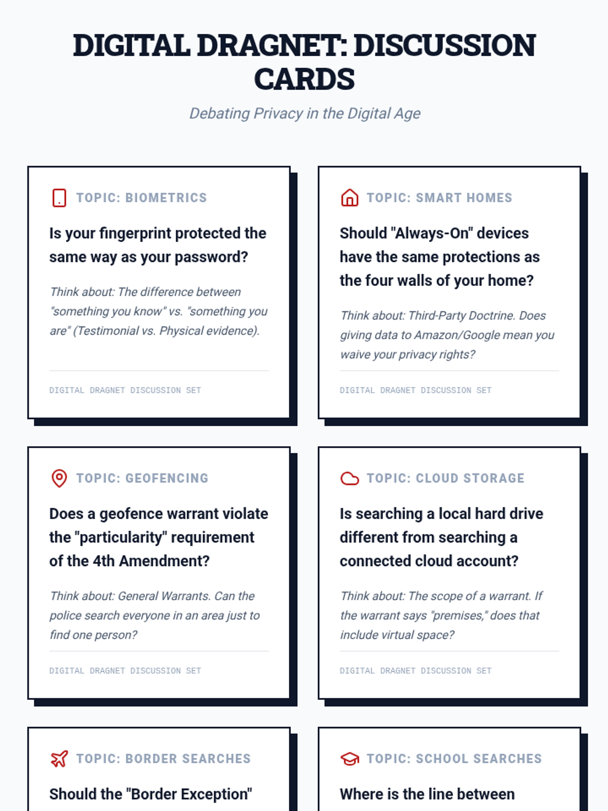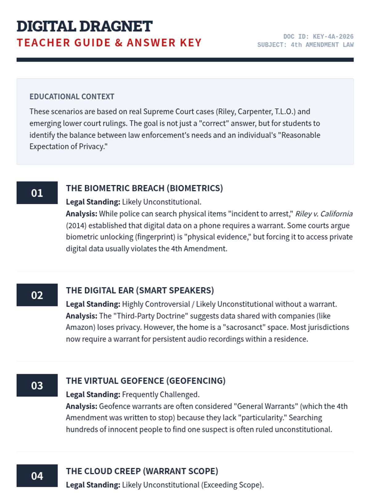 A lesson exploring the complexities of Fourth Amendment protections in the digital age through 10 realistic search warrant scenarios involving electronics. Students will analyze legal dilemmas, identify exceptions, and argue the constitutionality of various search and seizure methods.