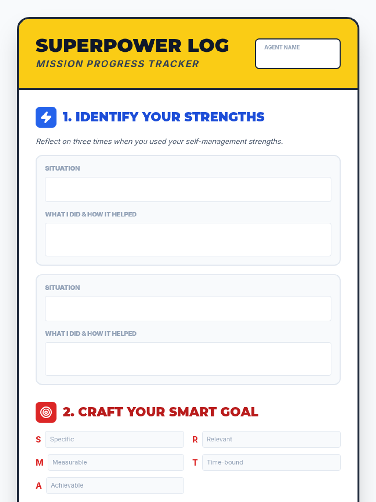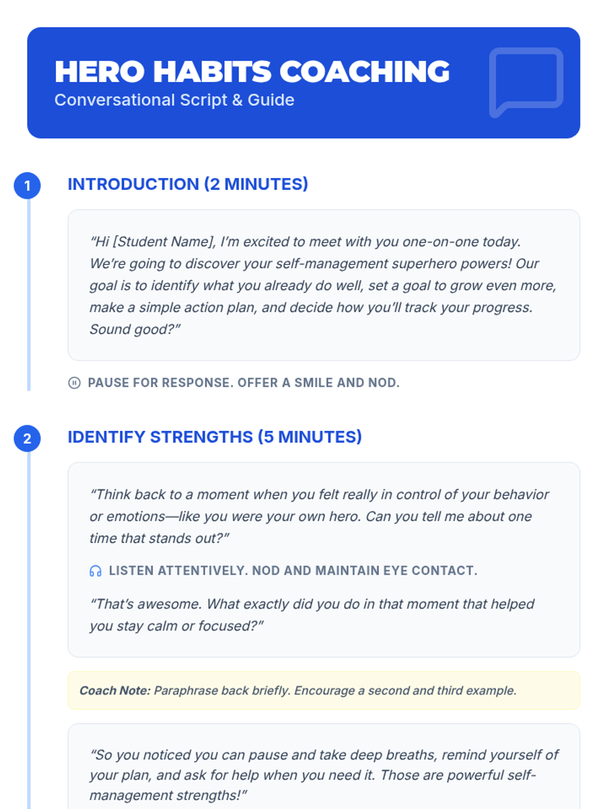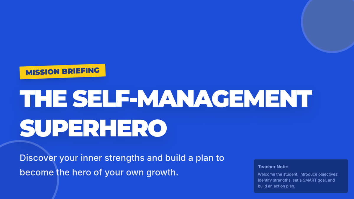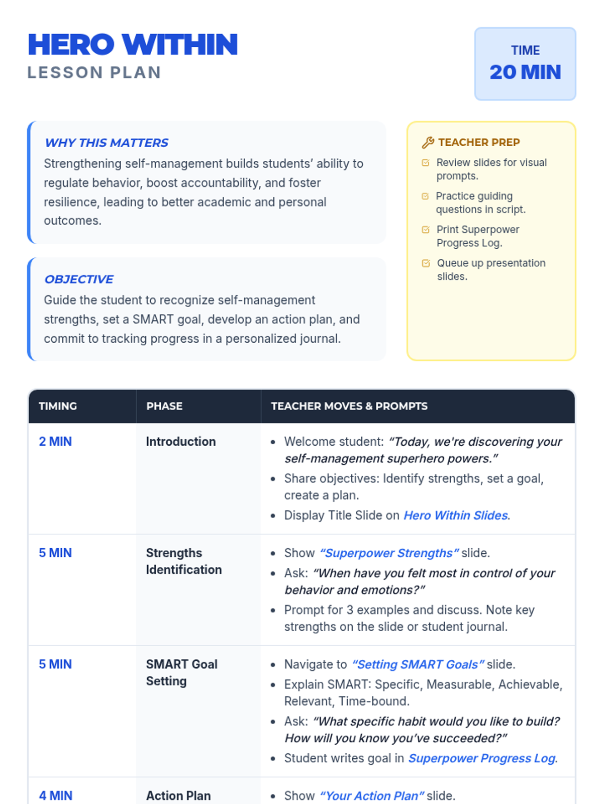 An individualized Tier 3 coaching session for 7th grade students focusing on CASEL's Self-Management competency. This 20-minute session uses a superhero theme to help students identify strengths, set SMART goals, and create actionable plans for behavior and emotion regulation.