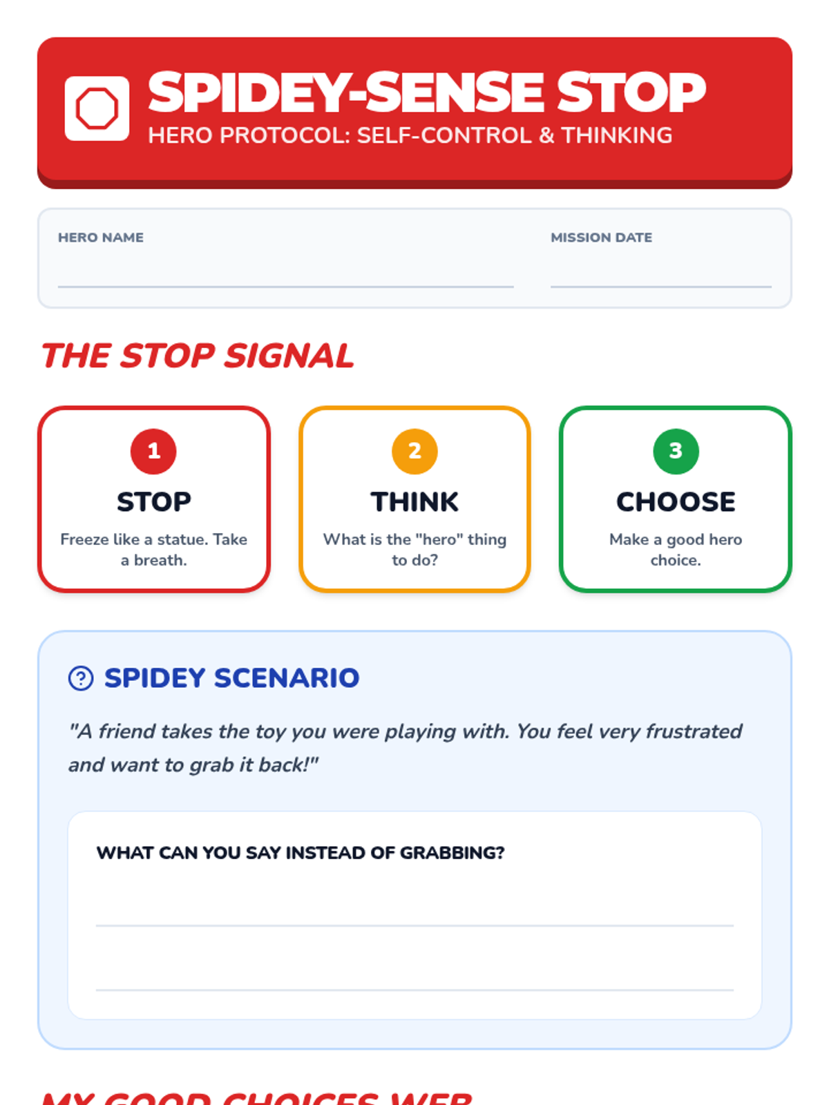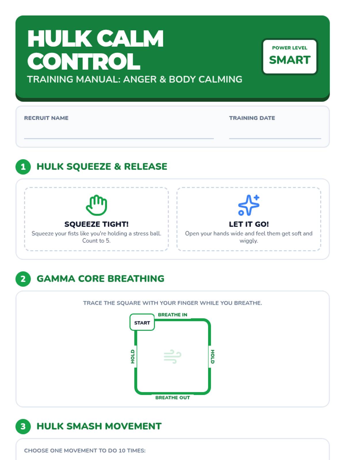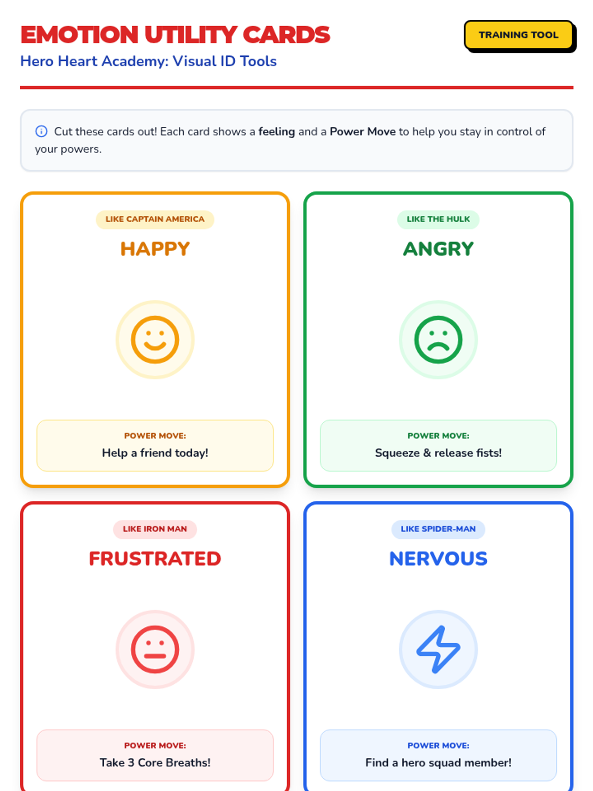 A social-emotional learning lesson using Marvel-inspired characters to teach kindergarten students how to identify emotions and use specific coping skills like deep breathing, muscle relaxation, and positive self-talk.
