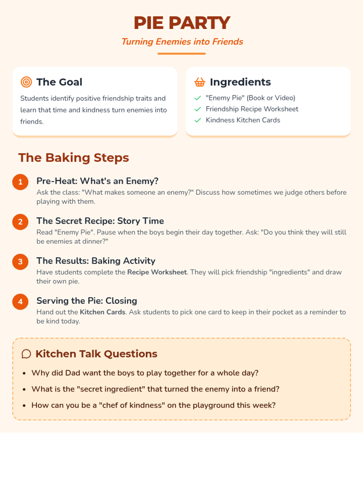 A school counseling lesson for 2nd graders based on the book 'Enemy Pie'. Students explore how to turn enemies into friends through kindness, shared time, and positive friendship 'ingredients'.