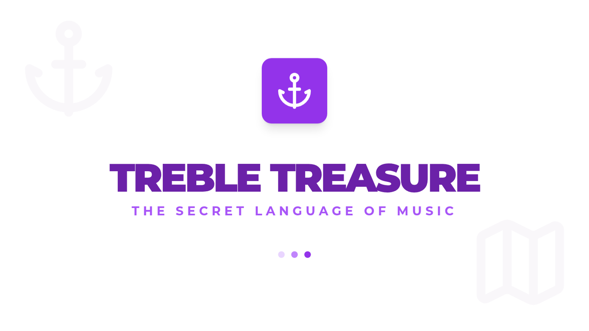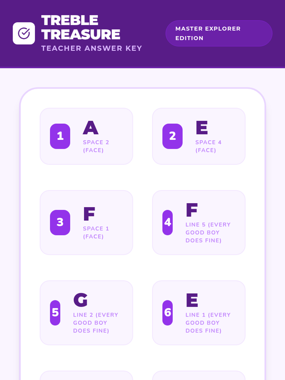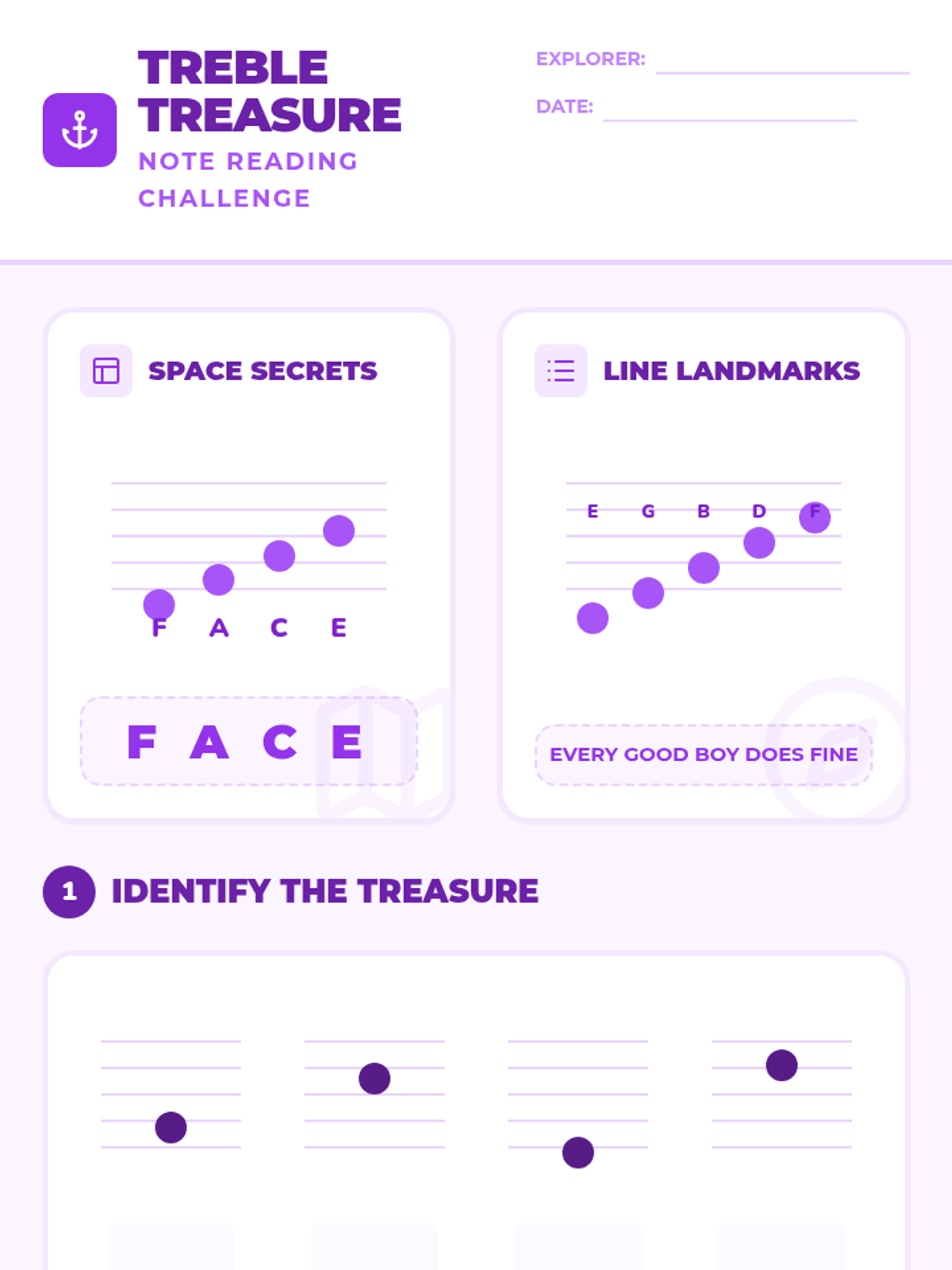 An introductory lesson on reading treble clef notes using the FACE and 'Every Good Boy Does Fine' mnemonics, redesigned with a purple treasure hunt theme.