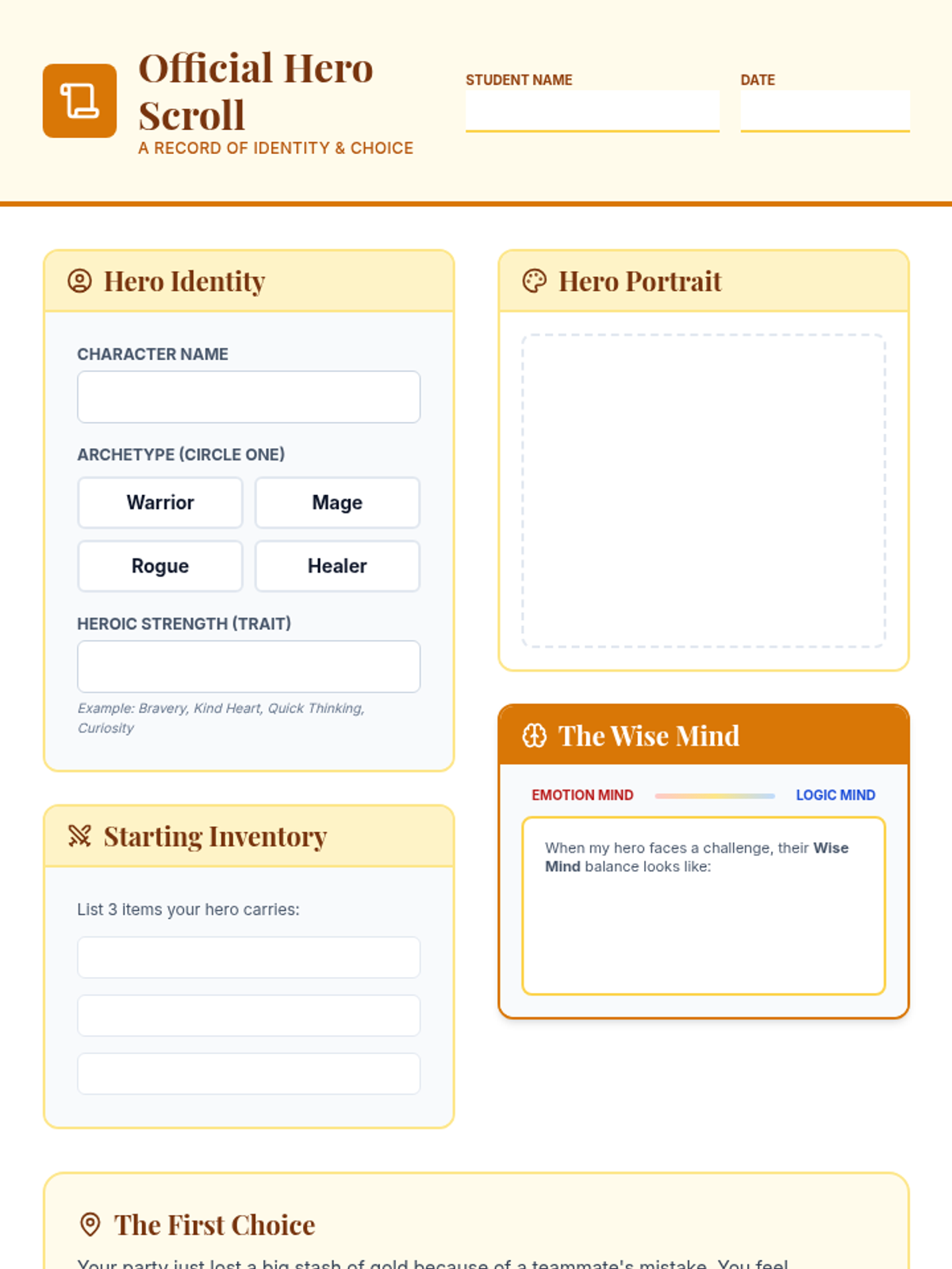 A 20-minute introductory lesson where students create a D&D-style hero and learn the 'Wise Mind' concept for balanced decision-making.