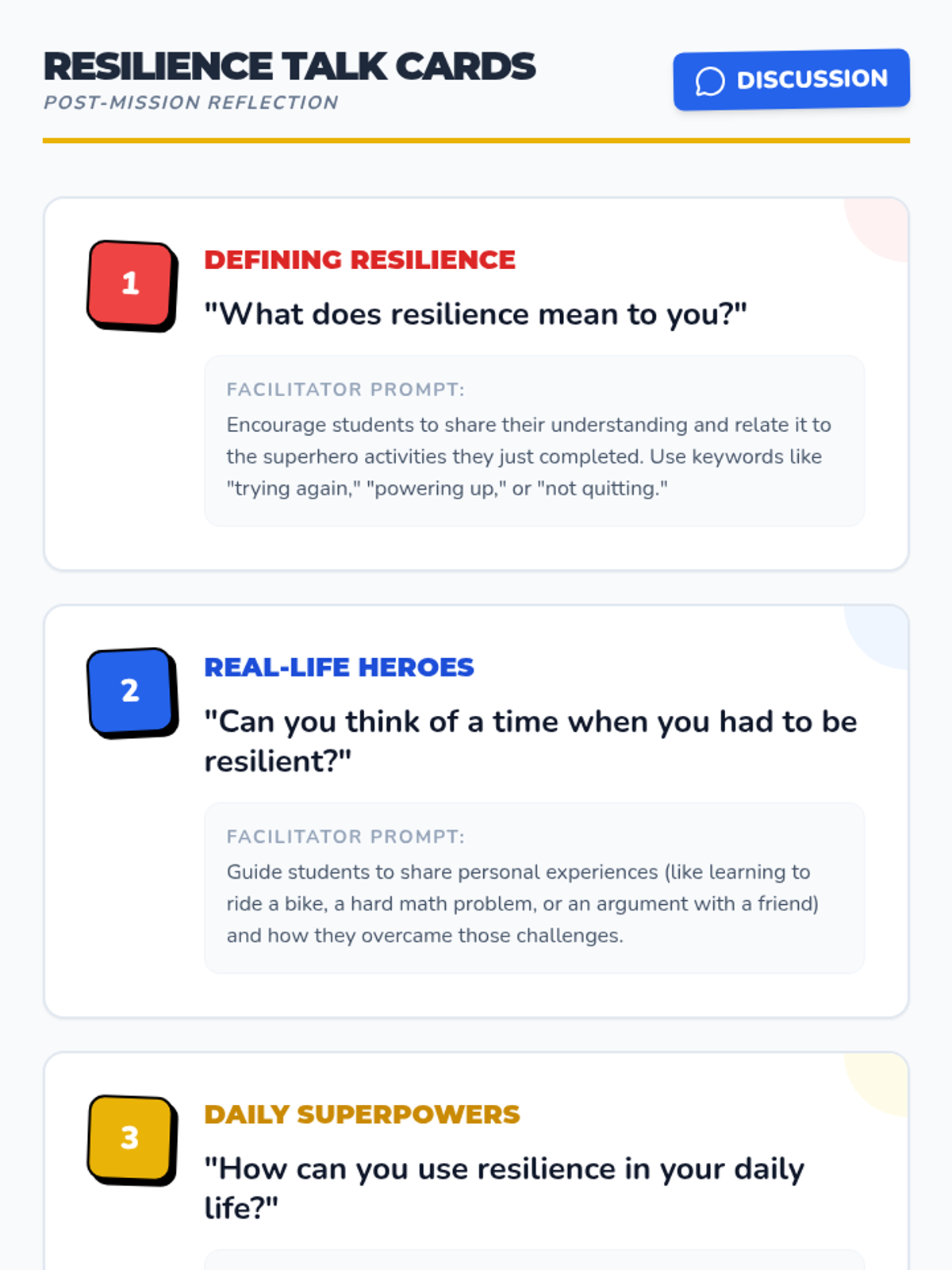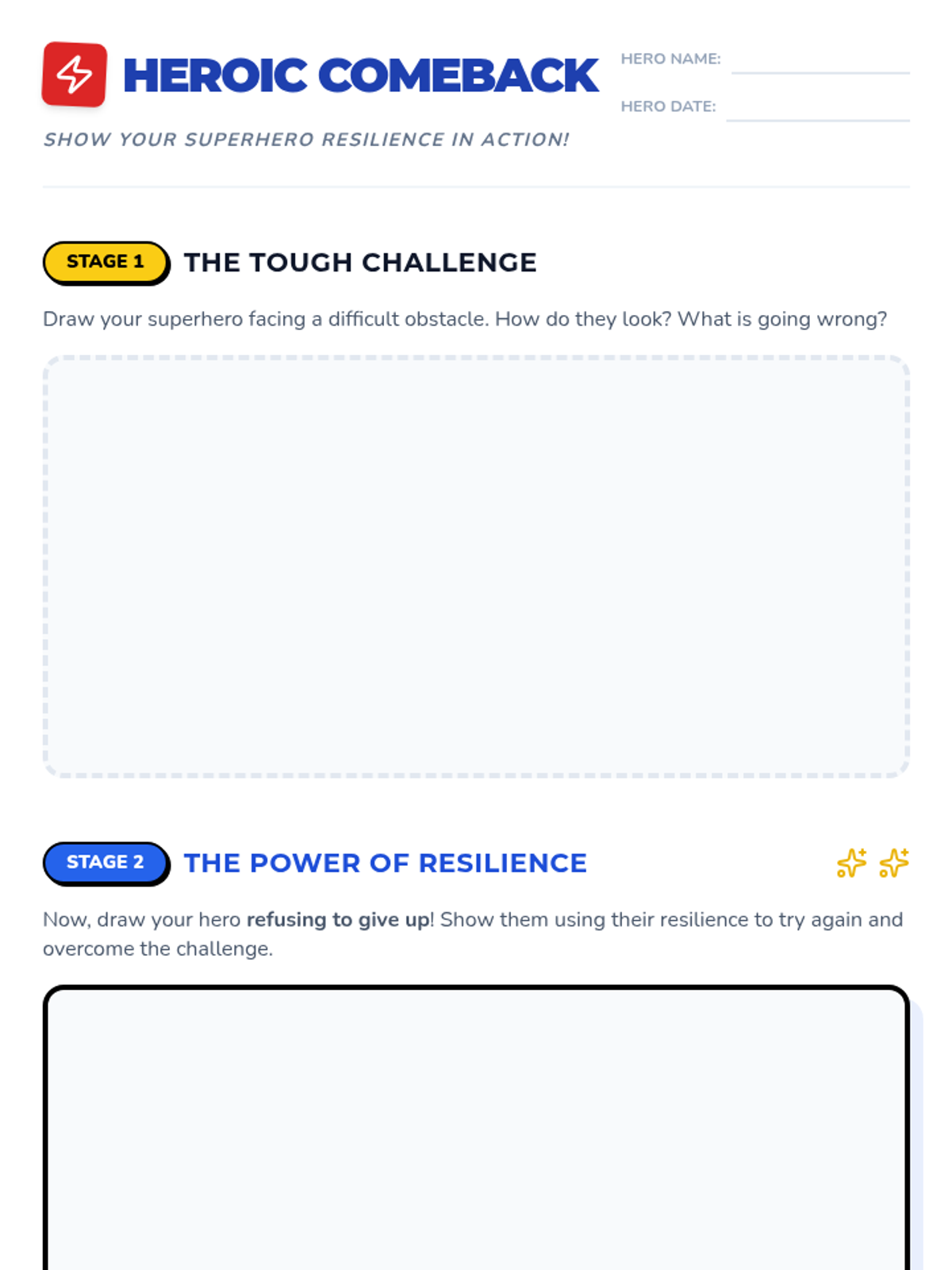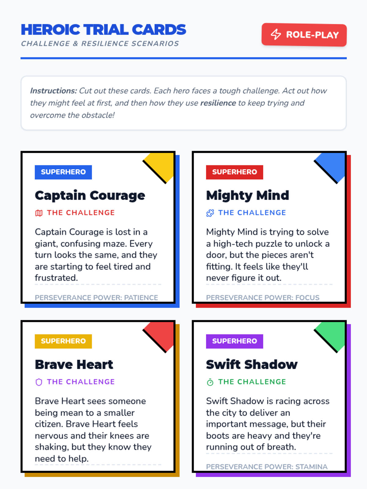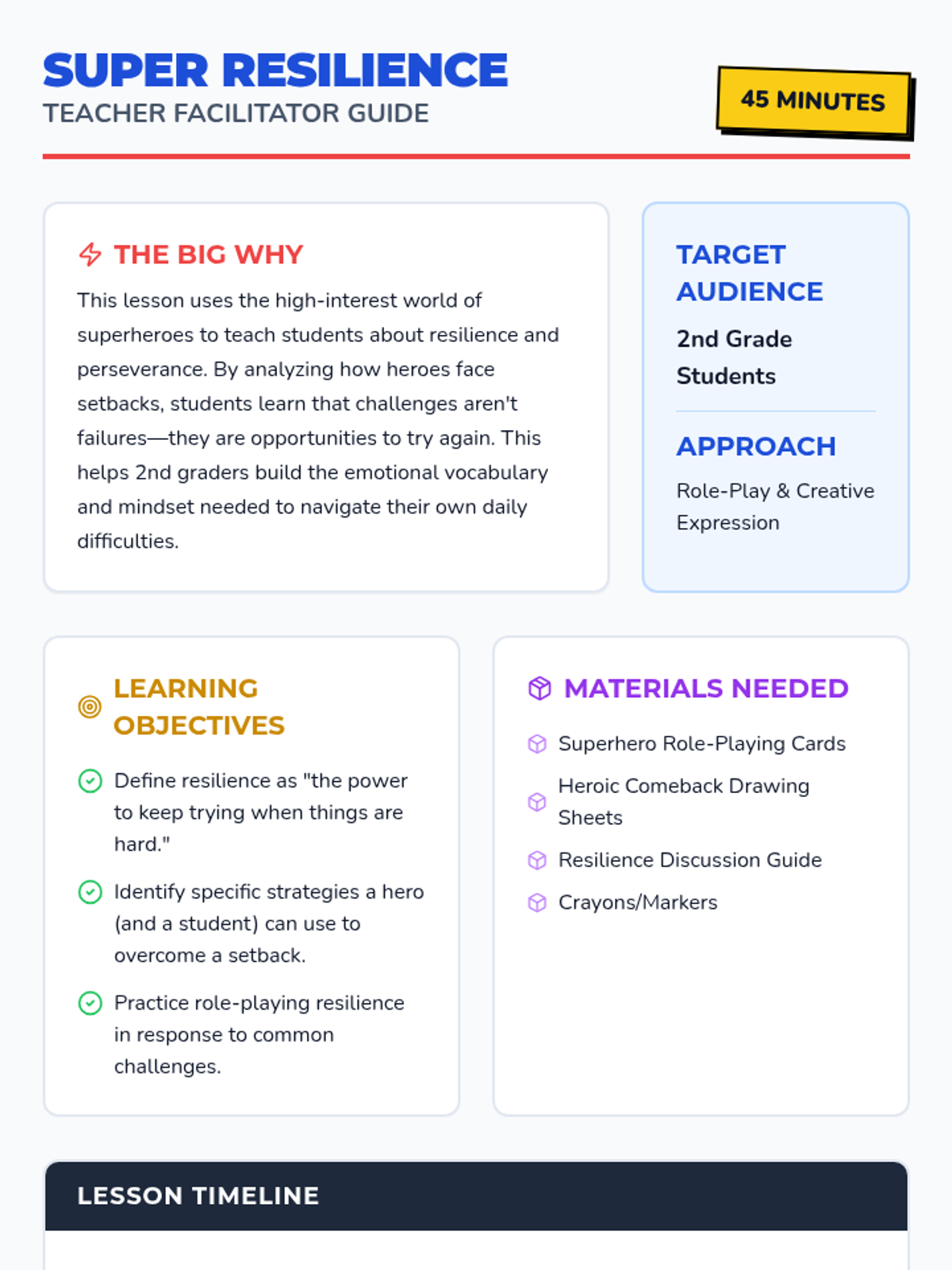 A high-energy lesson using superhero narratives to teach 2nd-grade students about resilience and perseverance through role-play and creative expression.