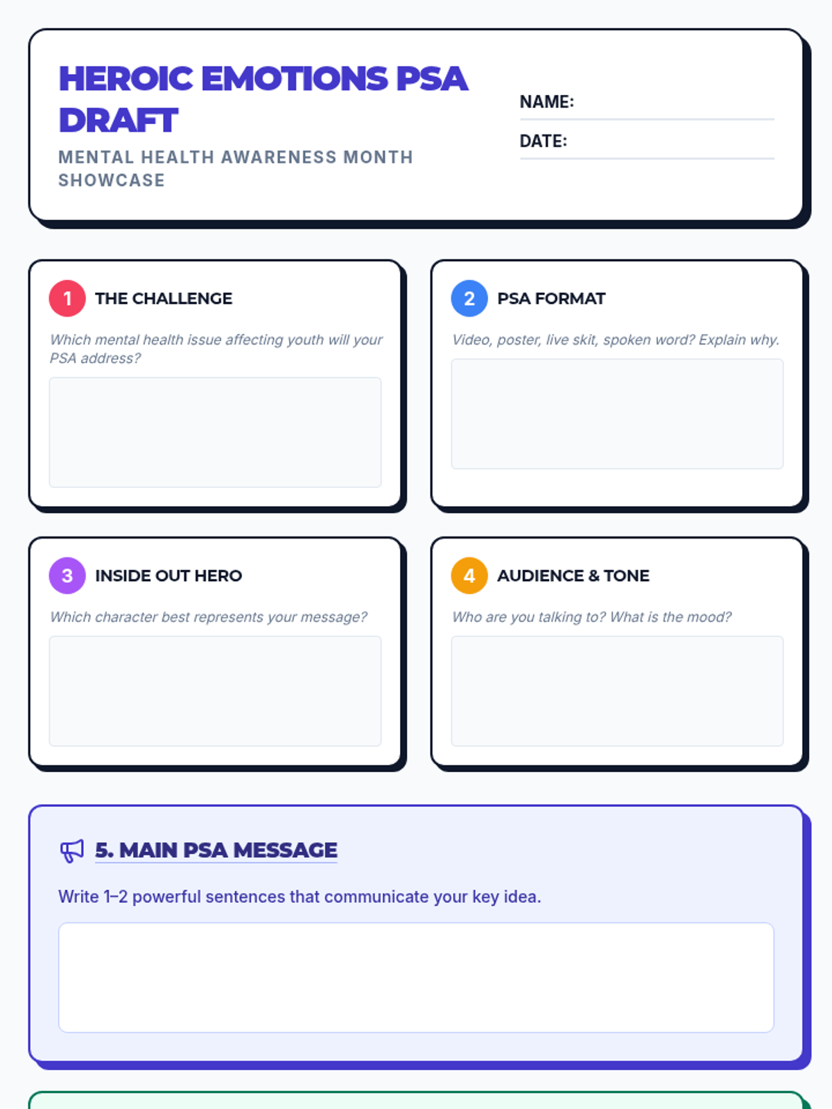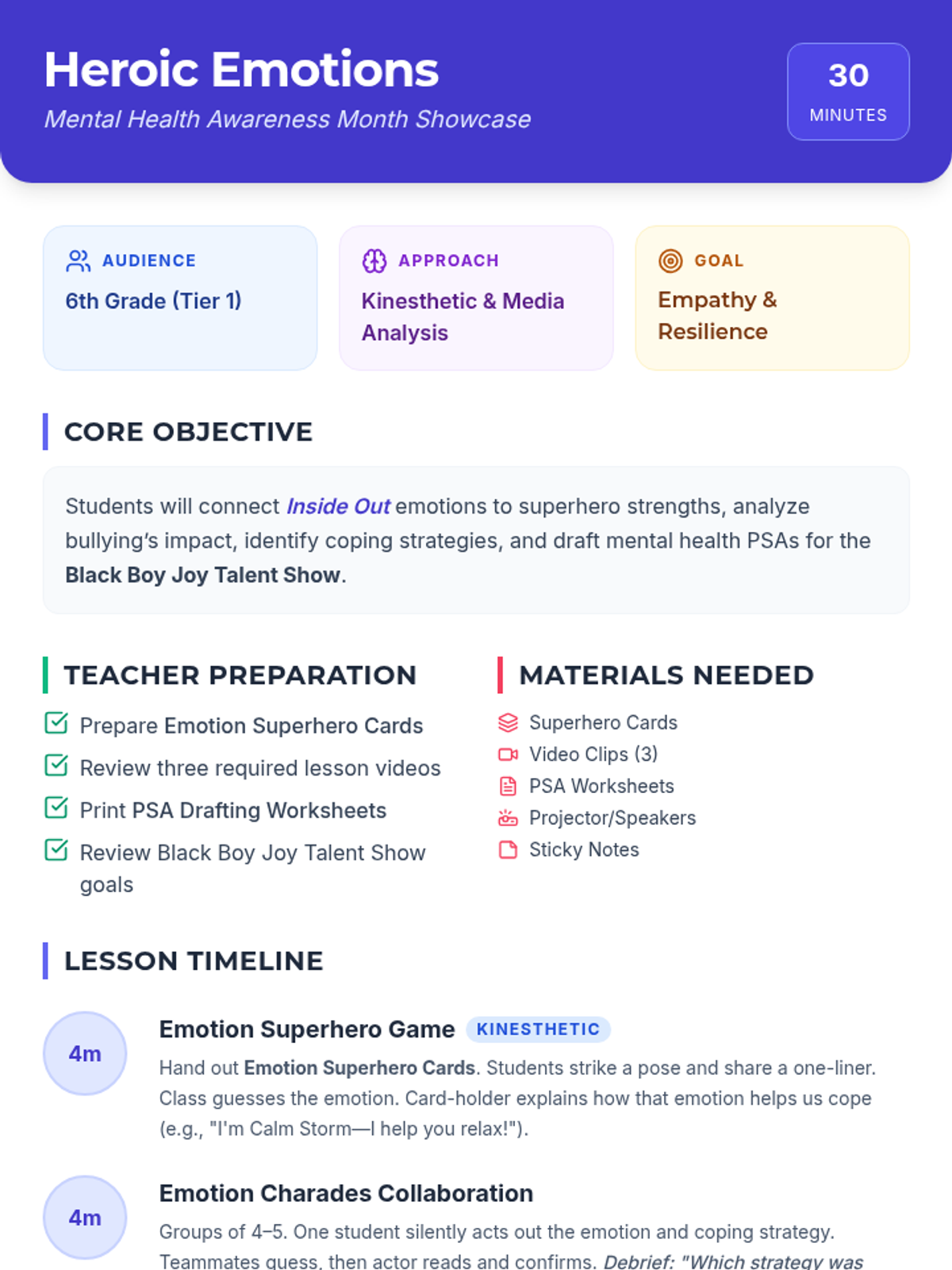 A 30-minute Tier 1 SEL lesson for 6th graders that connects Inside Out emotions to superhero strengths, helping students develop coping skills and draft mental health PSAs for the Black Boy Joy Talent Show.