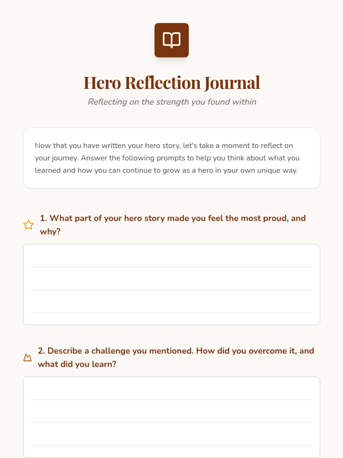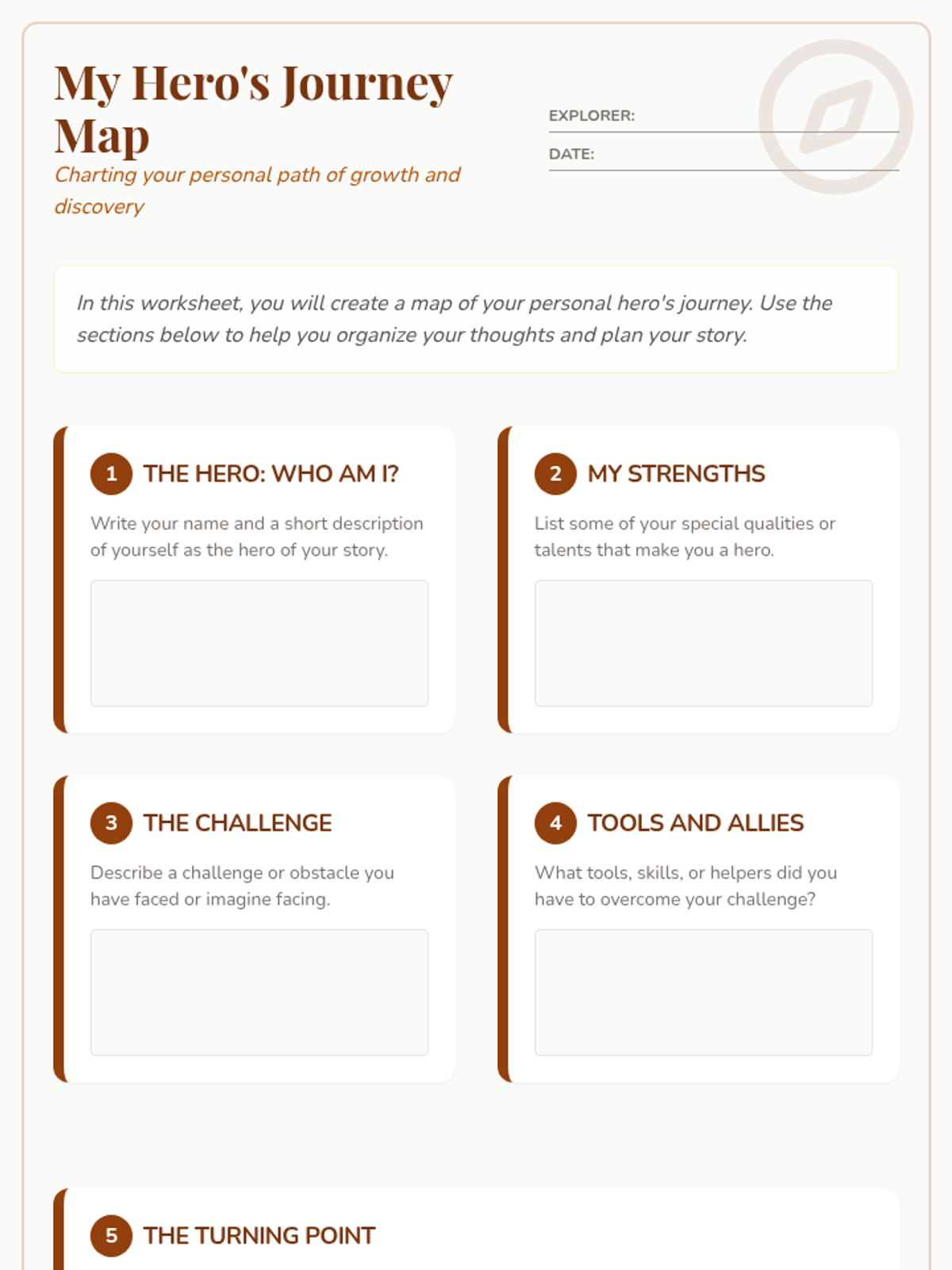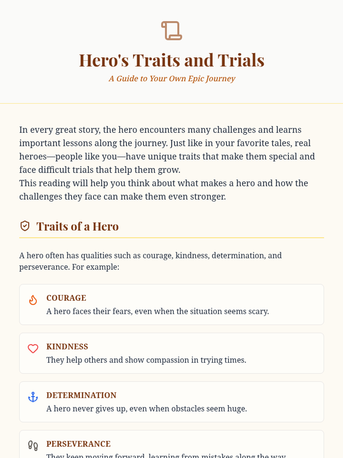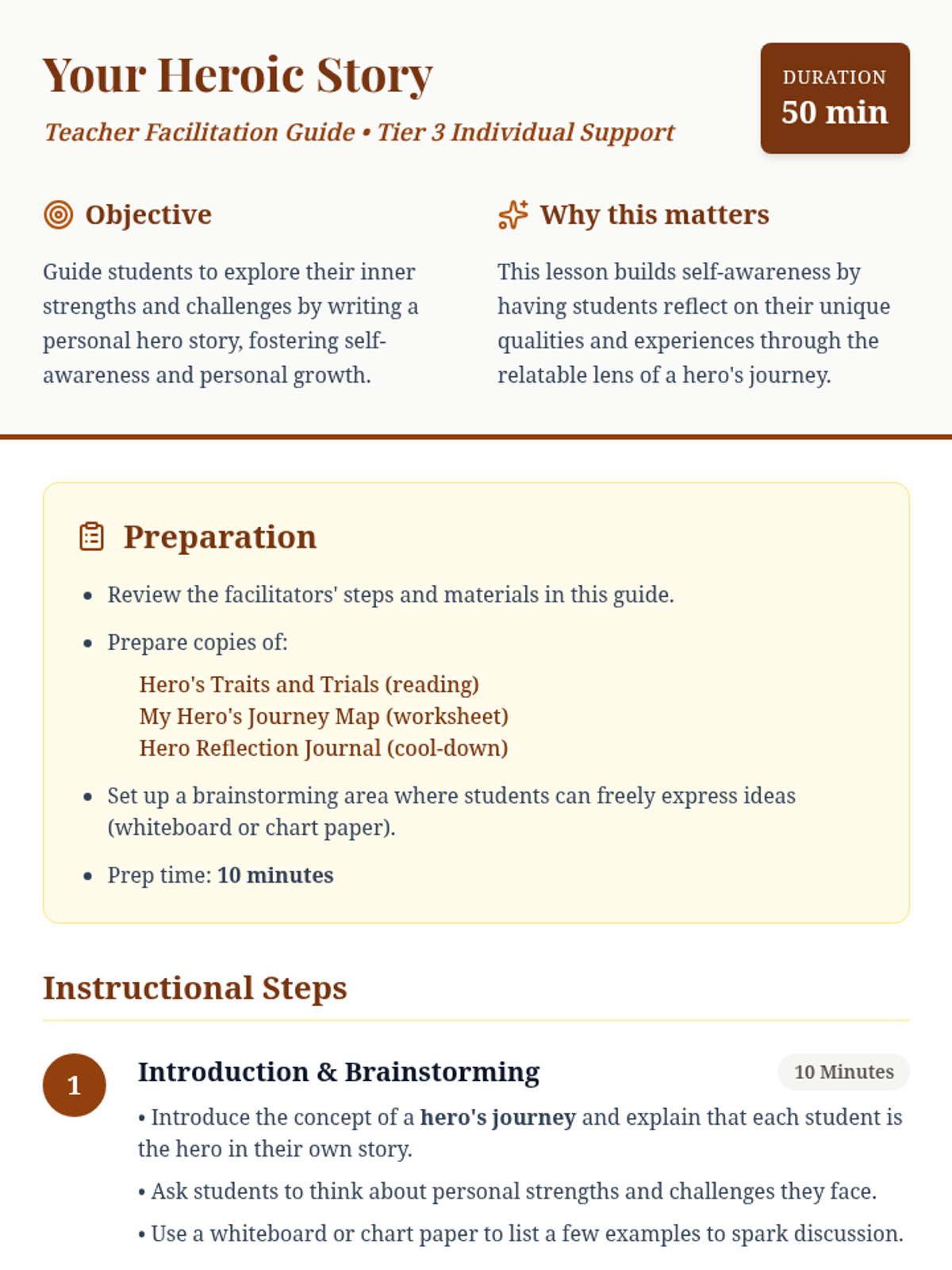 A 50-minute Tier 3 individual support lesson for 4th graders to develop self-awareness by mapping their own 'hero's journey' through strengths and challenges.