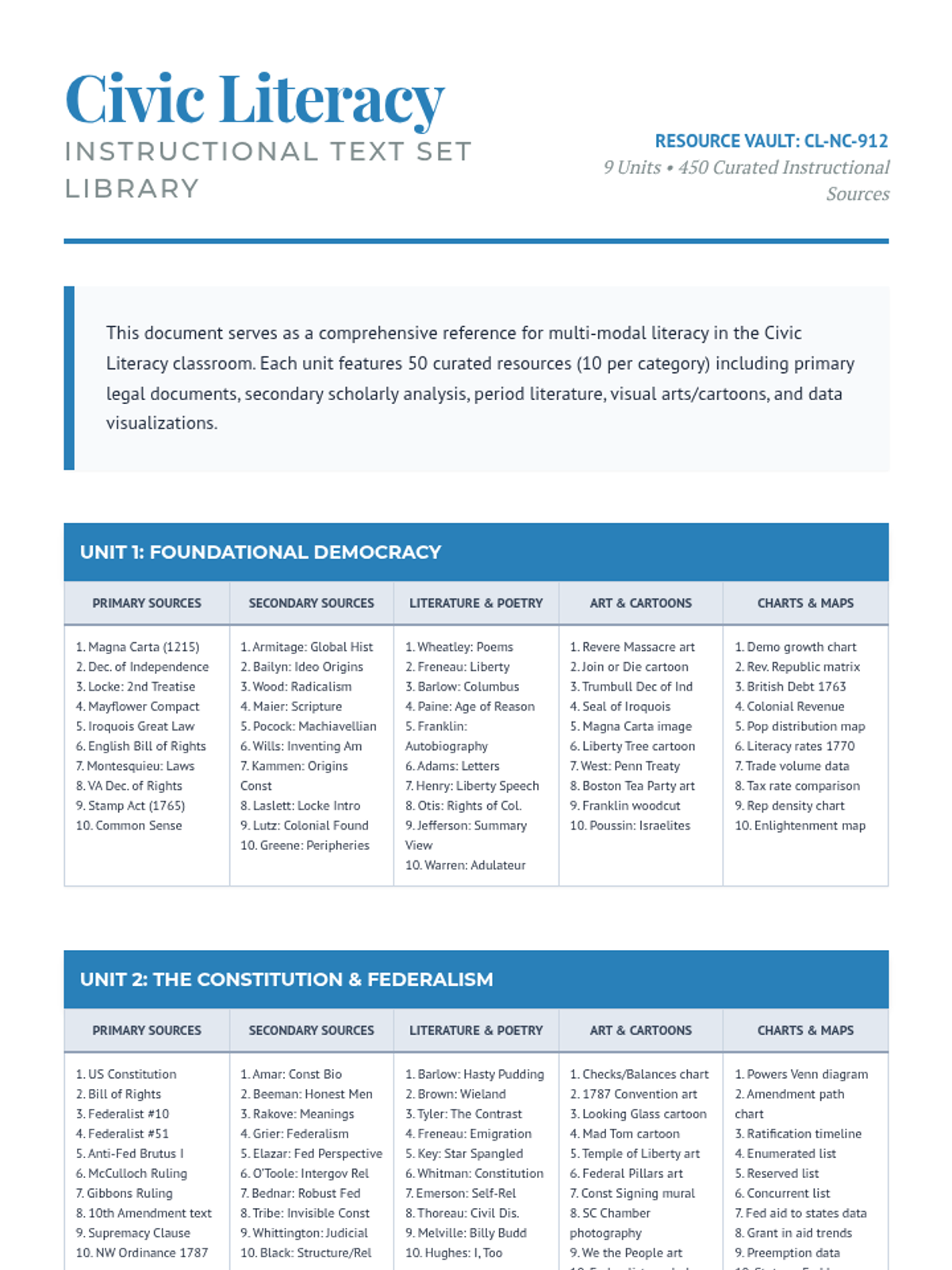 A master curriculum framework for Civic Literacy that defines standards, objectives, skills, learning goals, and vocabulary for thirteen instructional units.