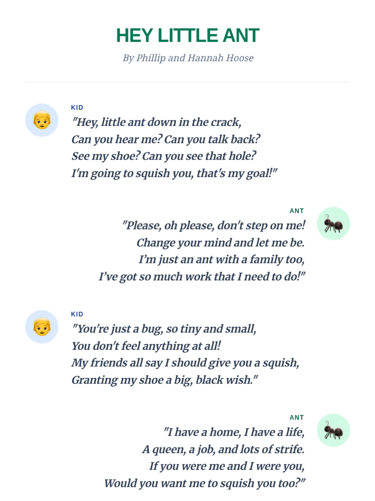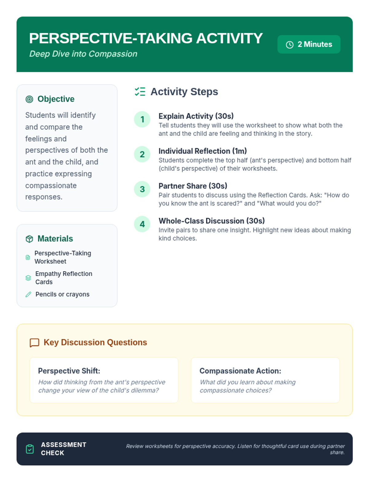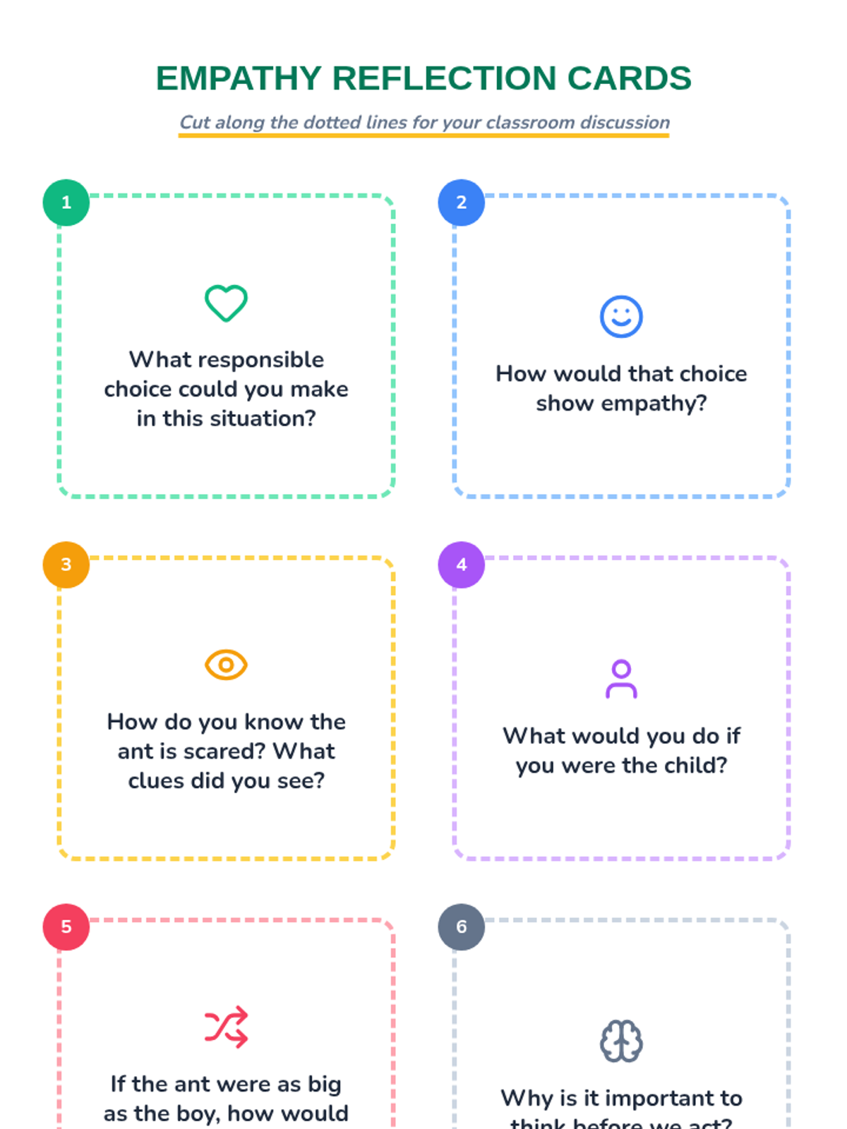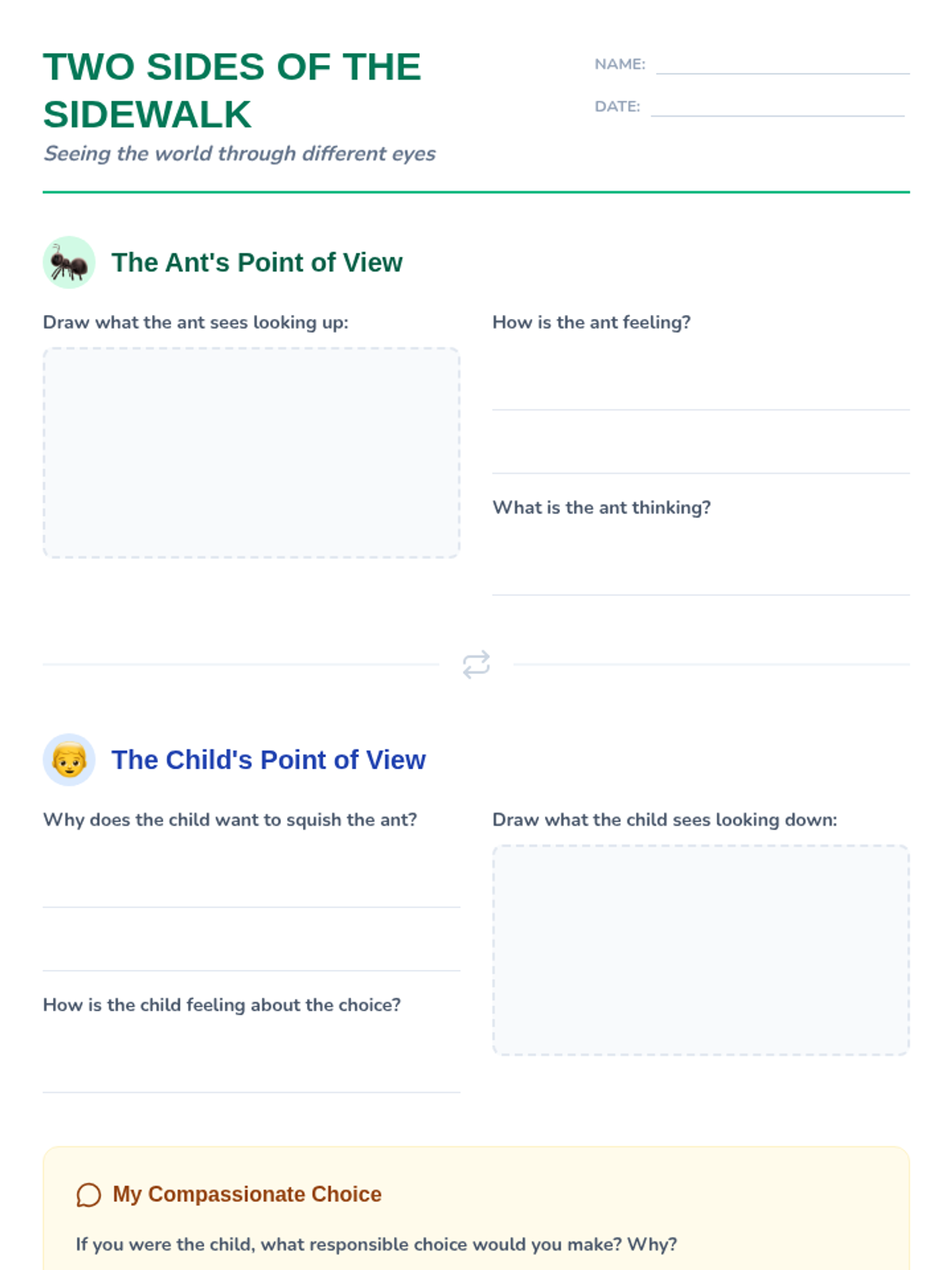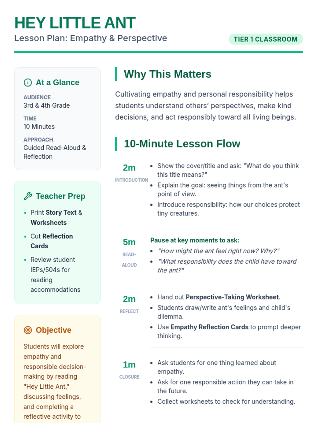 A quick 10-minute lesson for 3rd and 4th graders exploring empathy and perspective-taking through the rhyming dialogue of 'Hey Little Ant'. Students practice seeing the world through different eyes to make responsible choices.