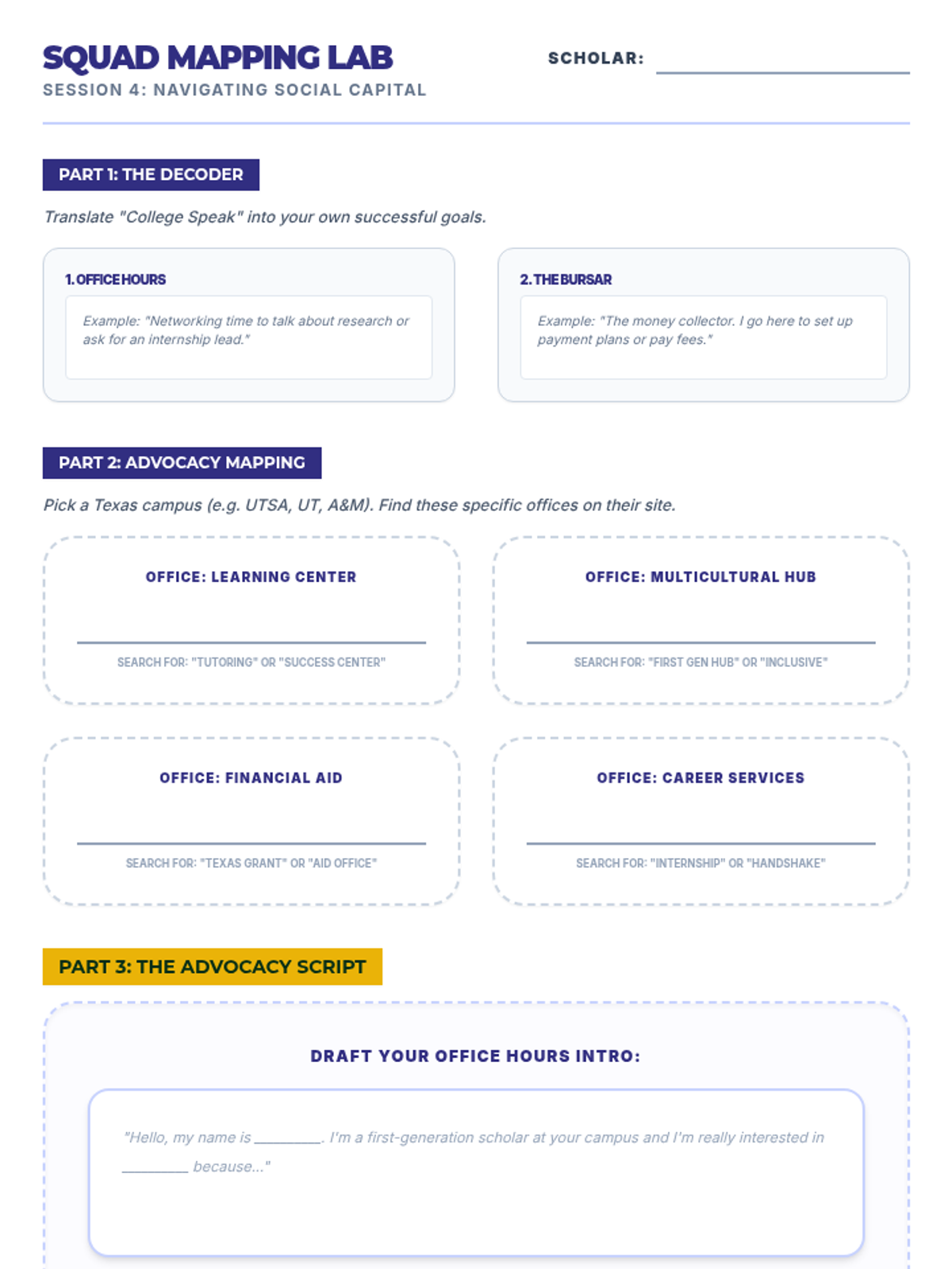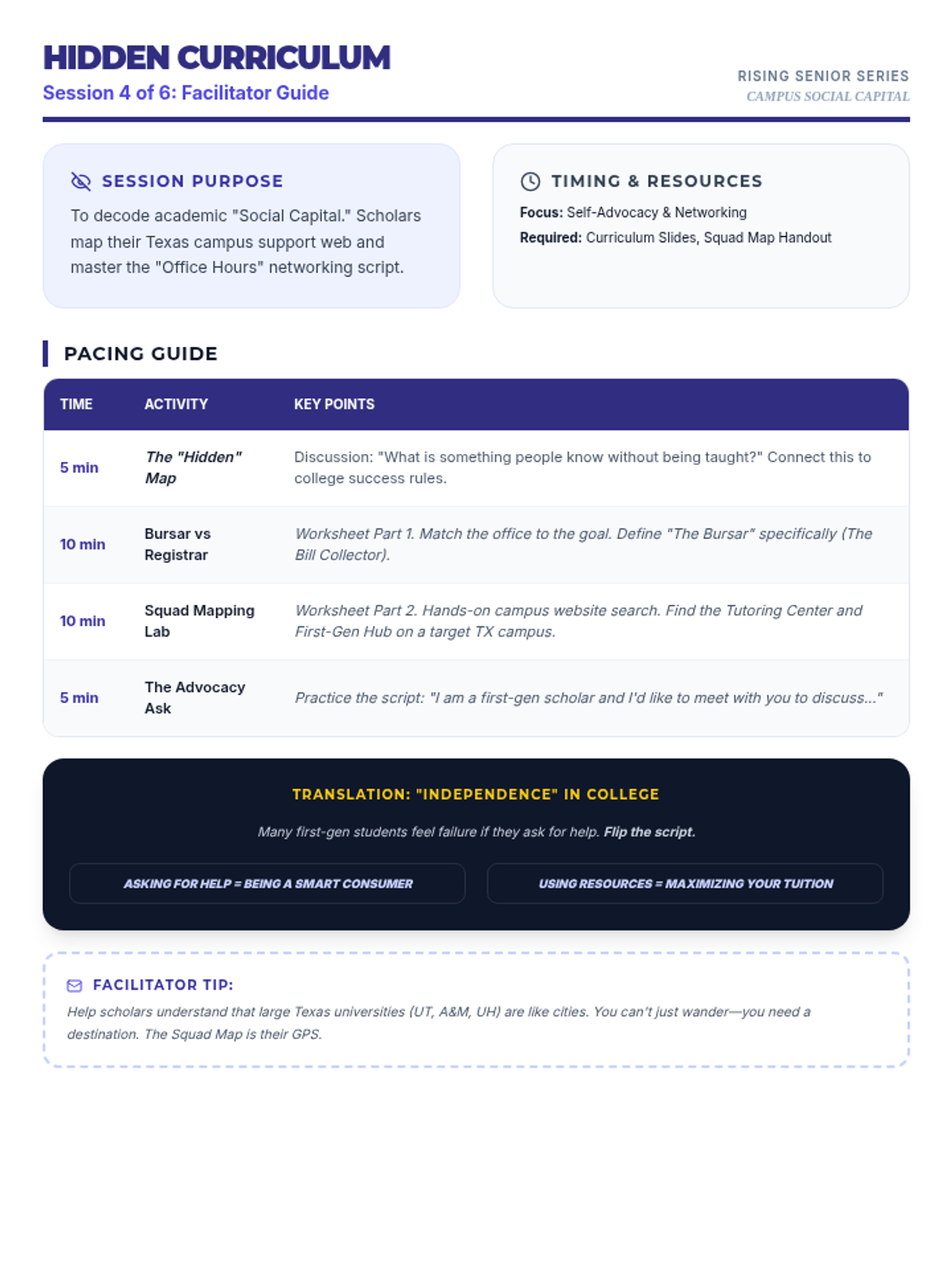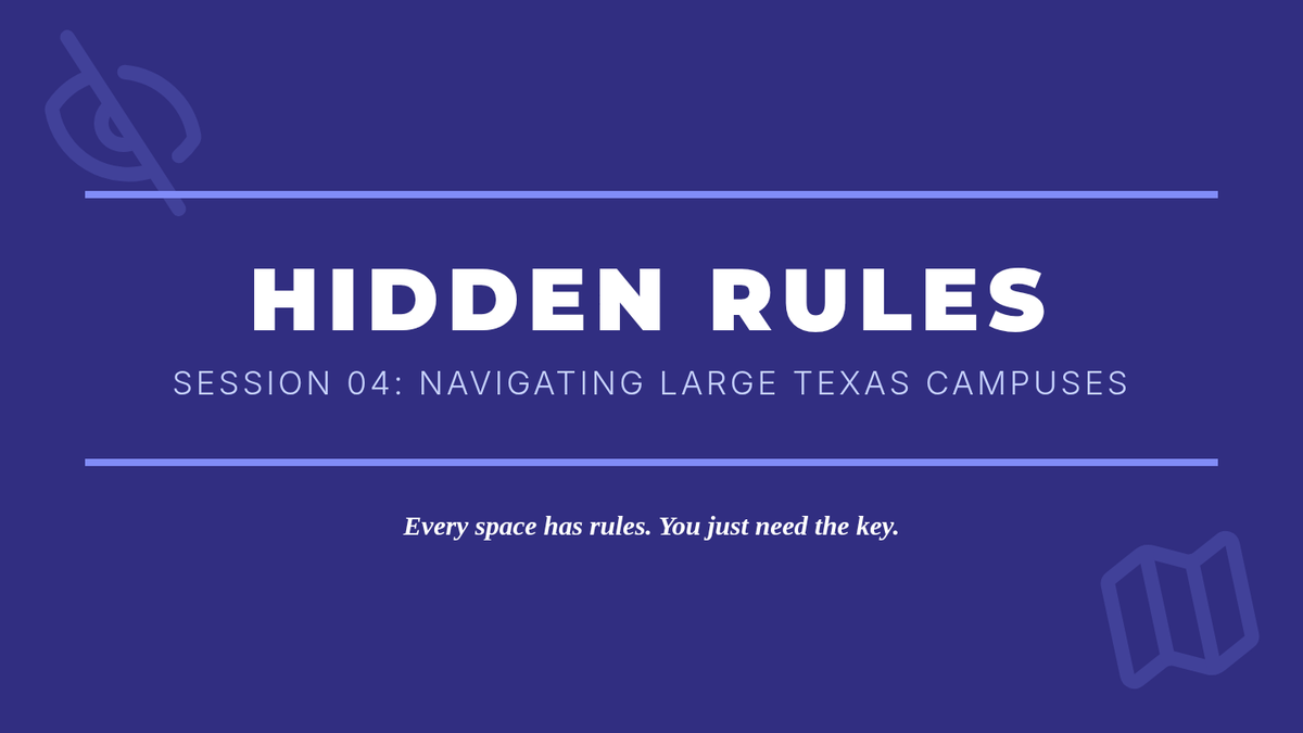 Decoding the social and academic systems of large Texas universities, mapping campus resources, and understanding the 'hidden curriculum' of office hours.