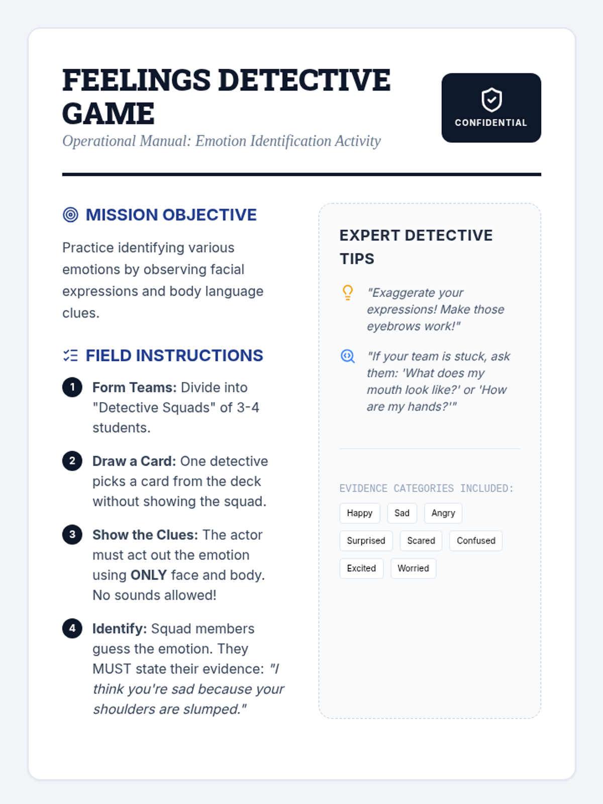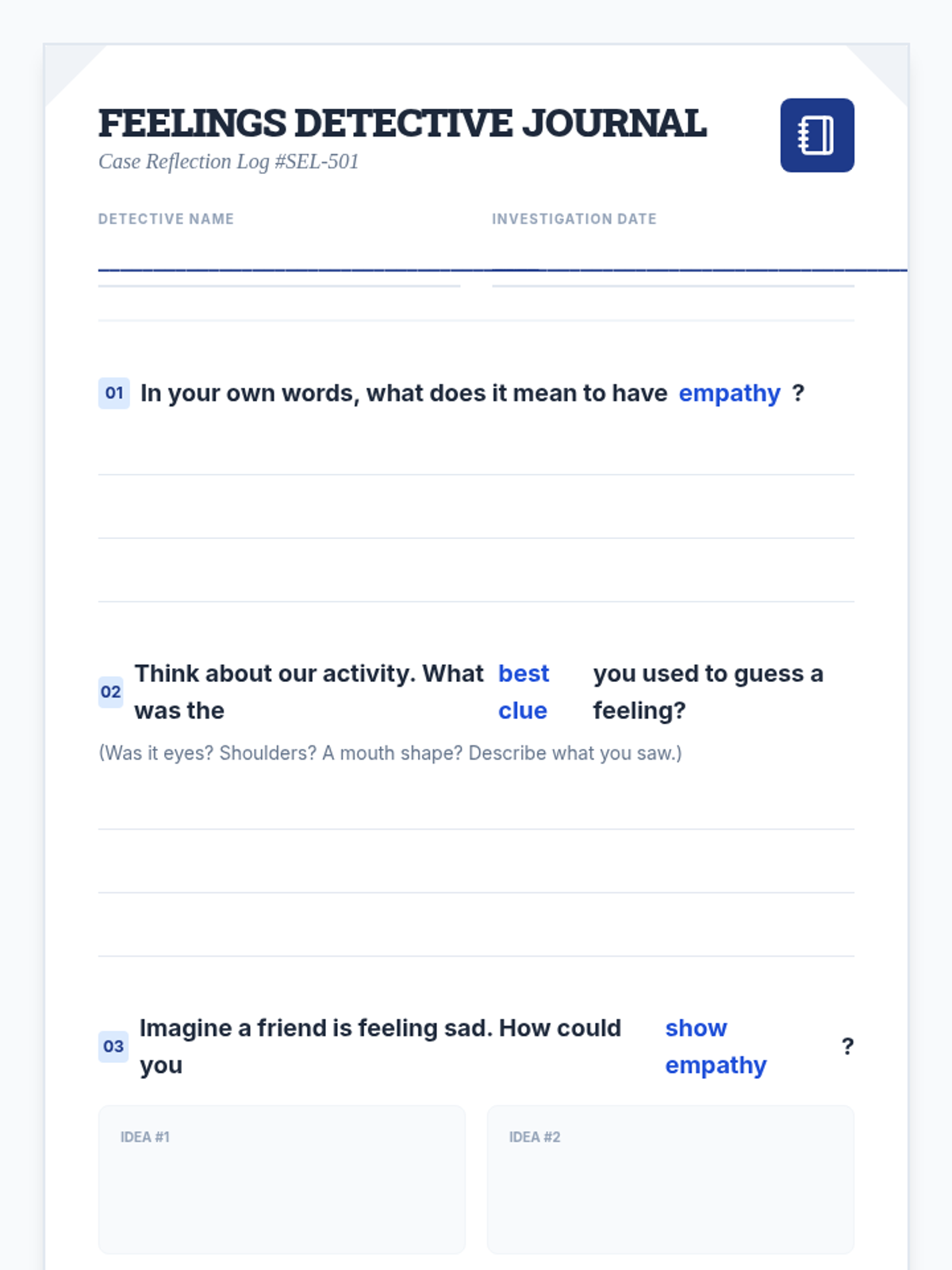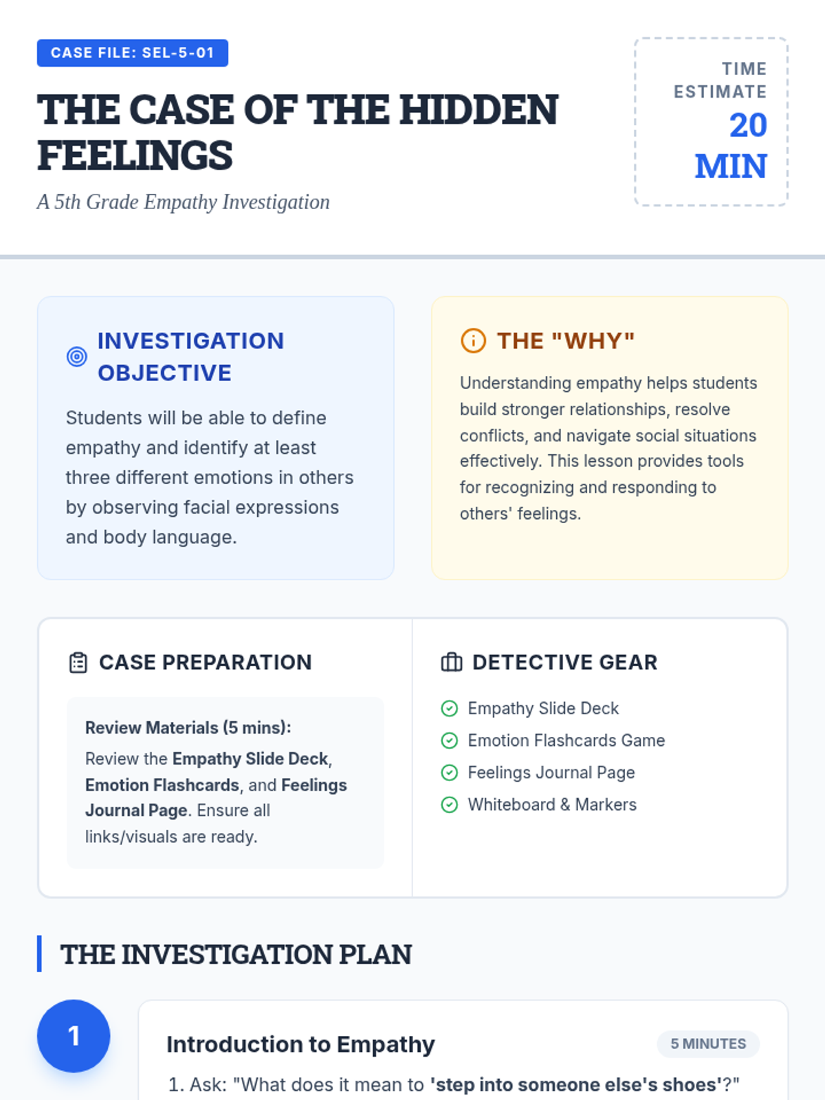 A 20-minute SEL lesson for 5th graders to master empathy by becoming 'feelings detectives,' identifying emotions through facial expressions and body language.
