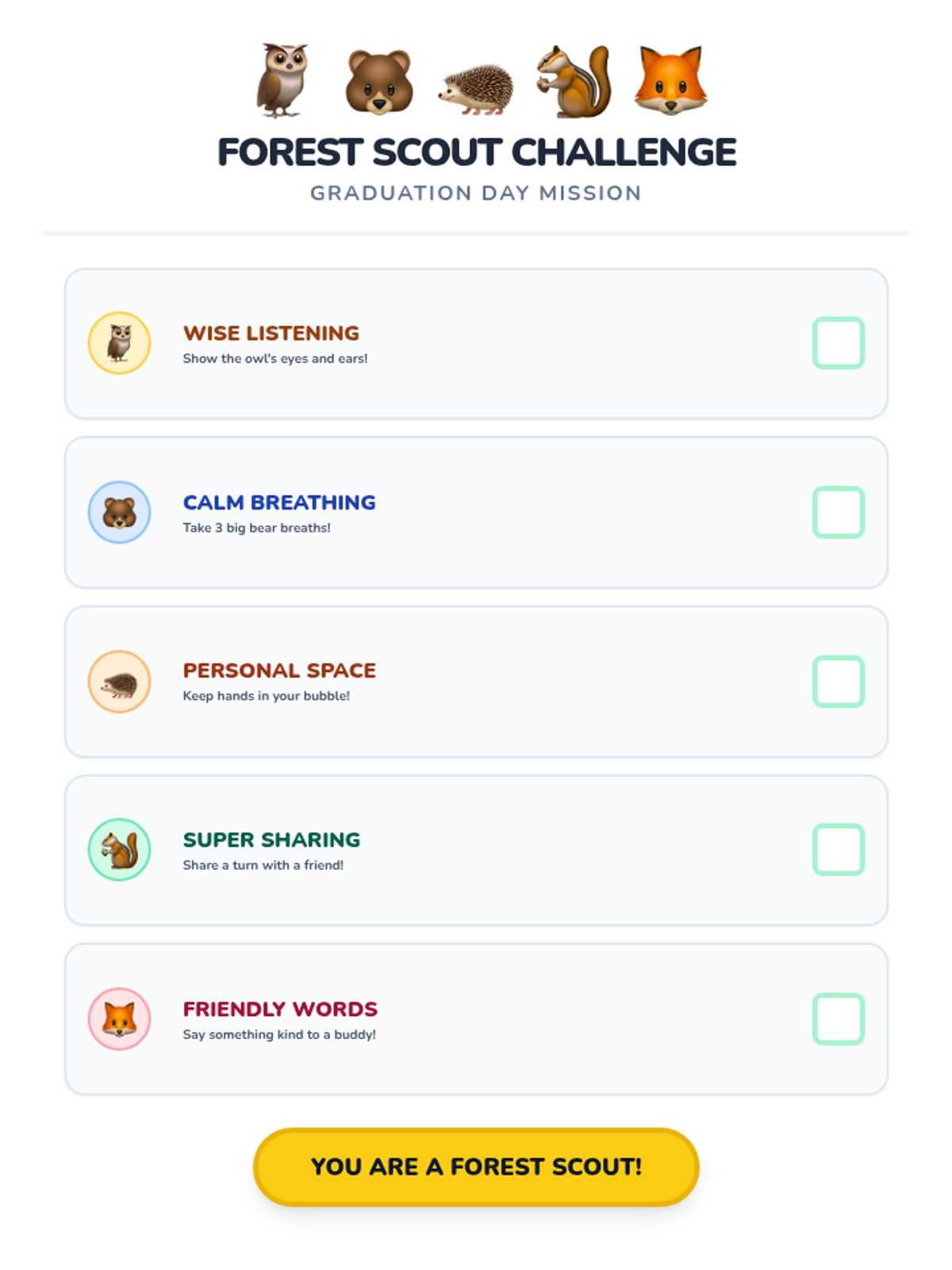 A review of all skills learned in the unit. Students earn their "Forest Scout" status by demonstrating each of the five core skills through a series of fun forest-themed challenges.