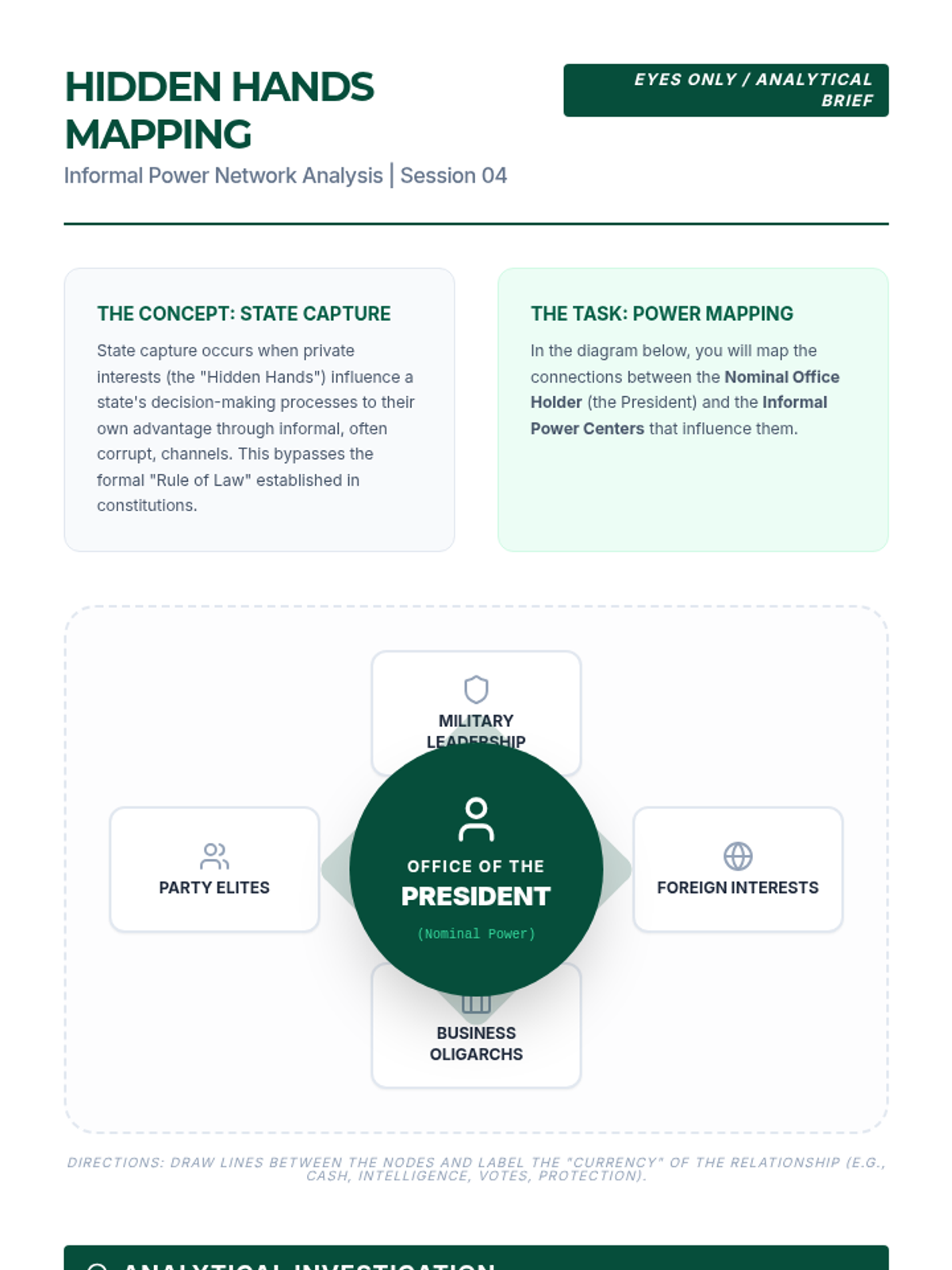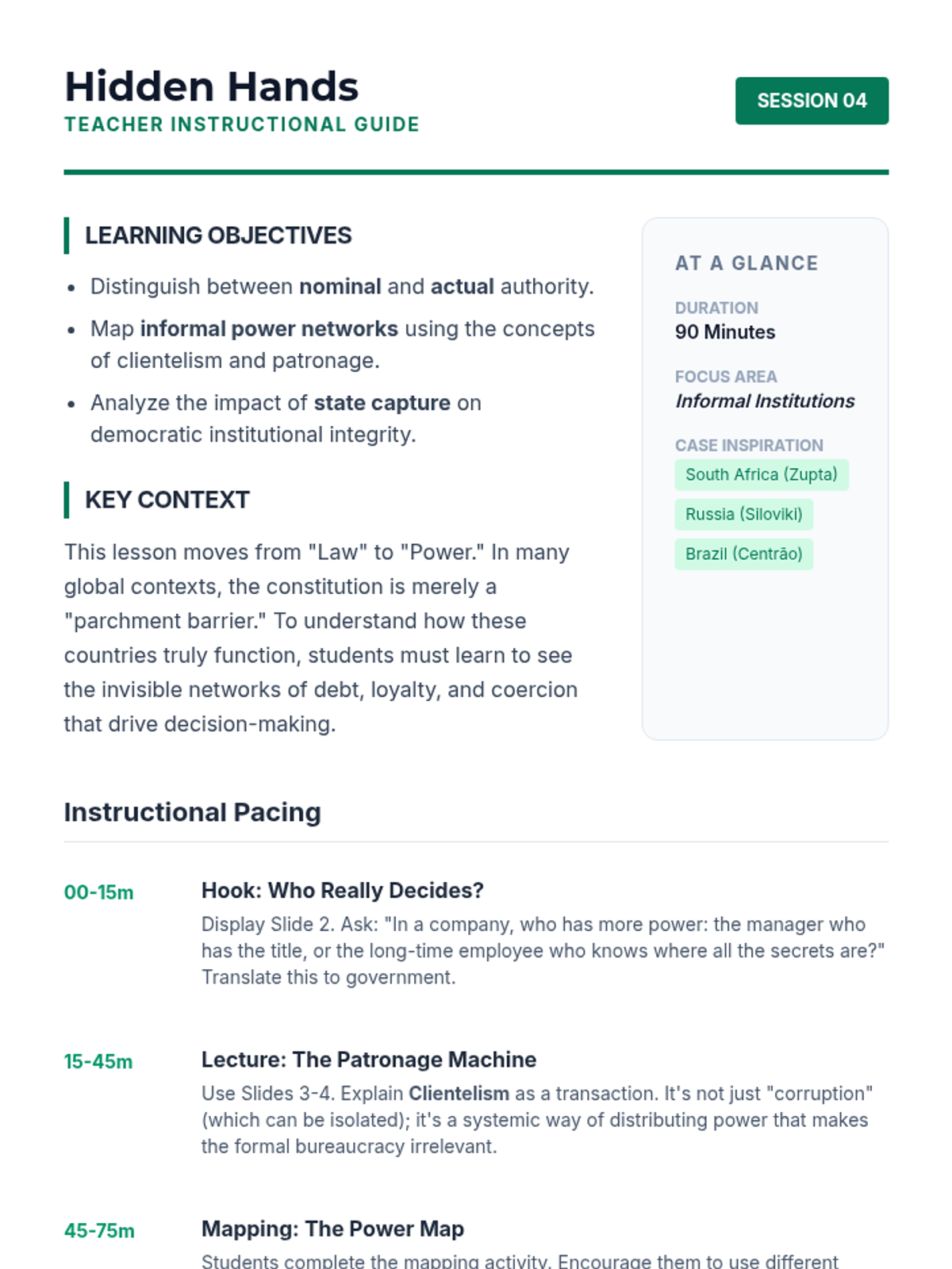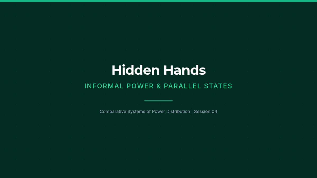 Moves beyond written laws to examine informal power structures, including clientelism, corruption, and elite networks.