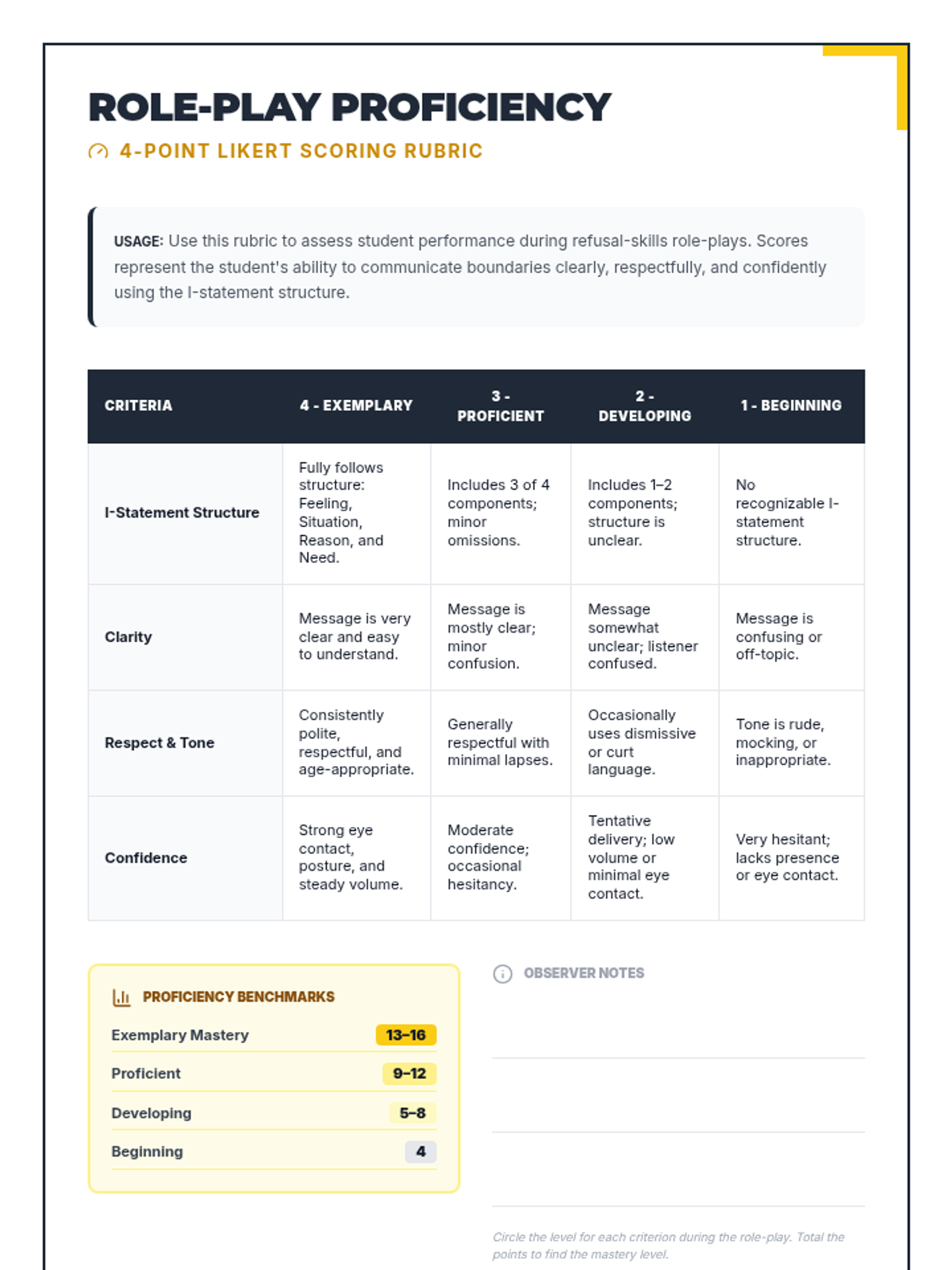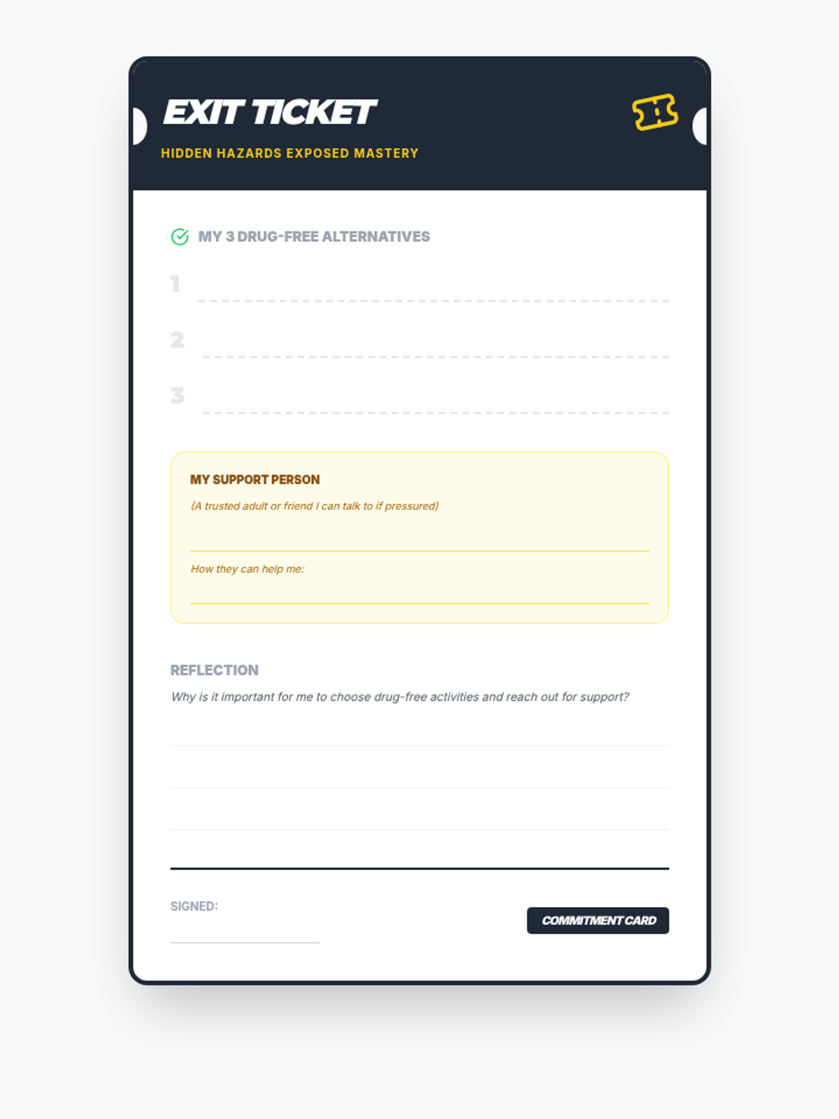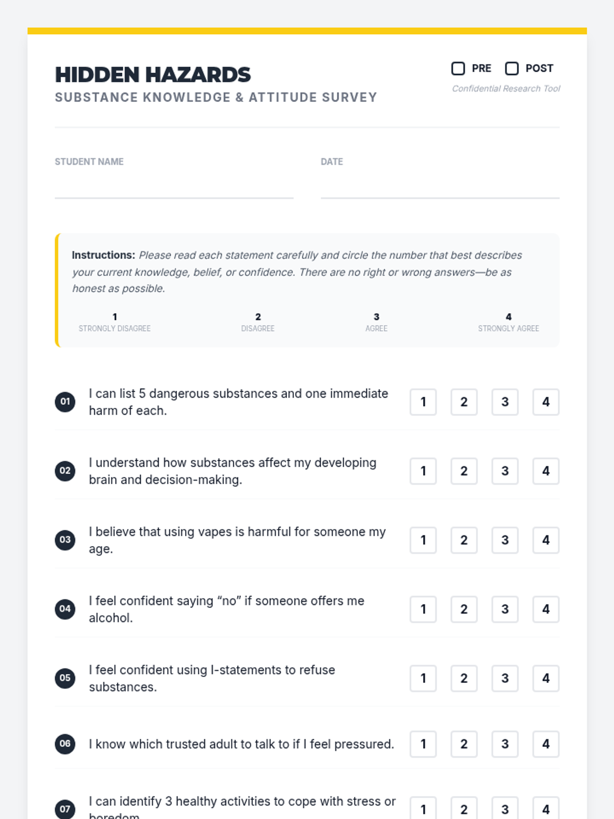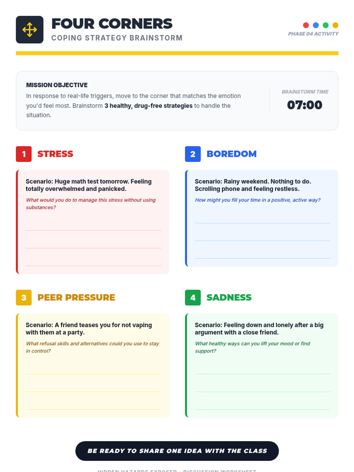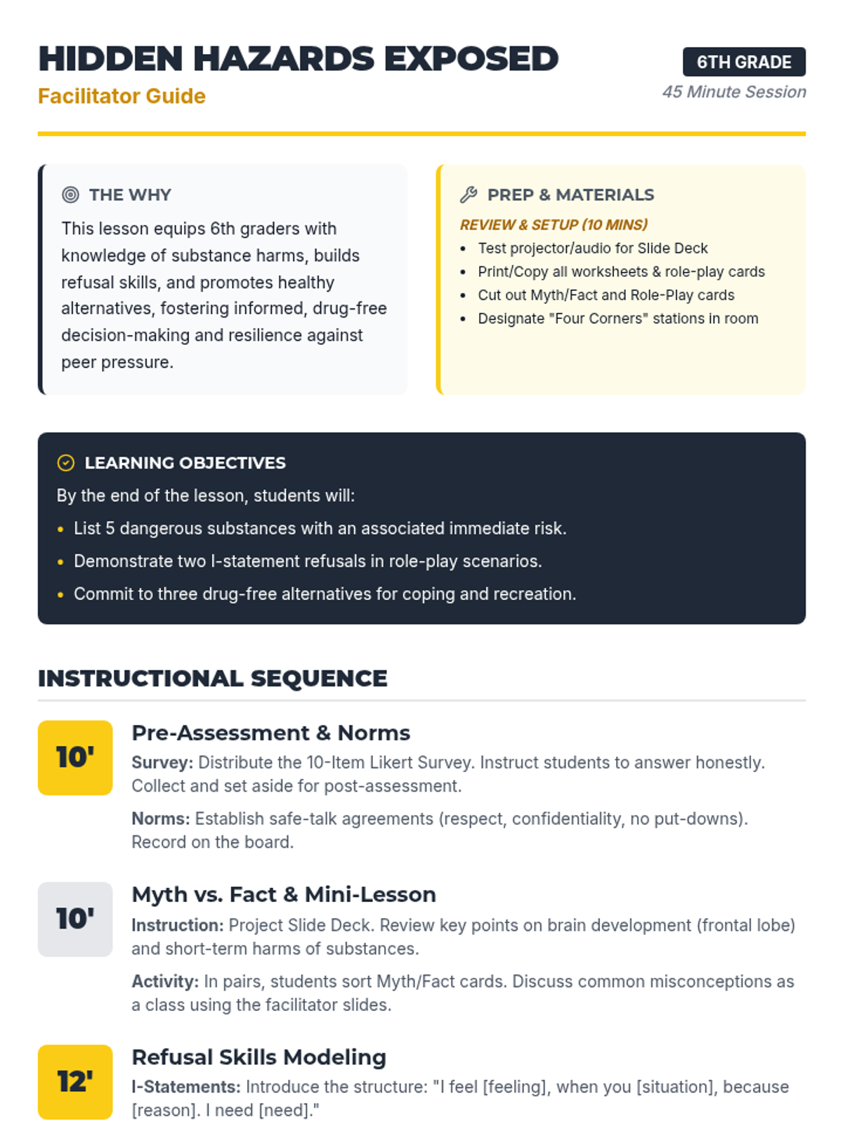A 45-minute 6th grade lesson focused on the harms of substances, building refusal skills through I-statements, and committing to healthy alternatives. Students use role-play, surveys, and sorting activities to uncover 'hidden hazards' to their developing brains.