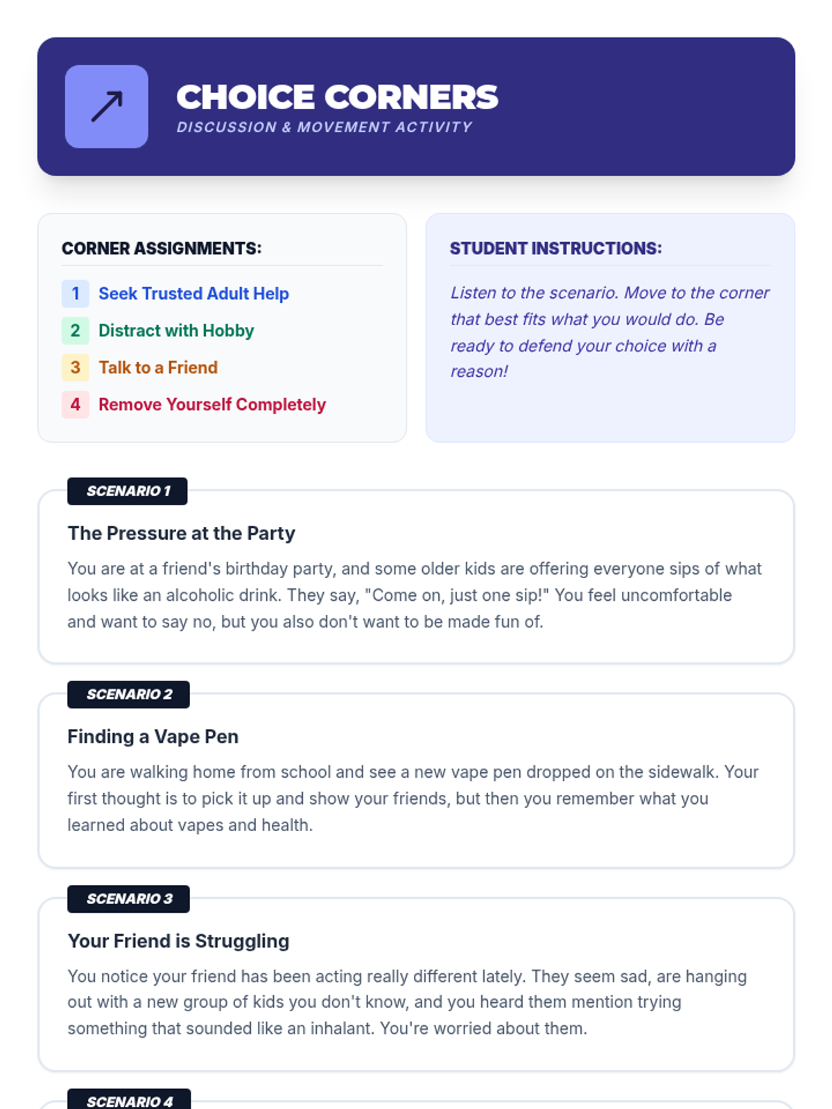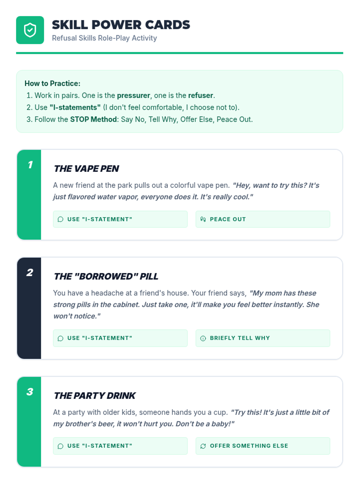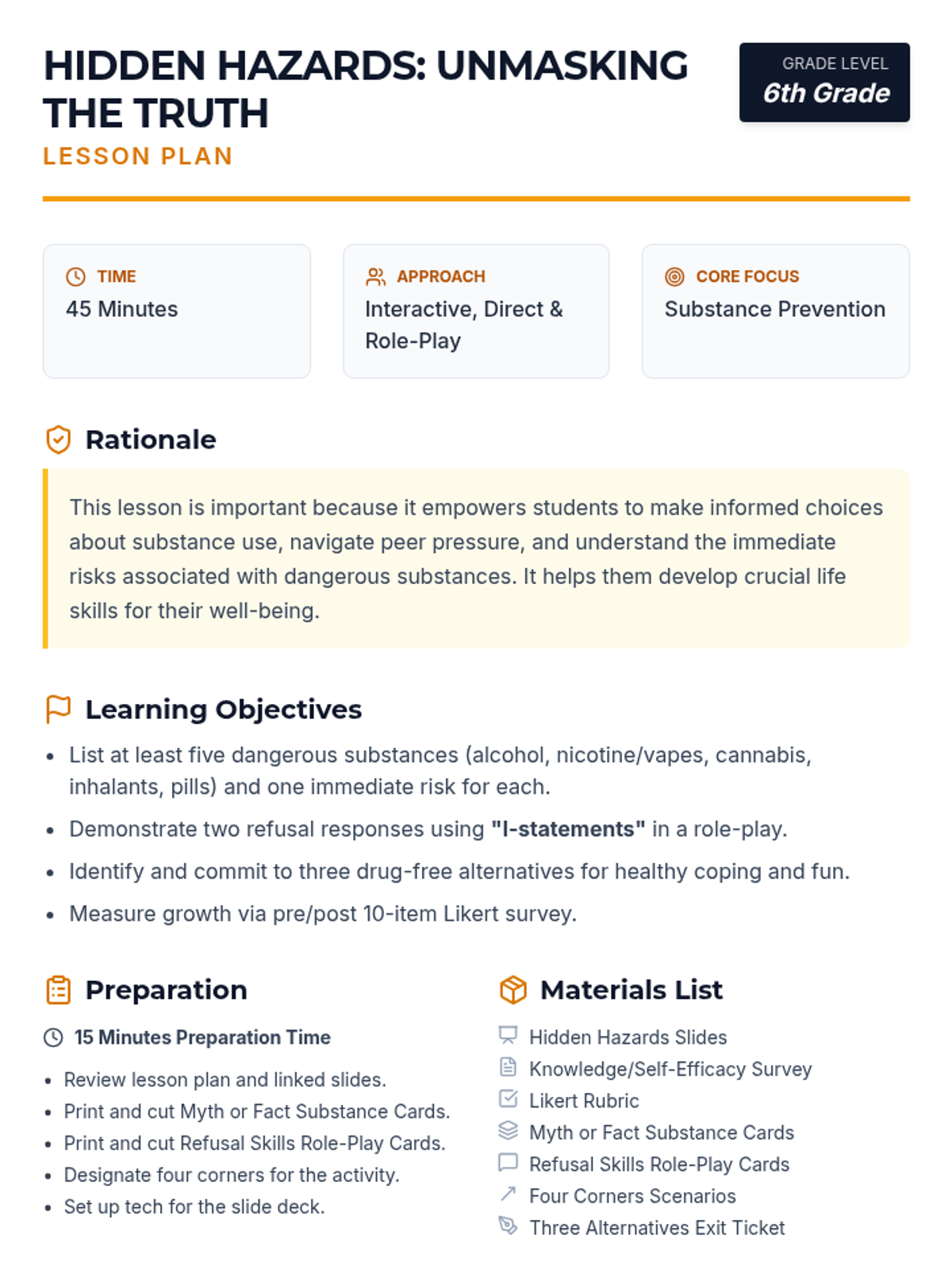 This 45-minute 6th-grade lesson empowers students to understand the immediate risks of dangerous substances and develop practical refusal skills using 'I-statements'. Through interactive myth-busting, role-play, and scenario-based discussion, students learn to navigate peer pressure and commit to healthy, drug-free alternatives.