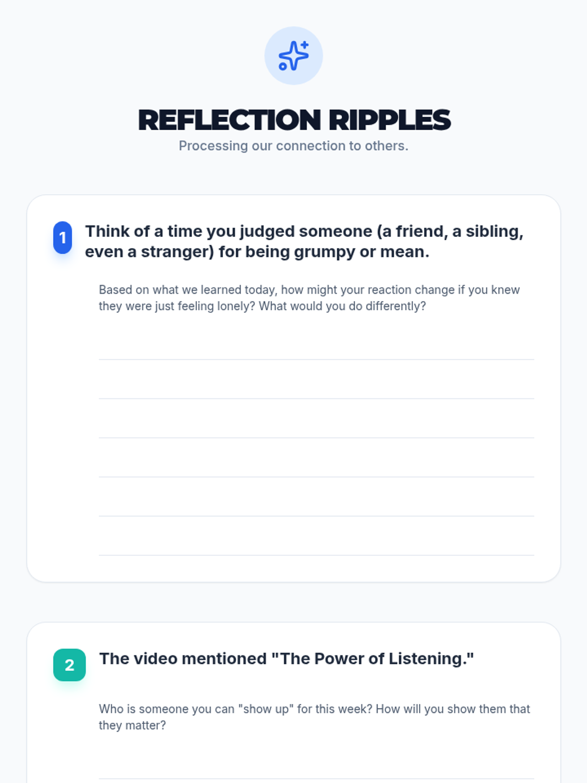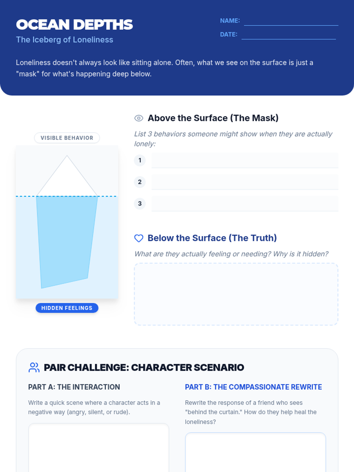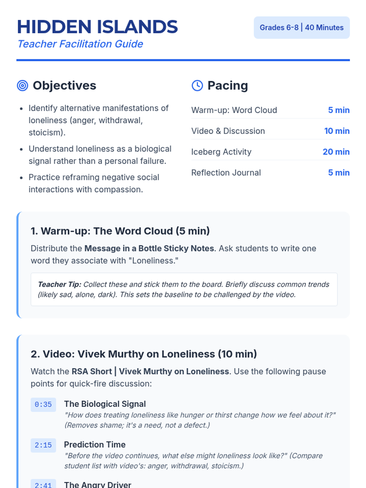 A lesson that challenges middle schoolers to look beyond 'bad behavior' like anger or withdrawal to see loneliness as a biological signal, featuring the RSA Short with Vivek Murthy.