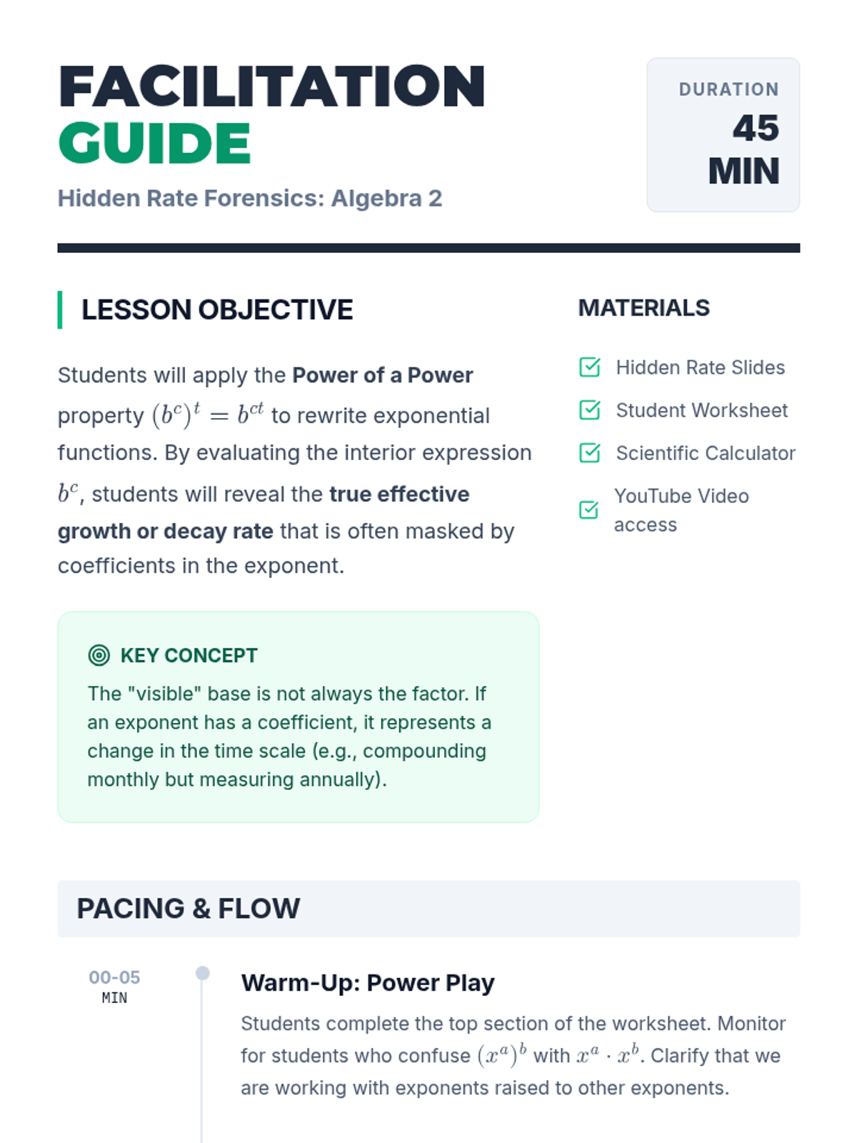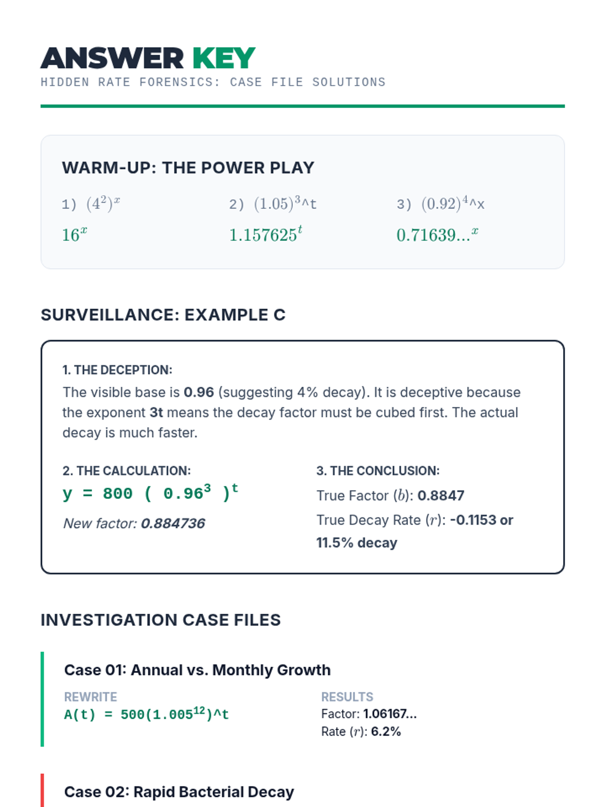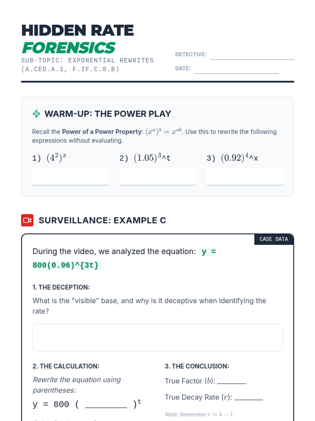 A lesson for Algebra 2 students on rewriting exponential expressions with coefficients in the exponent to reveal the effective growth or decay rate using the Power of a Power property.